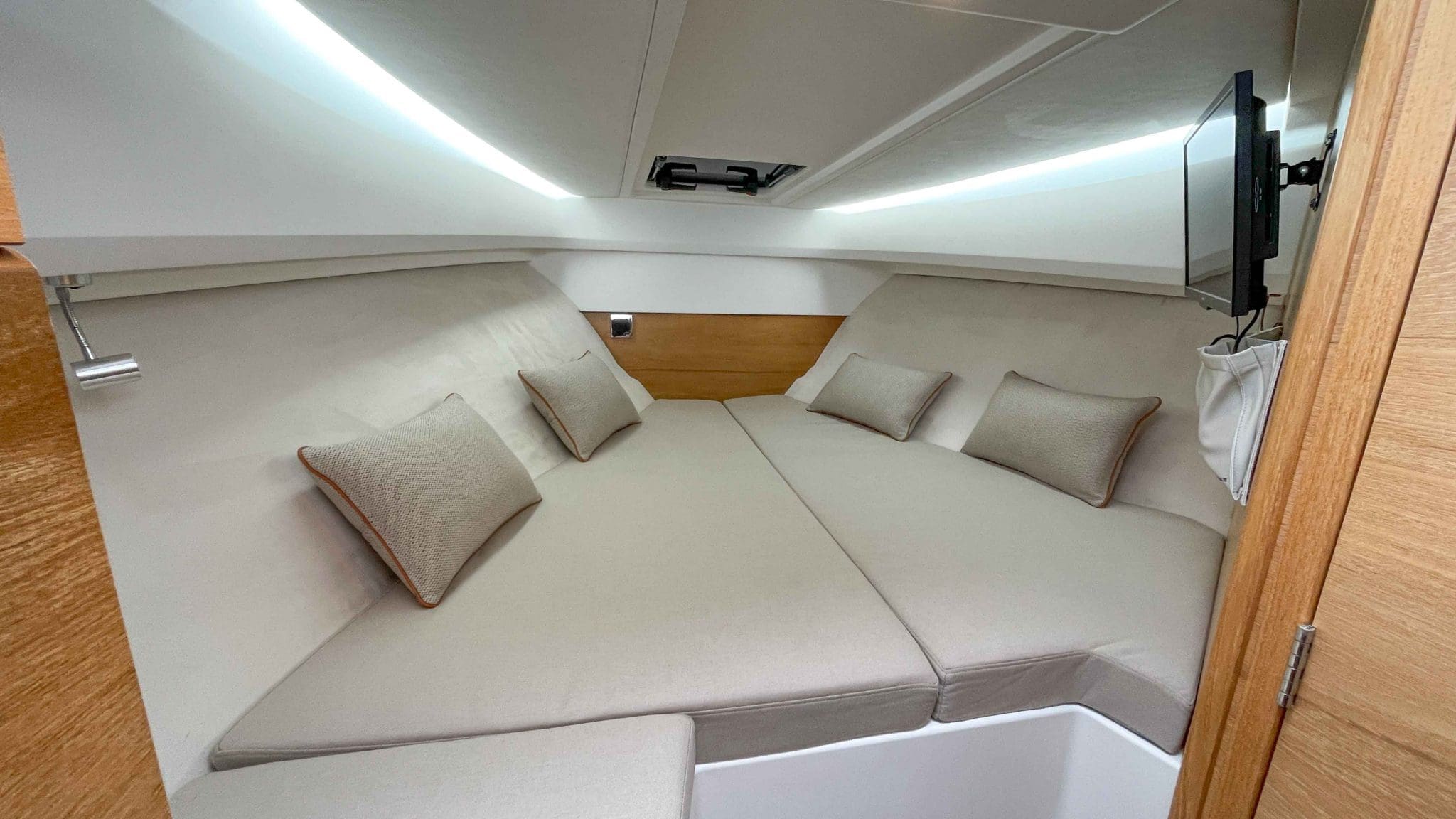 The bow design is new and is the result of a desire to draw out the water line as far as possible to achieve the desired cruising characteristics. The bow angle facilitates an integrated front anchor winch and reduces the risk of collision when docking on rocks.