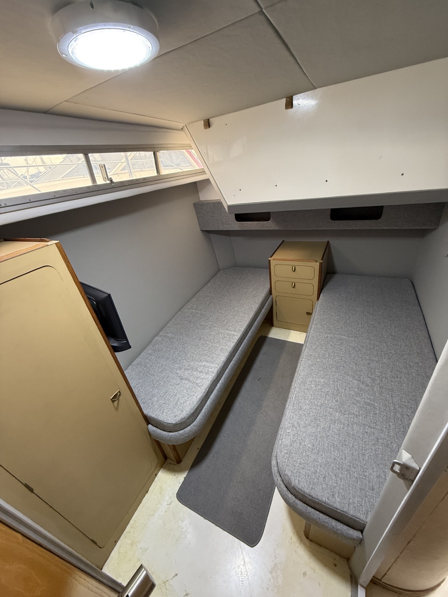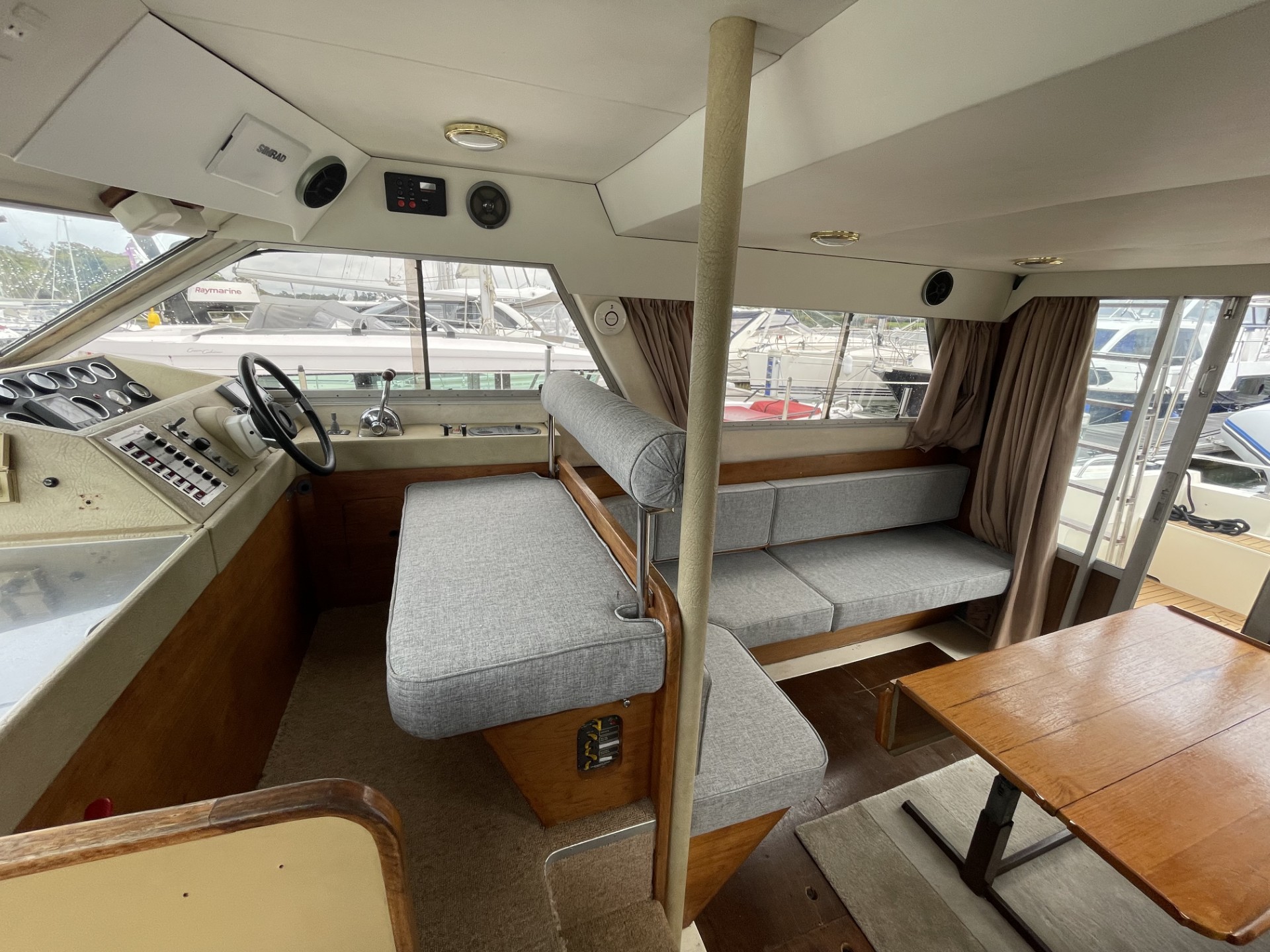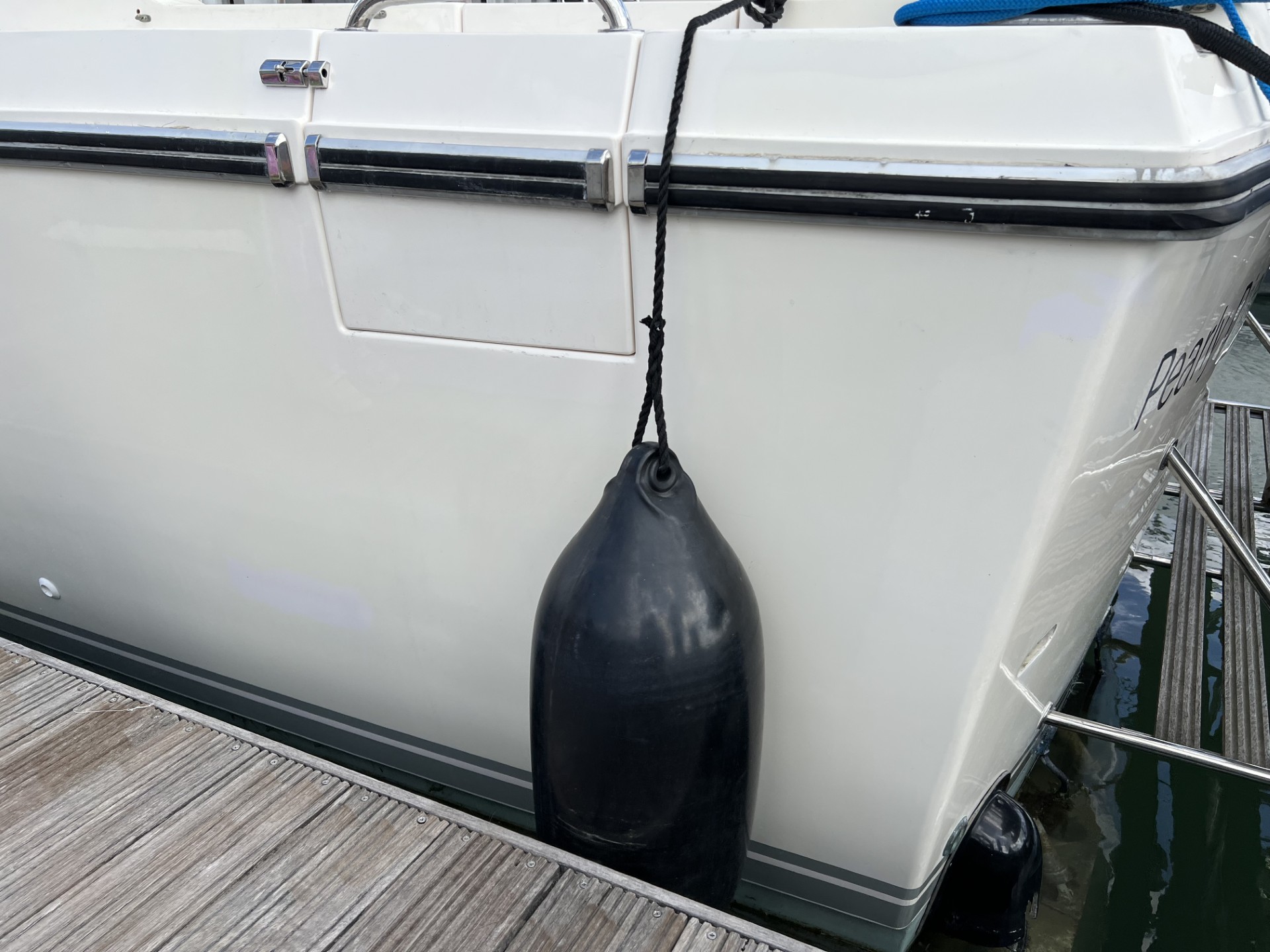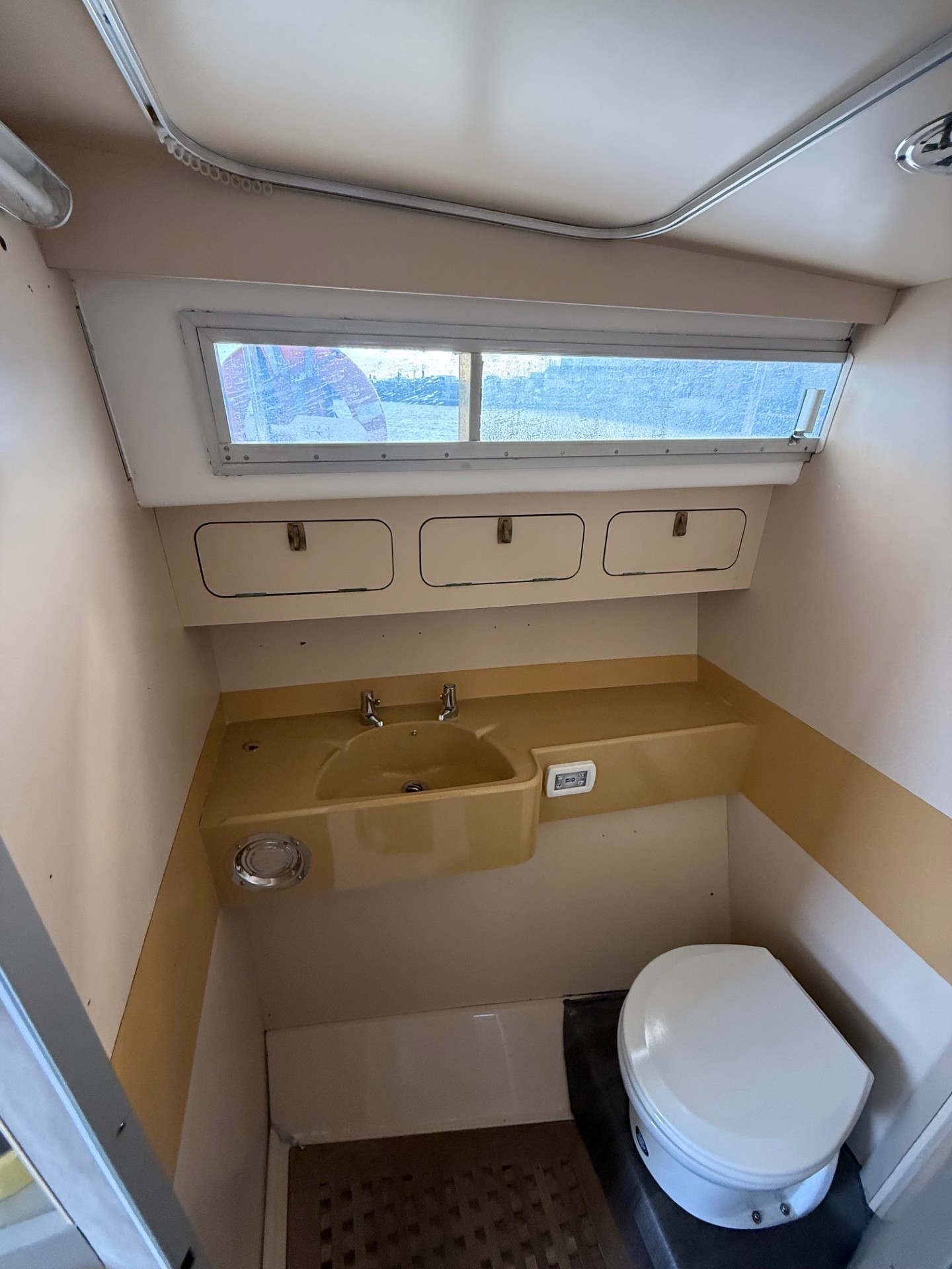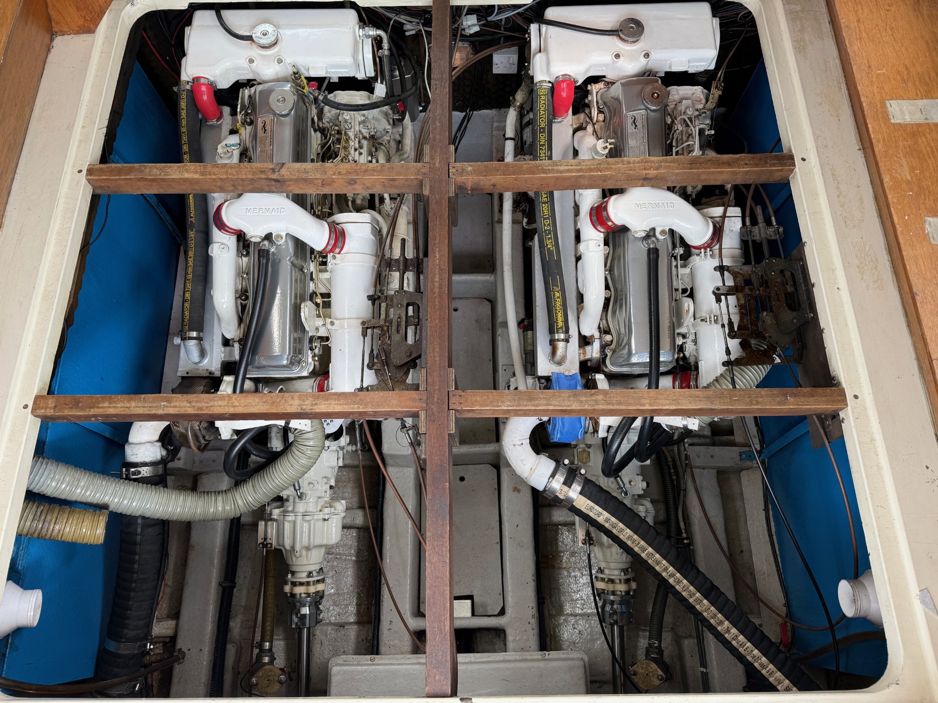 Extremely comfortable and tasteful accommodation for seven is provided by an elegant berthed private forward stateroom (with access to own shower suite), a stateroom on the starboard side containing two full lengths single berths and a spacious deck saloon with ‘L’ shaped settee that converts to a double berth, a settee to port that makes a single berth and a helm and navigators position with excellent all-round visibility. By opening the sliding doors aft the deck saloon and cockpit become one spacious area for open style living or entertaining.