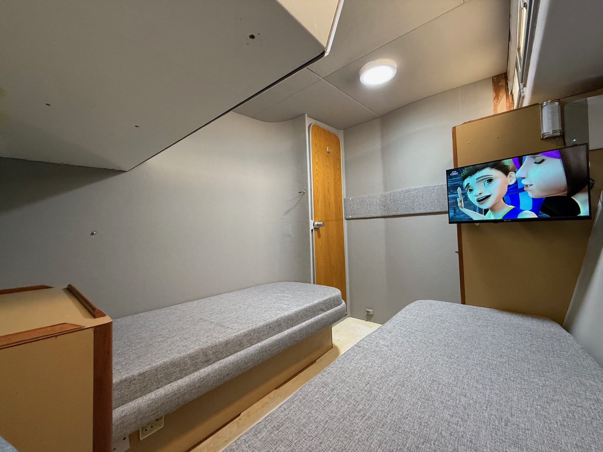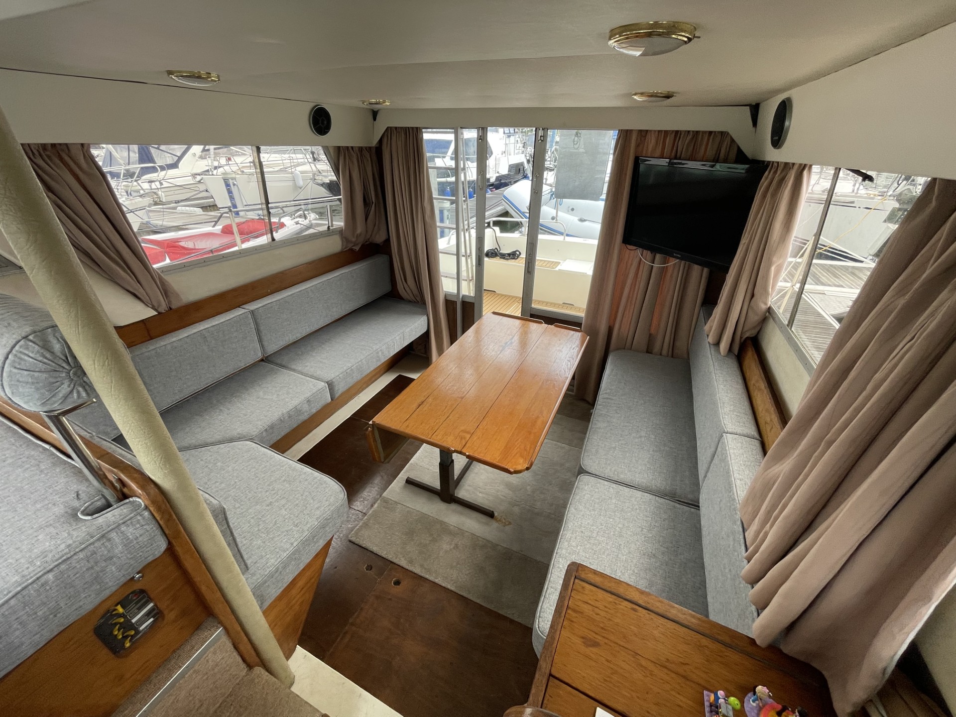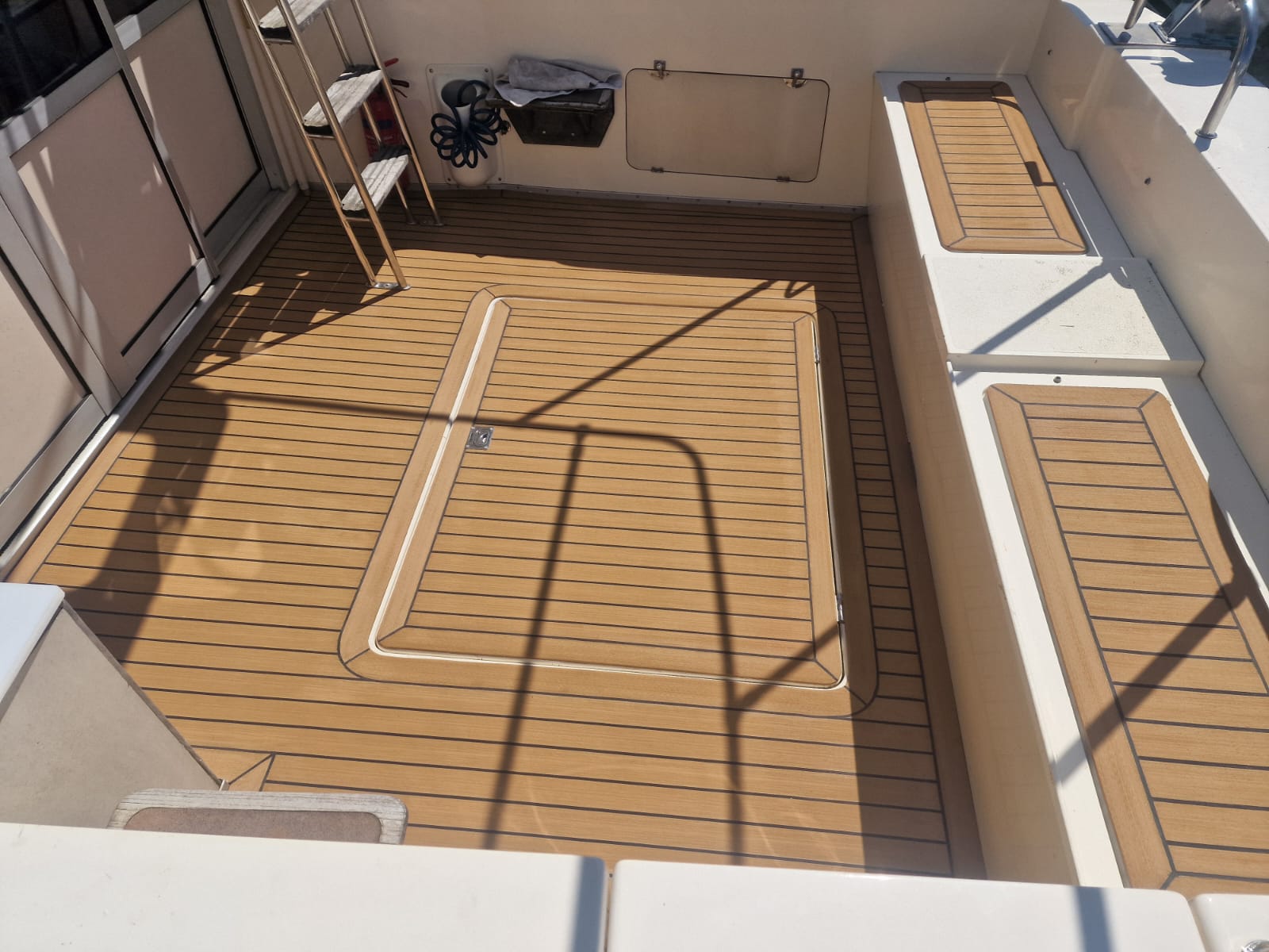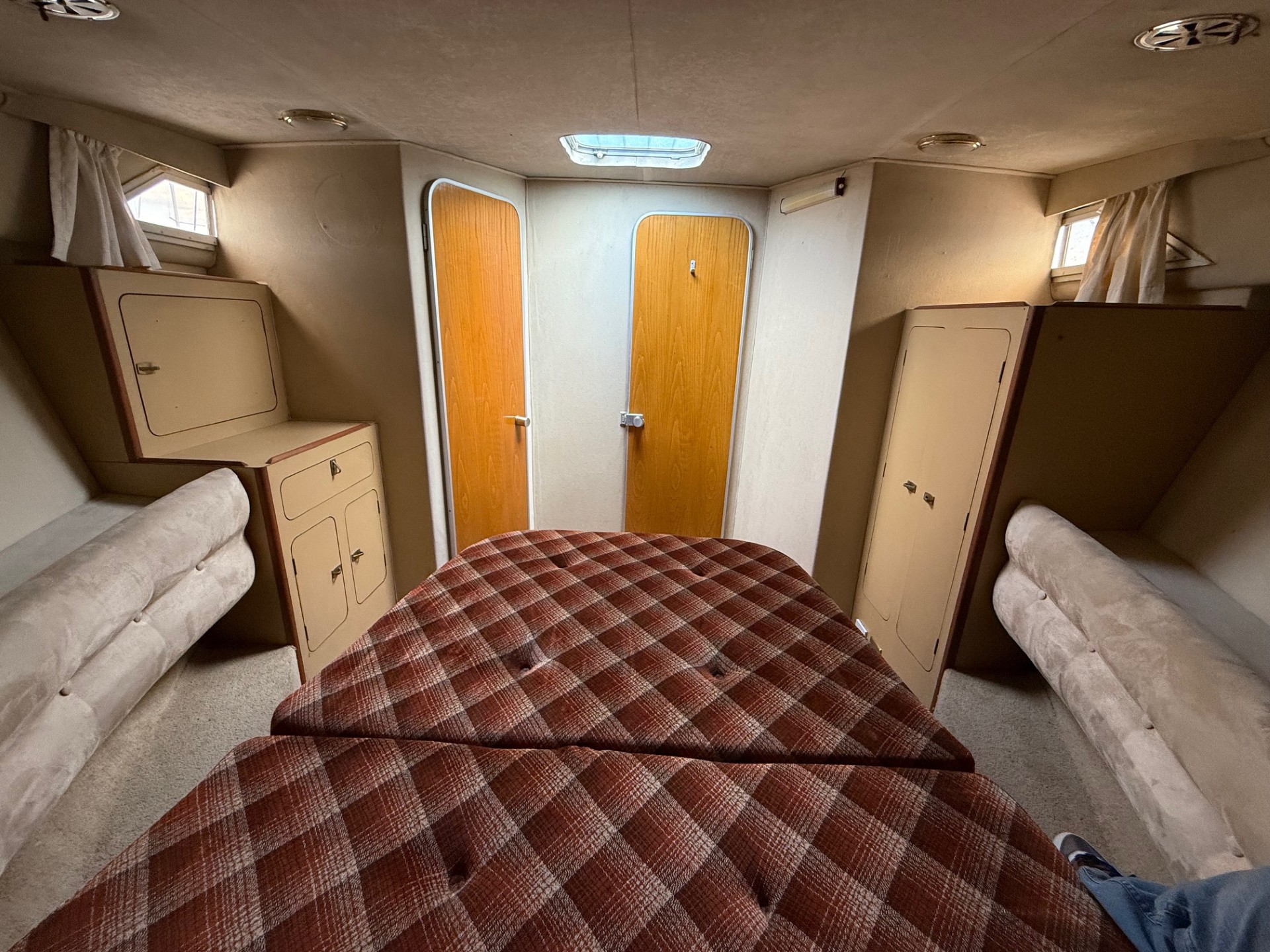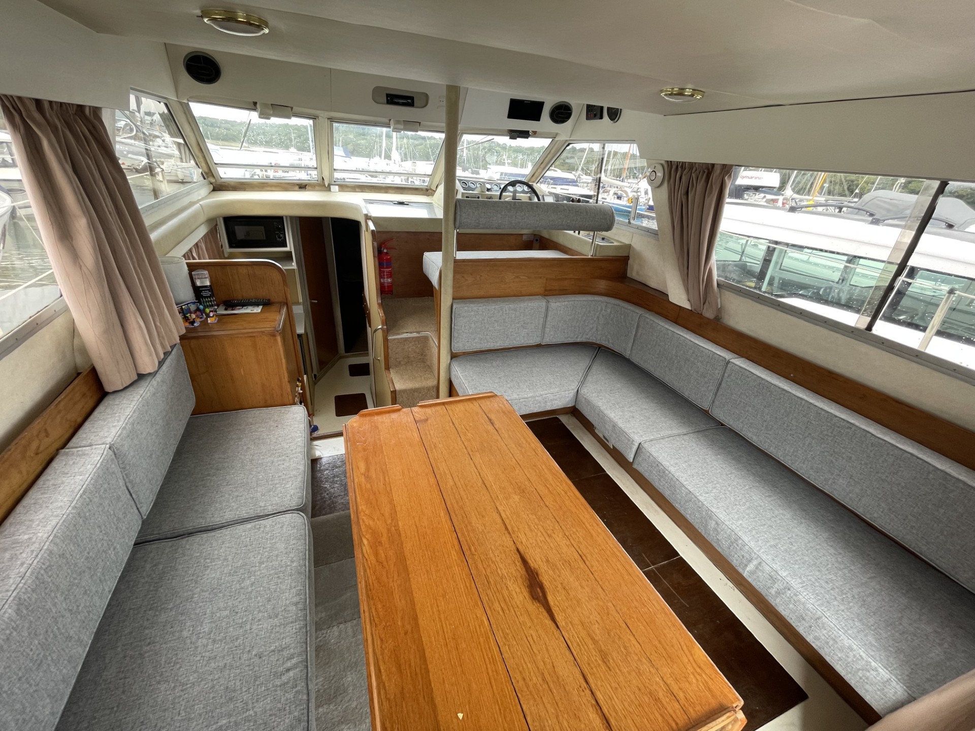 Extremely comfortable and tasteful accommodation for seven is provided by an elegant berthed private forward stateroom (with access to own shower suite), a stateroom on the starboard side containing two full lengths single berths and a spacious deck saloon with ‘L’ shaped settee that converts to a double berth, a settee to port that makes a single berth and a helm and navigators position with excellent all-round visibility. By opening the sliding doors aft the deck saloon and cockpit become one spacious area for open style living or entertaining.