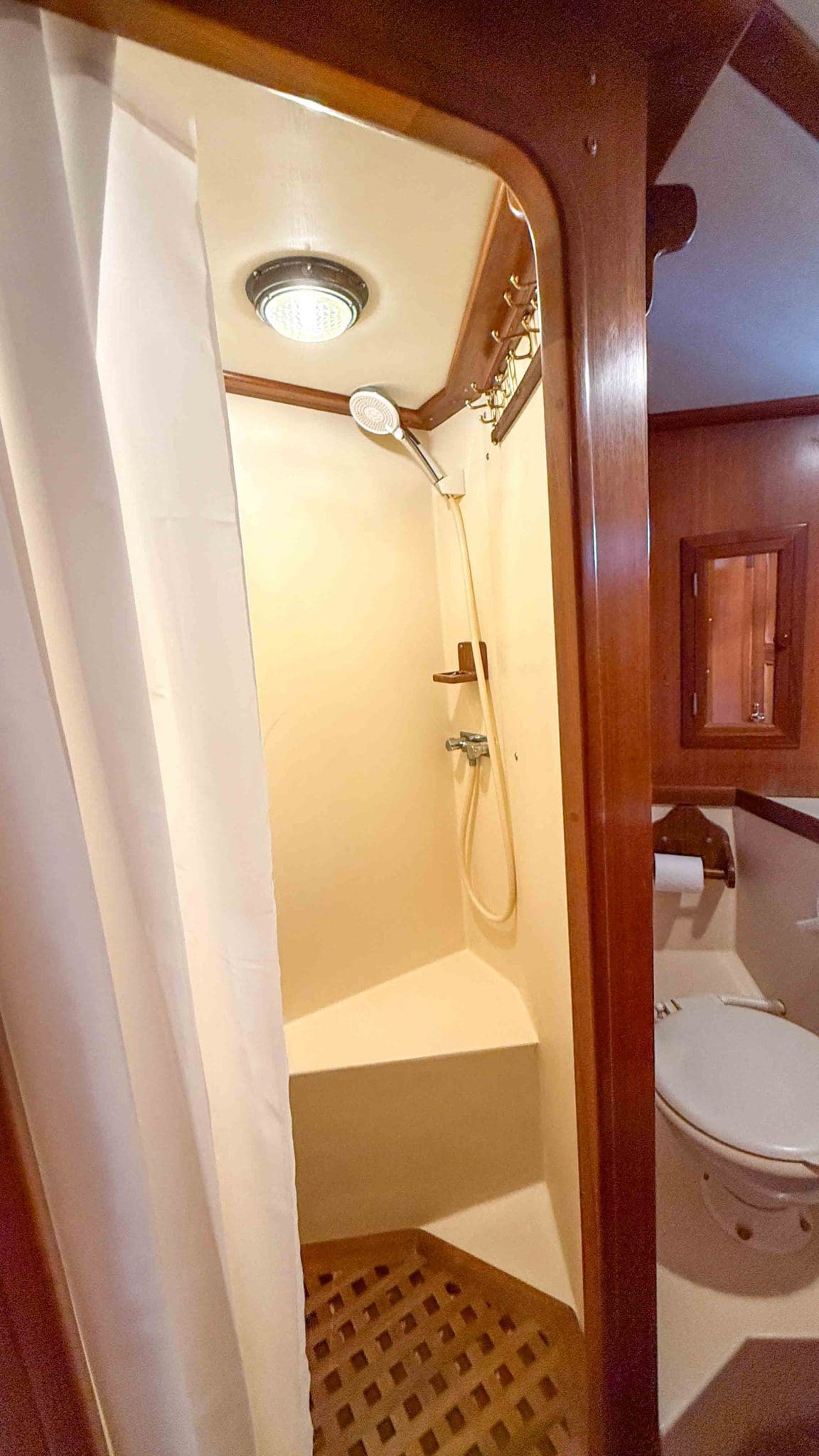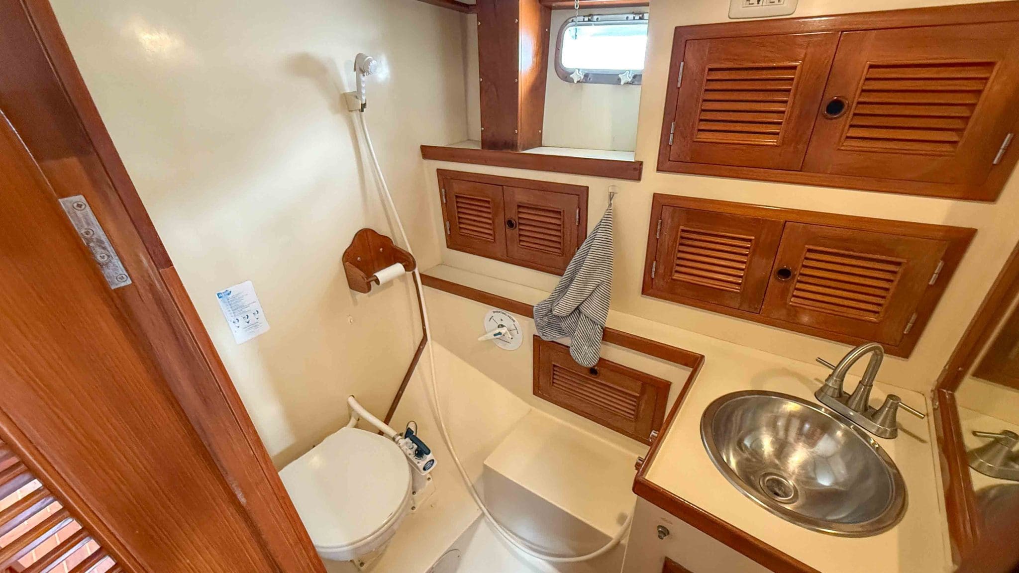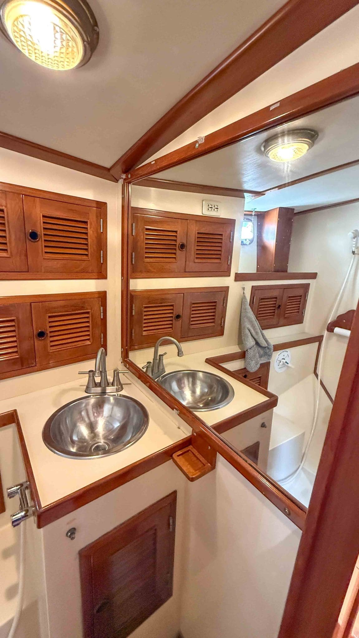 Heads to starboard with stainless steel basin, shower unit and mirror.