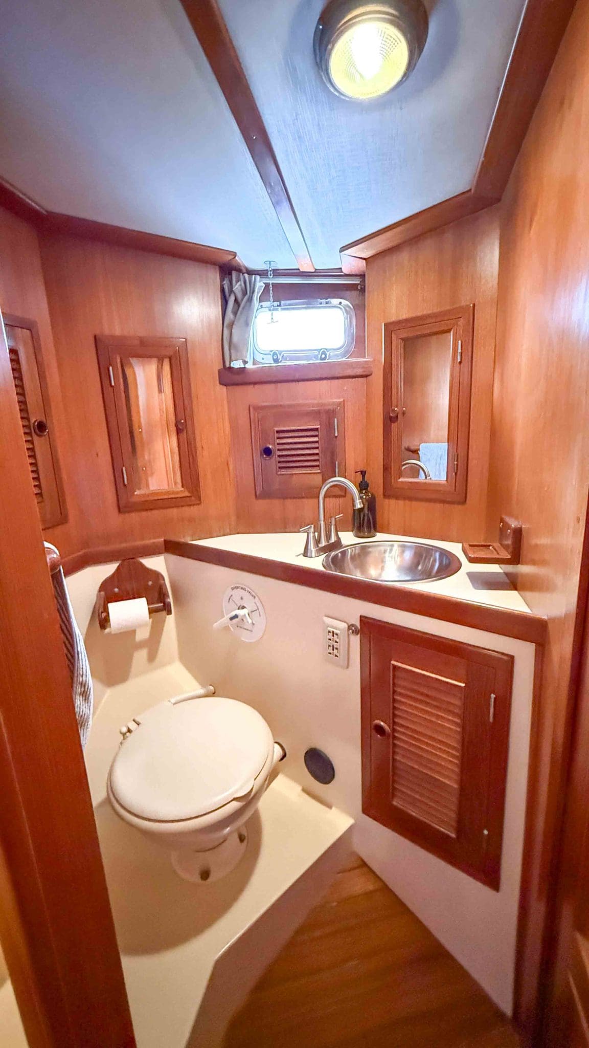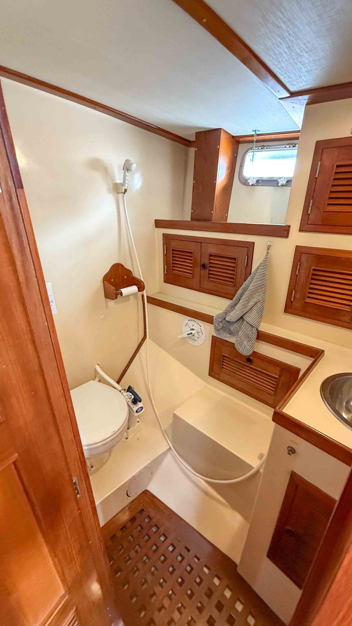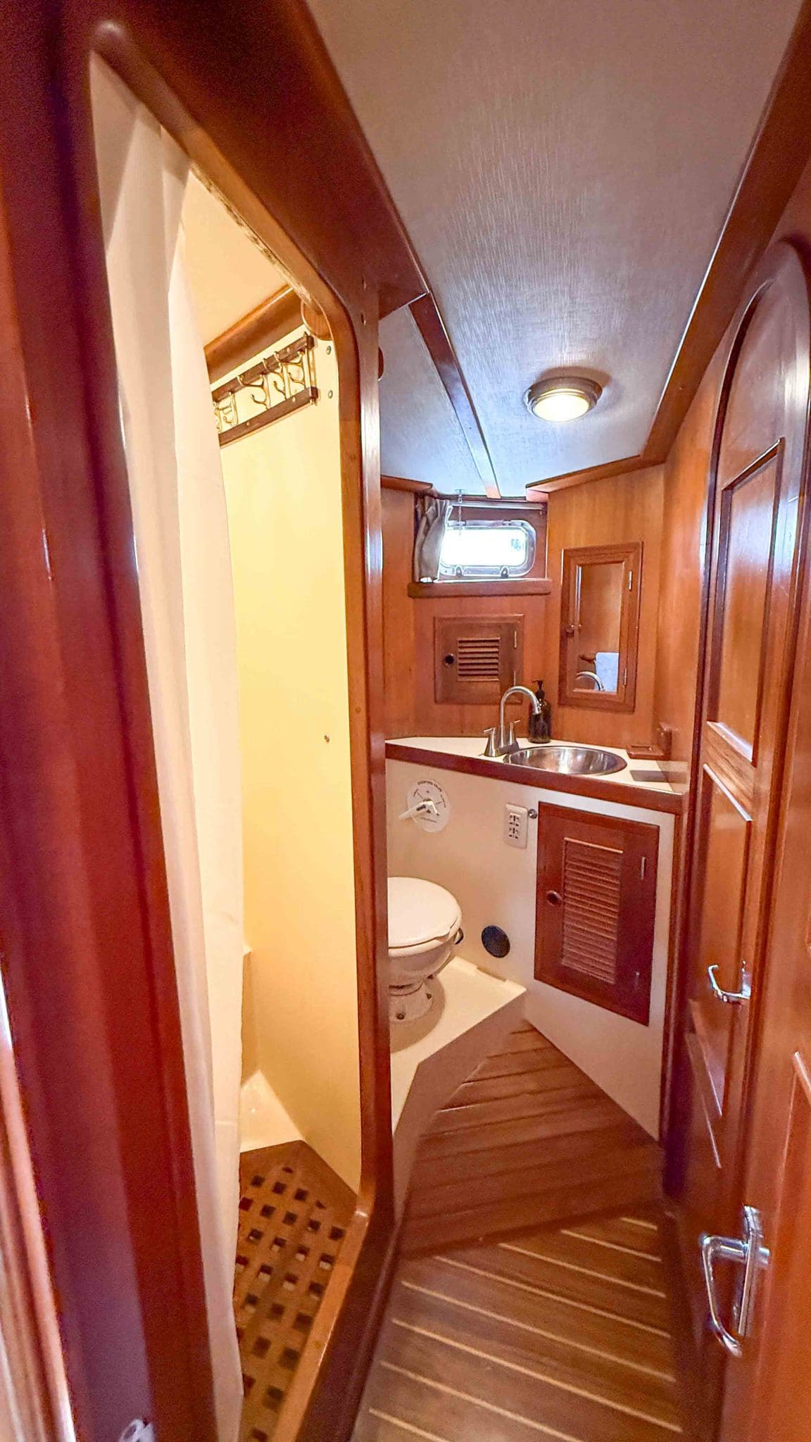 Heads to starboard with stainless steel basin, shower unit and mirror.