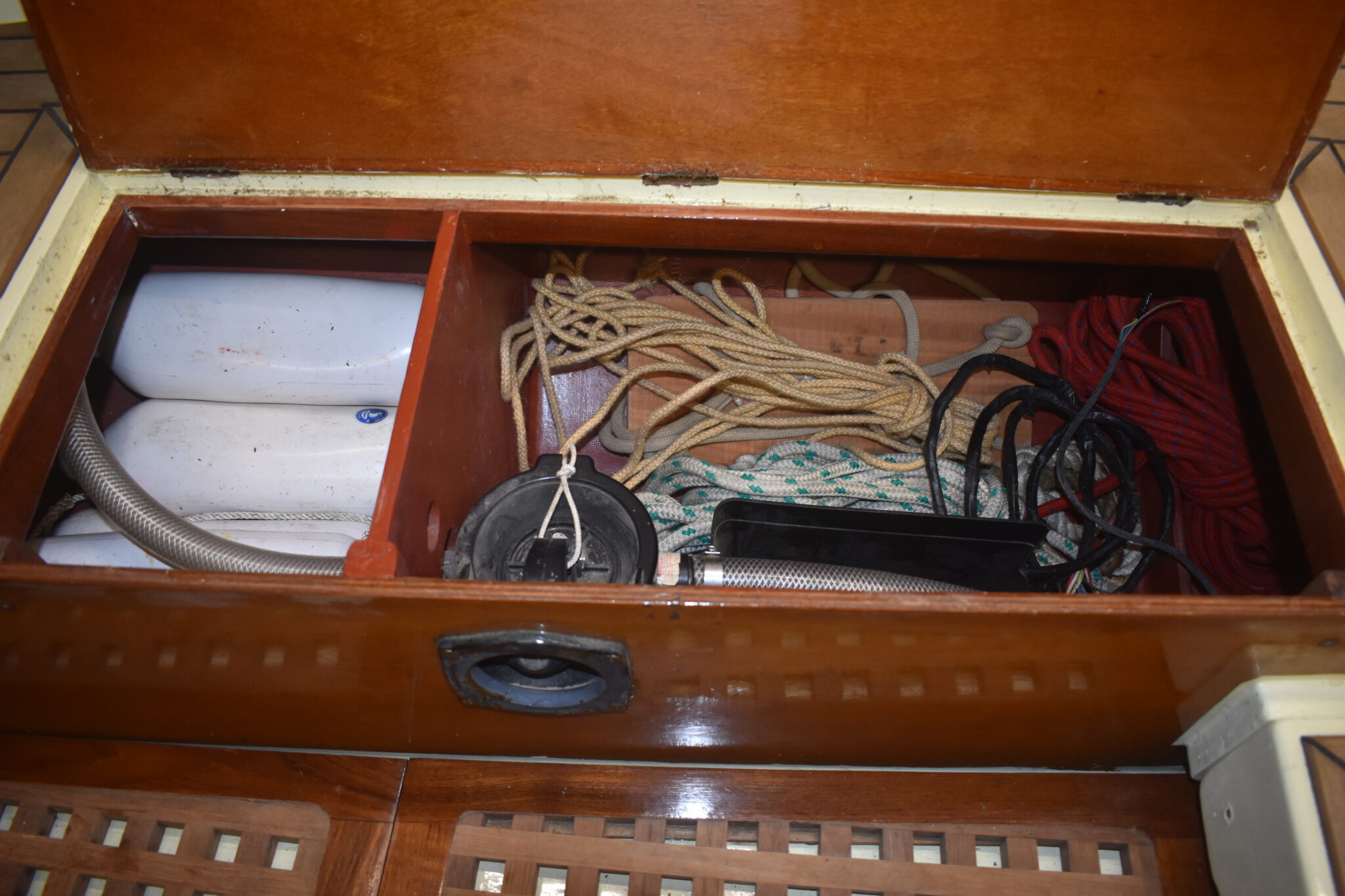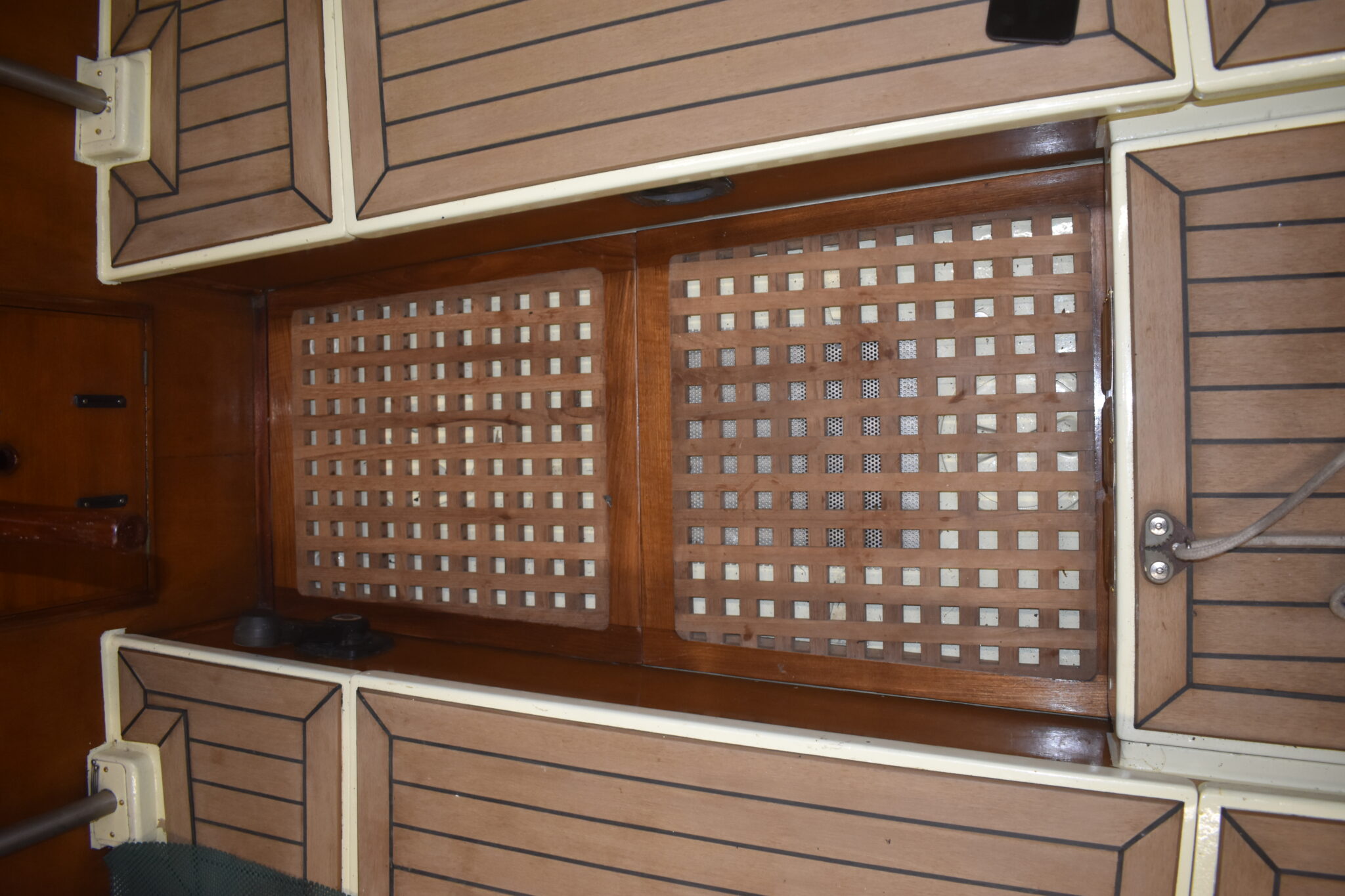 During her current ownership, the boat has been stored in a large heated shed. In 2019, Symon Wood & Son Boat Builders in Lymington undertook extensive restoration work, which included a full repaint of the topsides, new varnish, a reconditioned engine and running gear, along with a new composite swept deck and a reconfiguration of the cockpit.