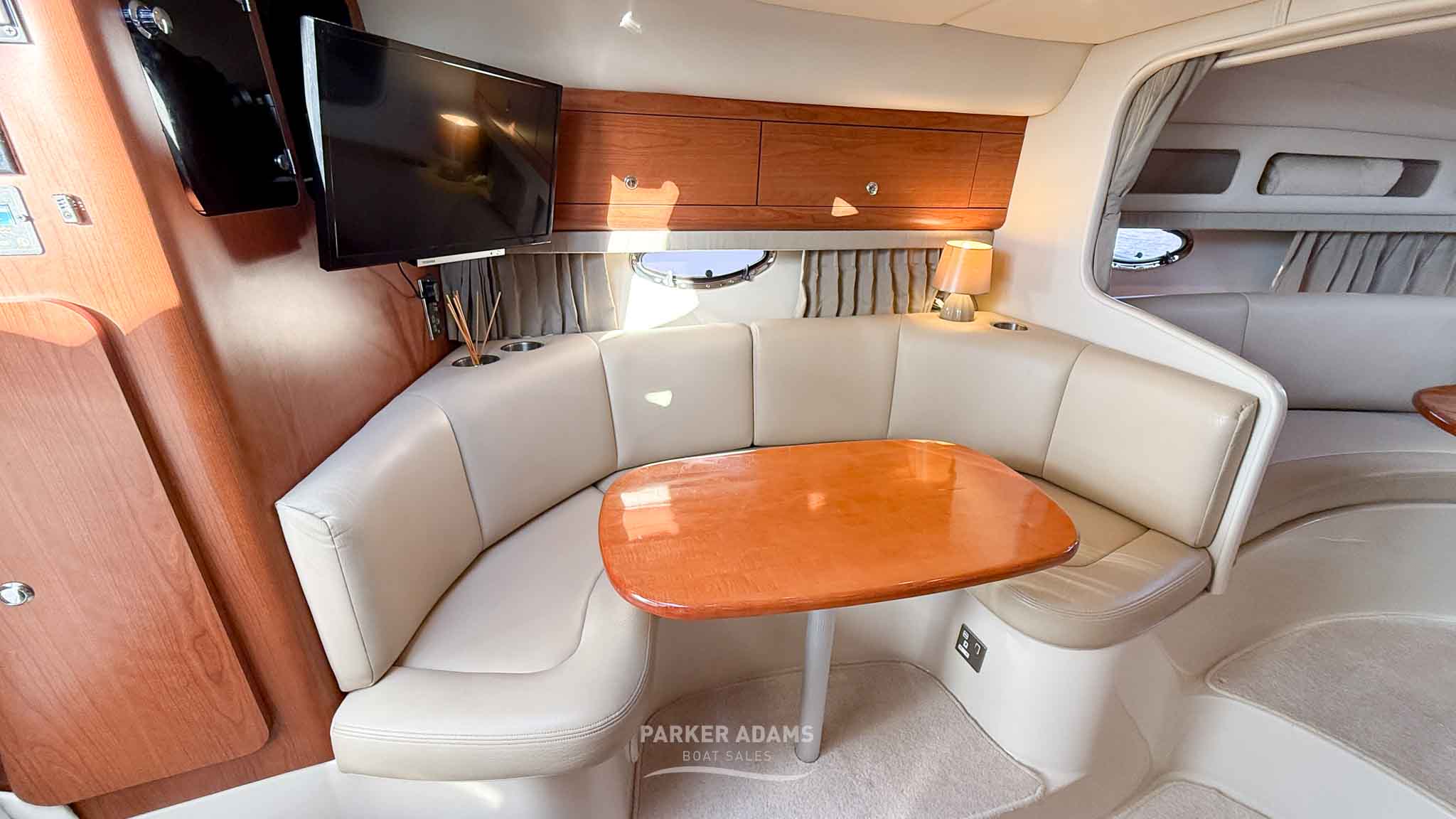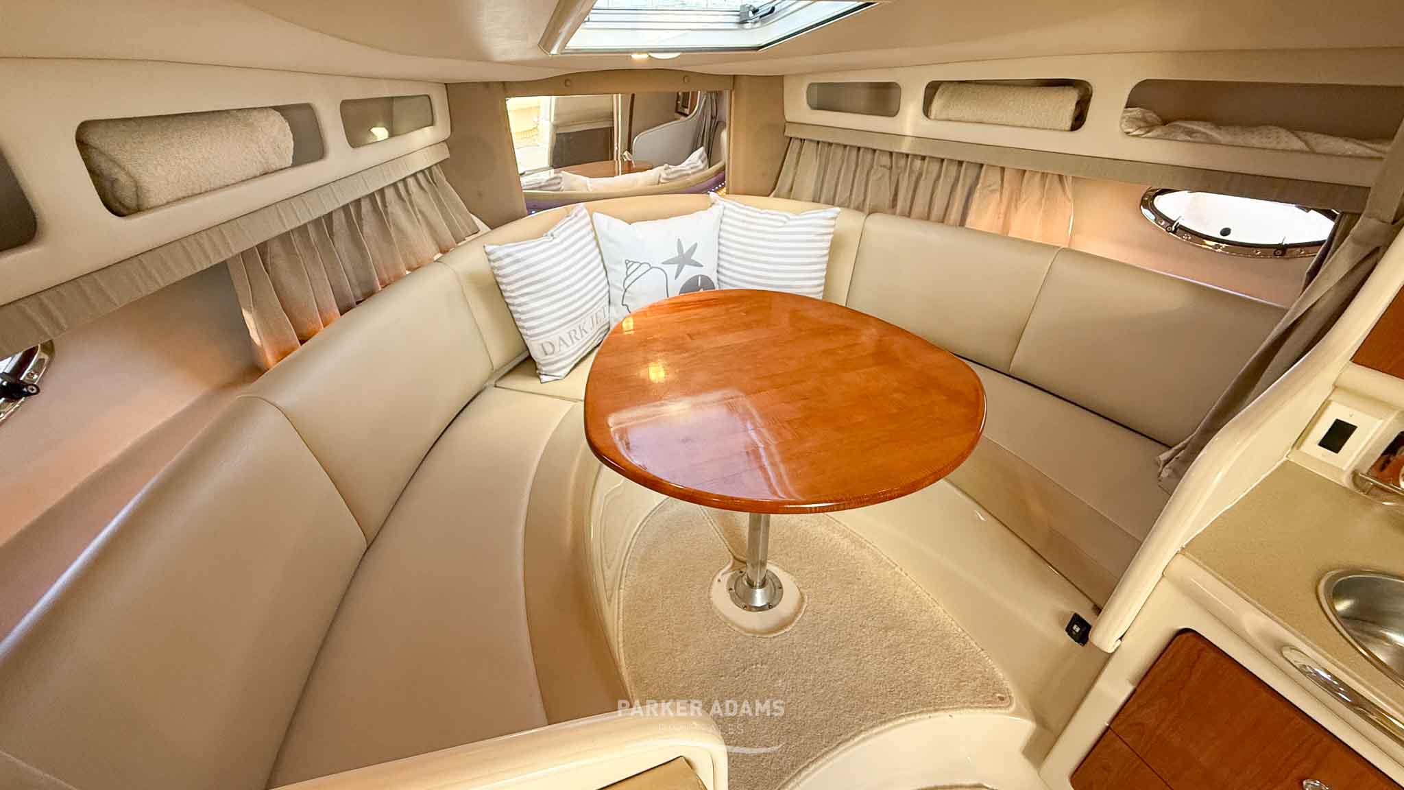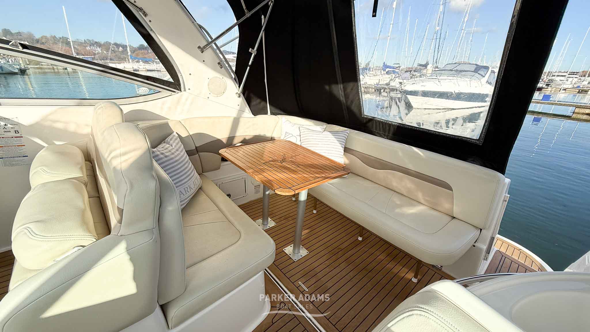 The cockpit is arranged for social use with good seating, a removable table, and a wet bar.
