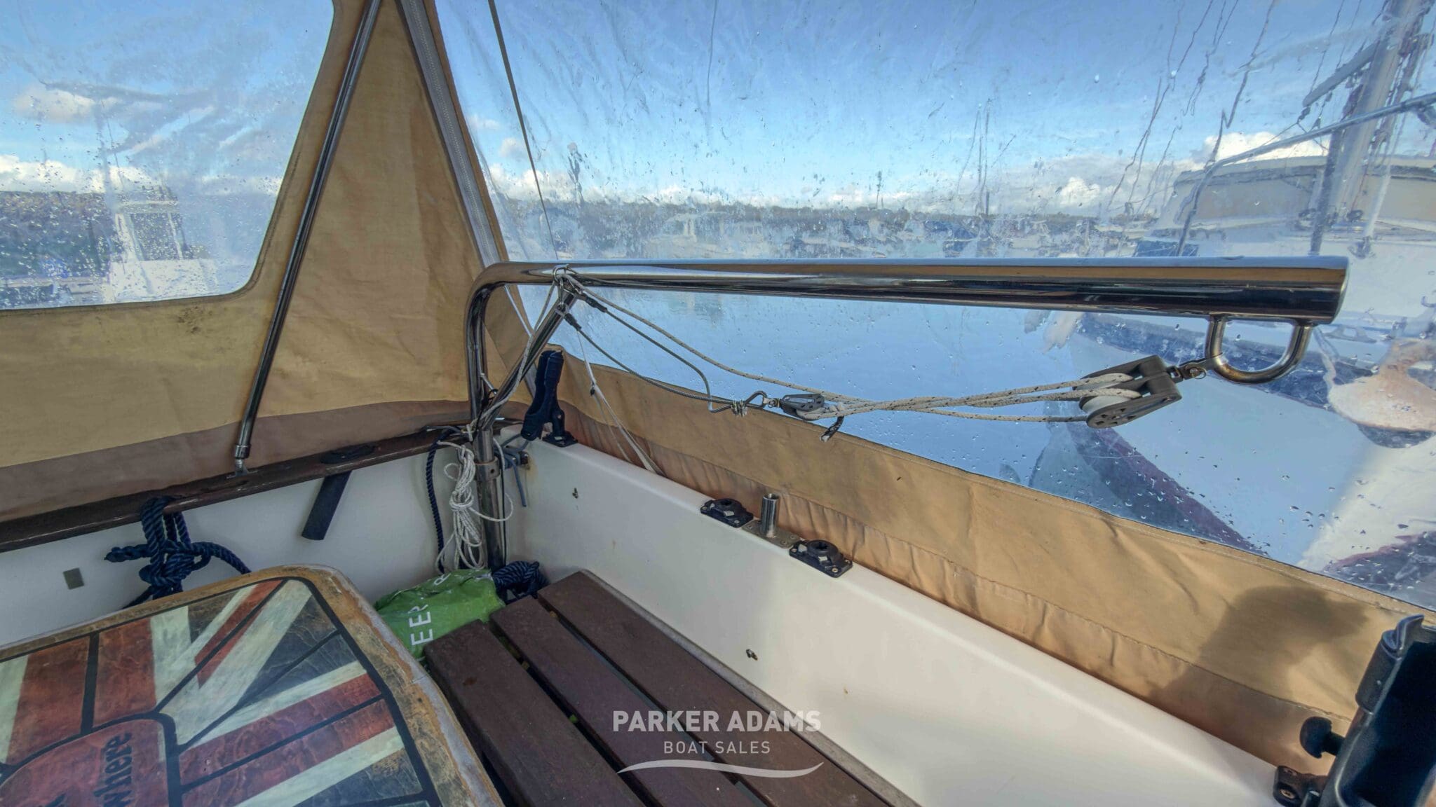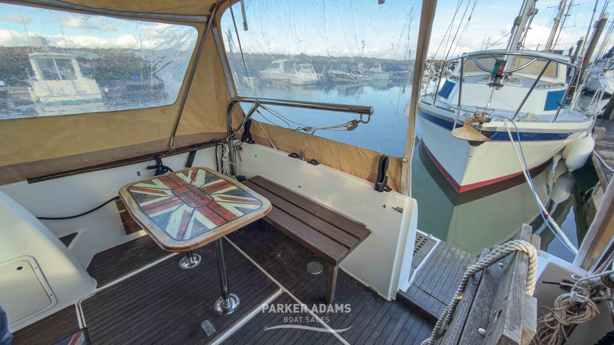 The cockpit is set up for real use, featuring a hot and cold shower, canvas cockpit cover and window wipers and washers to improve visibility underway. Two opening ports and an opening hatch in the forward cabin provide good ventilation, while a large double lazarette offers excellent storage. The boat is well equipped with cruising essentials including four warps and eight fenders. The cockpit is finished with a bespoke table and three folding hardwood benches, creating an inviting space for entertaining or relaxing at anchor.