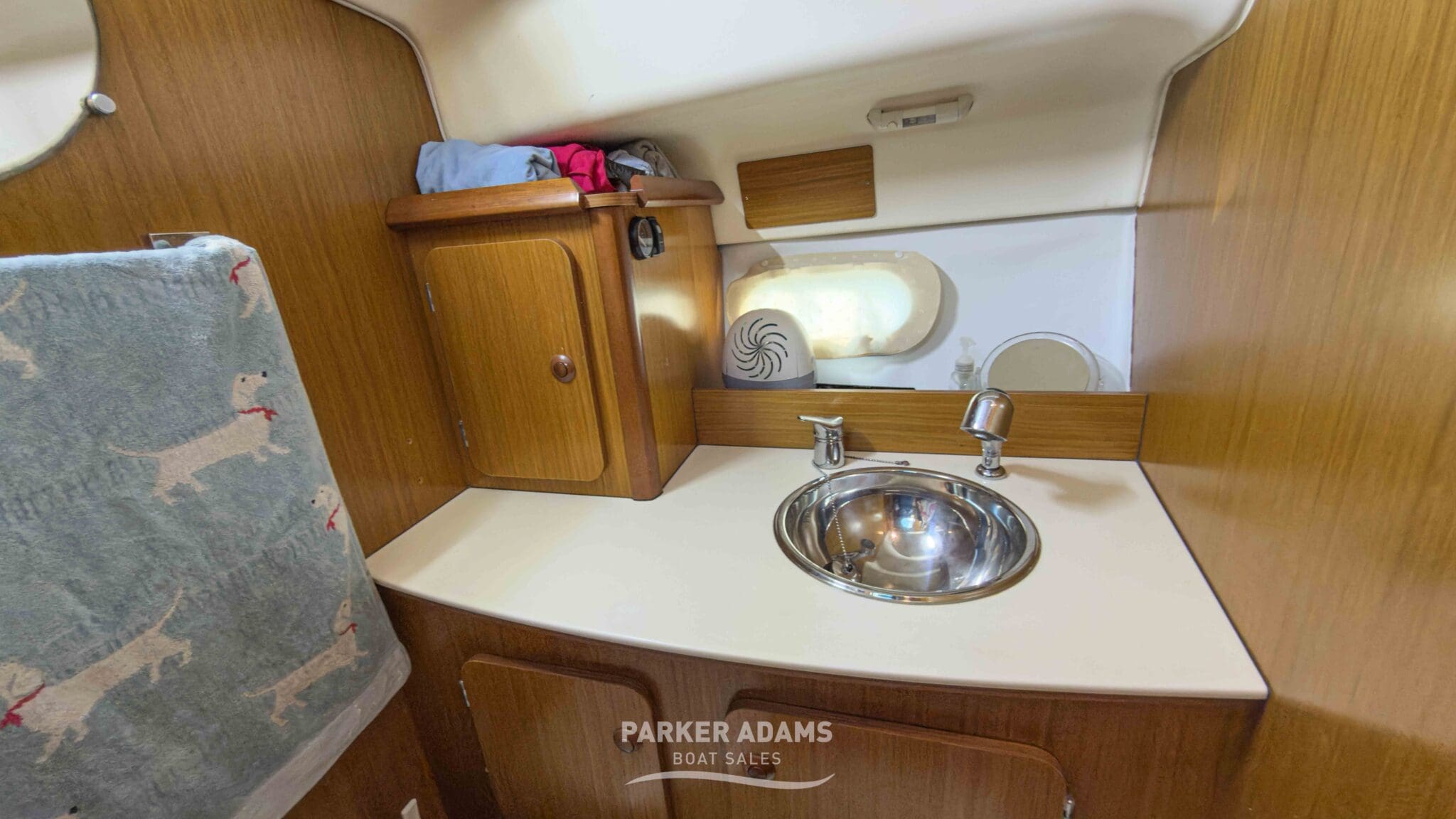 The saloon features comfortable seating with a dining table, a dedicated chart table and a 12-volt television with disc player. The galley is well equipped for extended stays aboard, with a sink, two-burner hob, microwave and fridge with freezer compartment. The separate heads compartment includes a full-size manual toilet, wash basin and shower, with a pumped 50-litre holding tank and gauge.