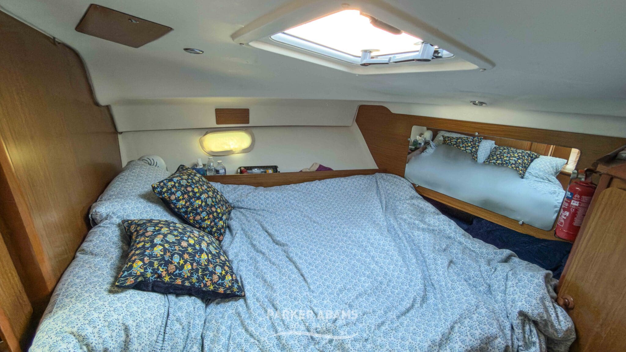 Below decks, the Merry Fisher 925 offers a bright and comfortable interior layout. Forward is a double berth, with an additional single berth guest cabin, while the saloon seating converts easily into a further double berth when required. Upholstery is finished in blue cloth, complemented by teak and holly effect manufactured board flooring throughout.