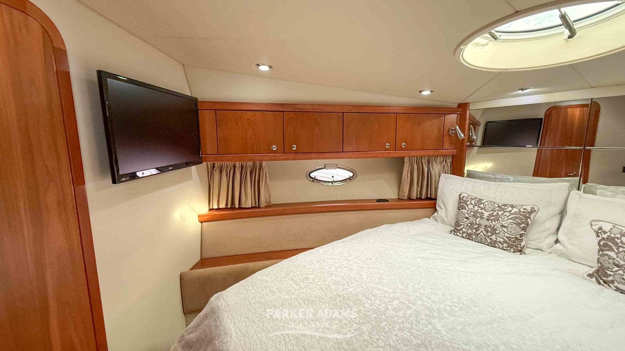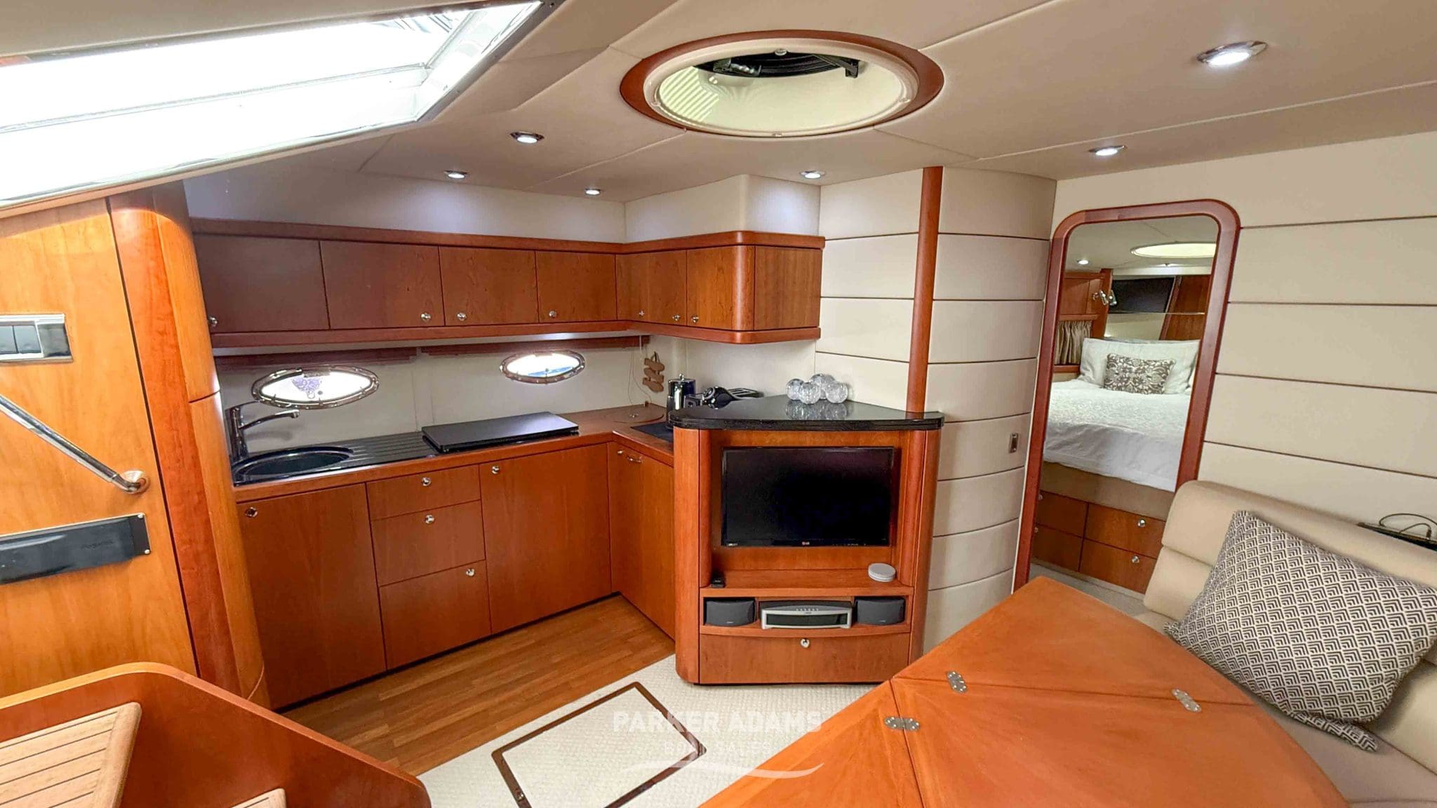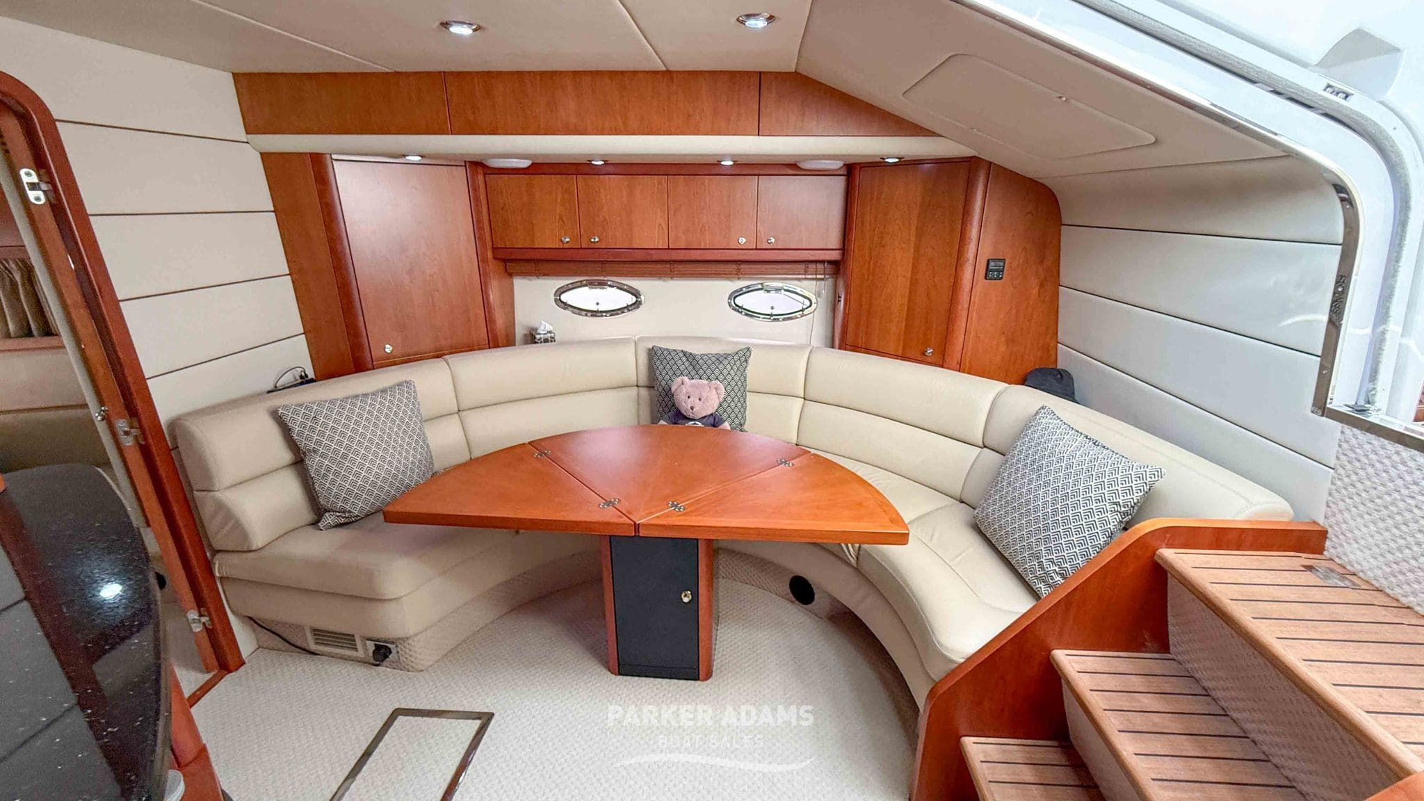 Finished in satin cherrywood cabinetry with cream leather upholstery, her interior exudes classic Sunseeker luxury, tastefully updated with modern touches including new carpets, upgraded lighting, and a state-of-the-art Raymarine navigation suite.