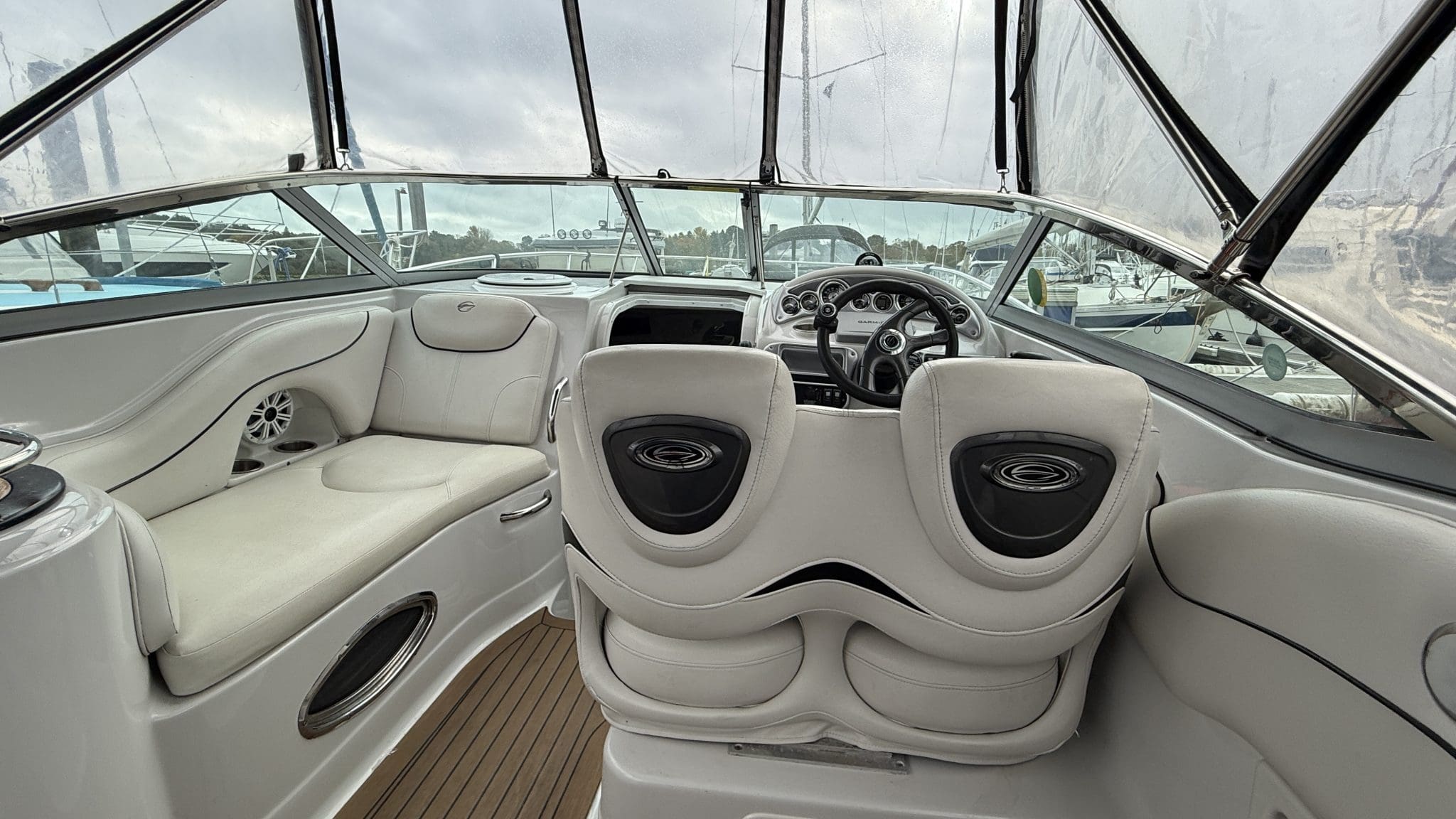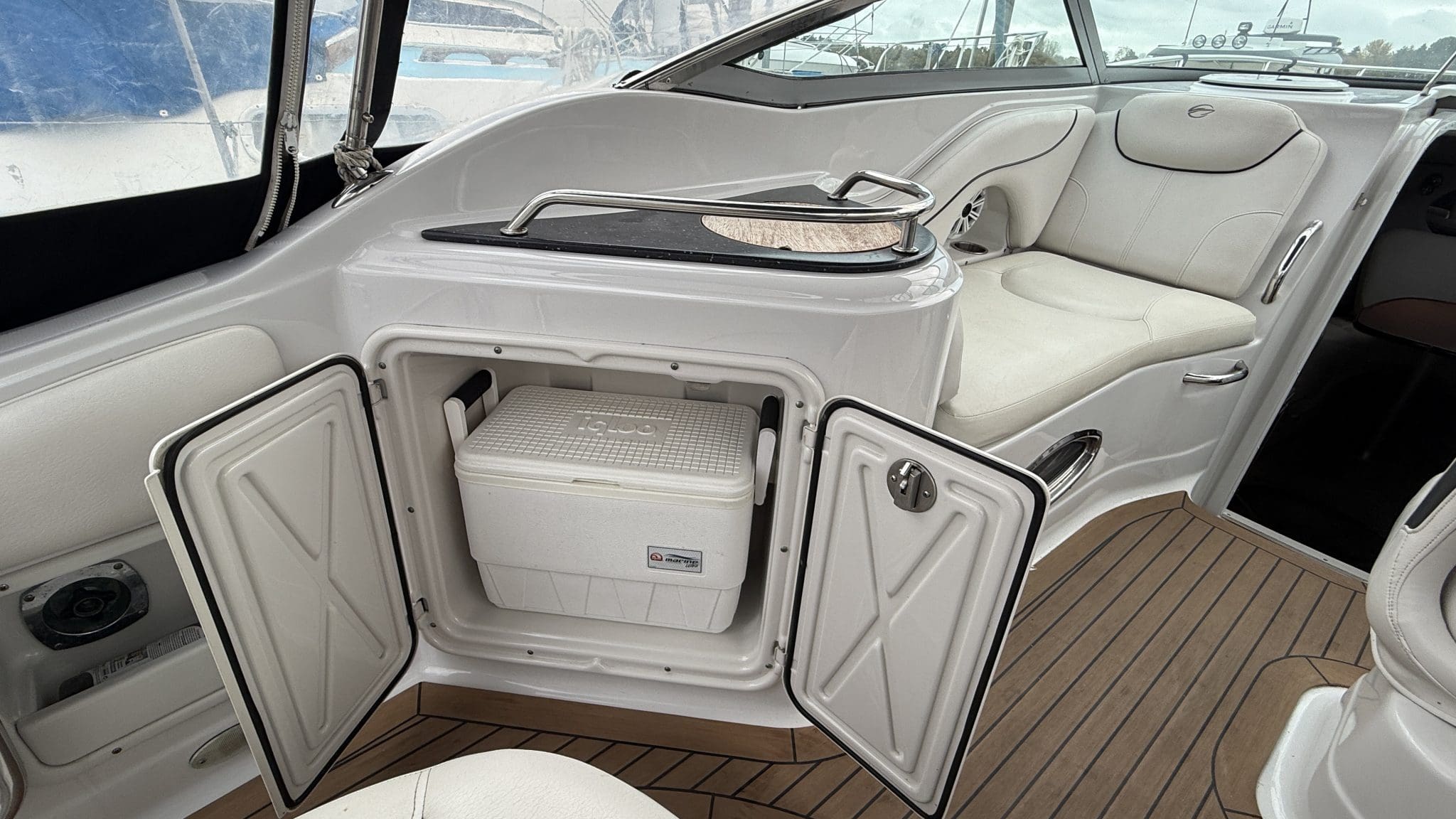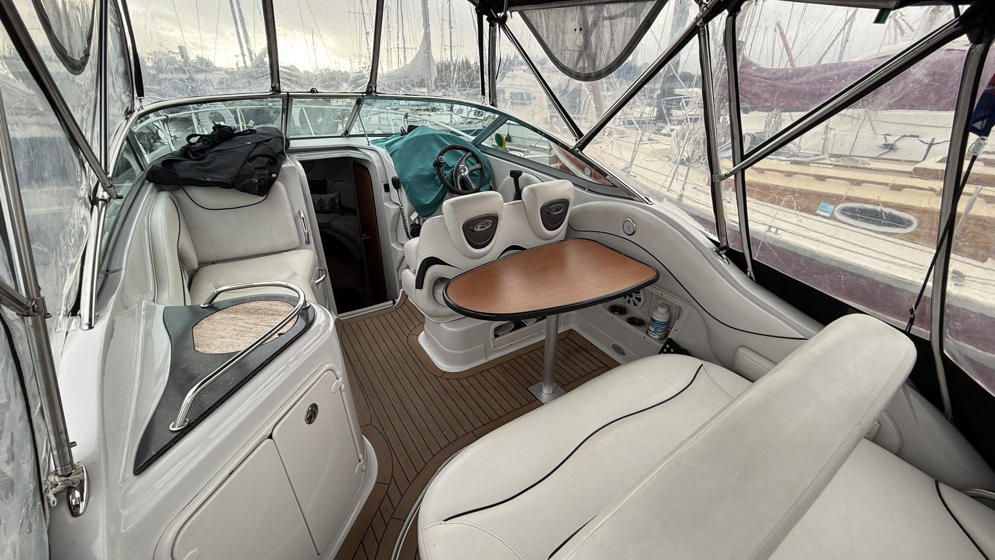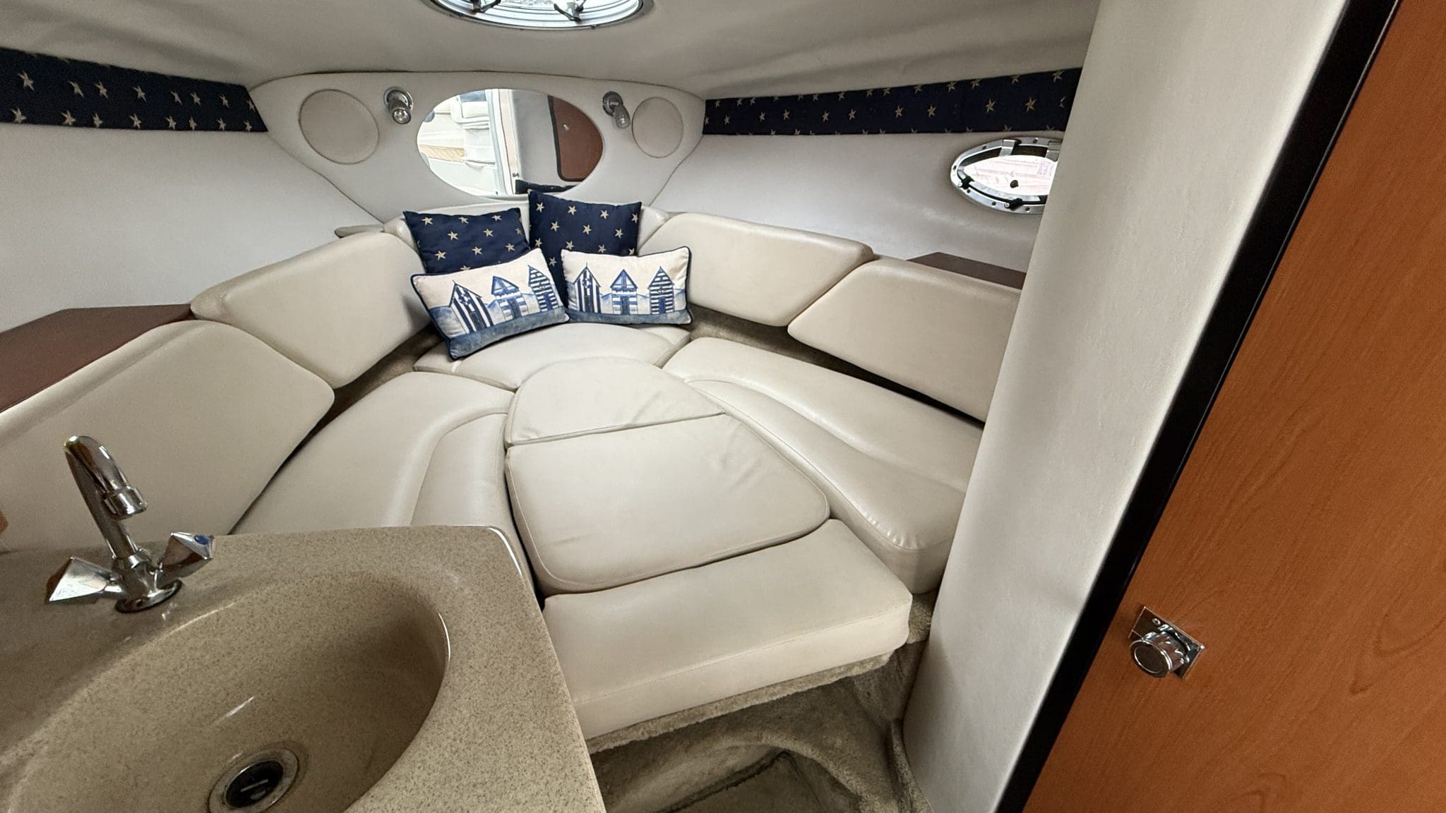Cockpit & Deck area: Spacious cockpit area with seating for 6+ guests when entertaining. Dual swiveling helm seat to starboard and lounging seat to port. Two position aft seating area – either a sun pad or a forward facing lounge seating. Removable cockpit pedestal table with dedicated storage slot in aft locker.