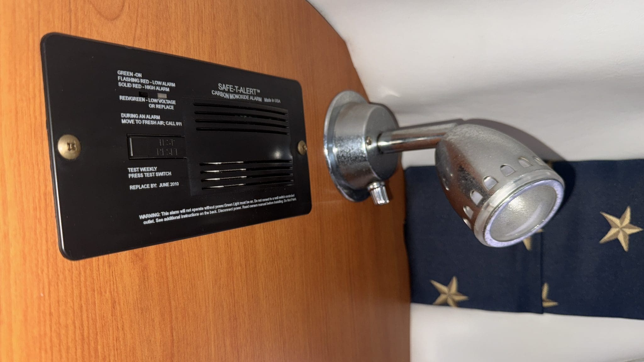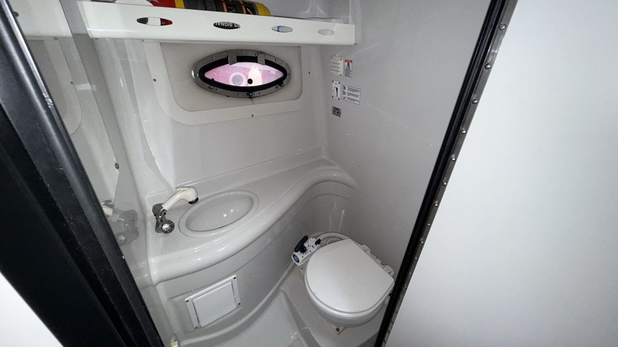 Heads: Good sized heads compartment located to starboard; including a pull-out shower faucet and moulded basin with pressurised hot & cold water supply, Jabsco manual sea toilet with holding tank.