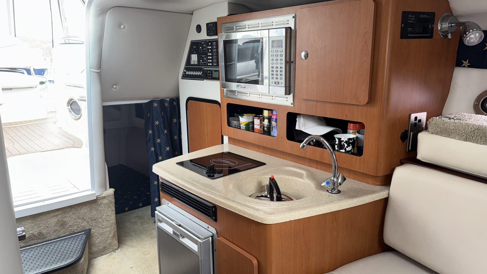 Galley area located on the port side with all necessary equipment for weekend trips, including front opening Waeco fridge, electric hot plate, moulded sink with pressurised H+C water supply, microwave and electric points.