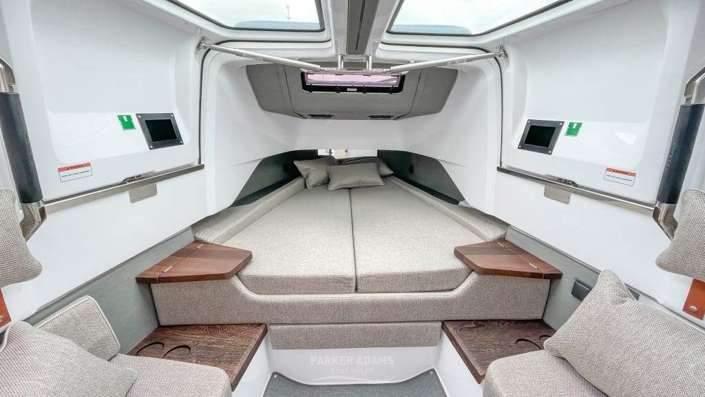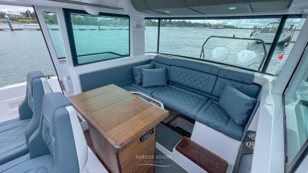 Centre enclosed saloon with twin access doors to side decks, twin helm seats with lift-up bolster cushions, 12v fridge, dining table/galley pack with U-shaped seating all around (helm seat adjust forwards and backwards as well as swivel for further seating around the table).