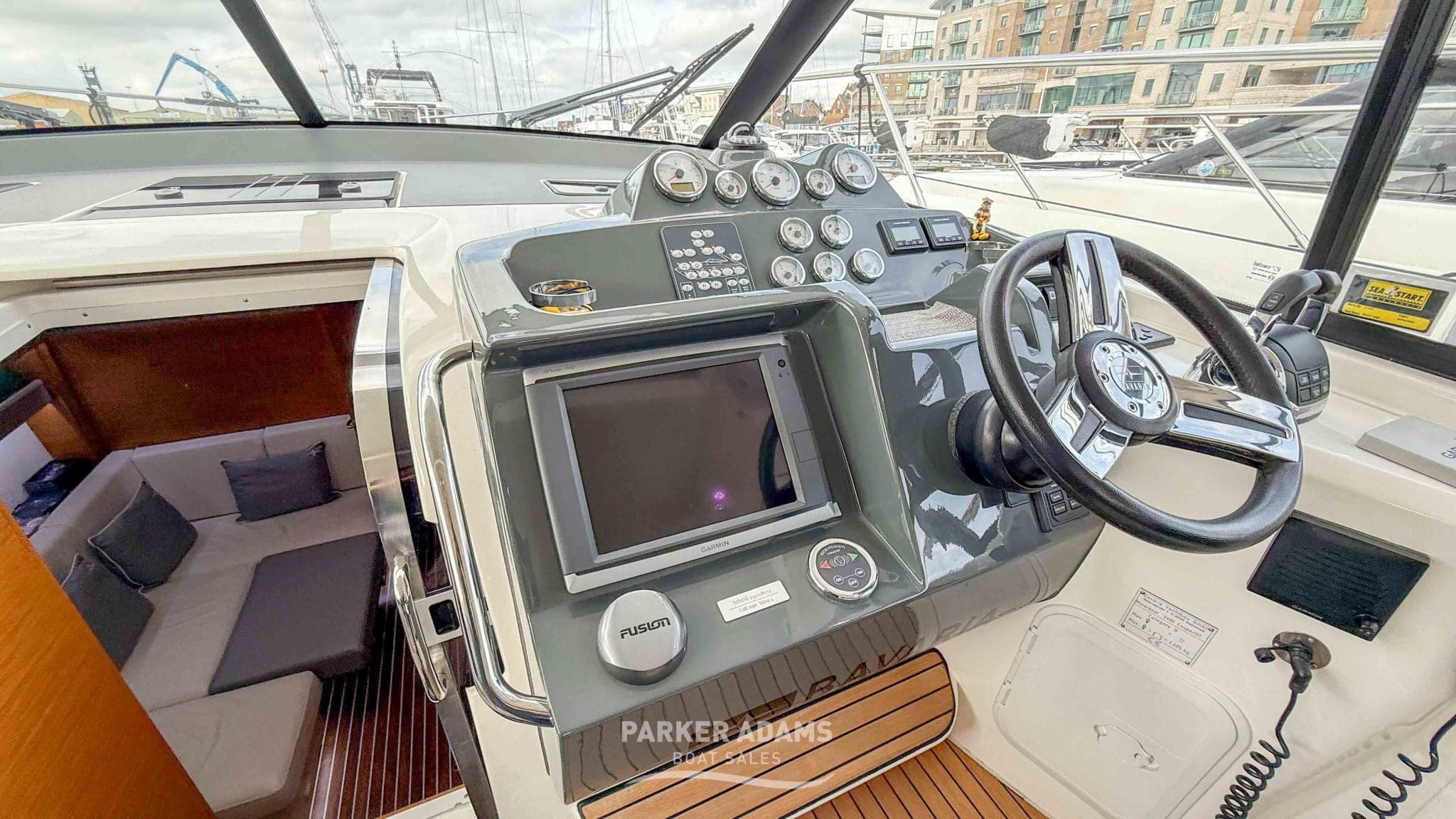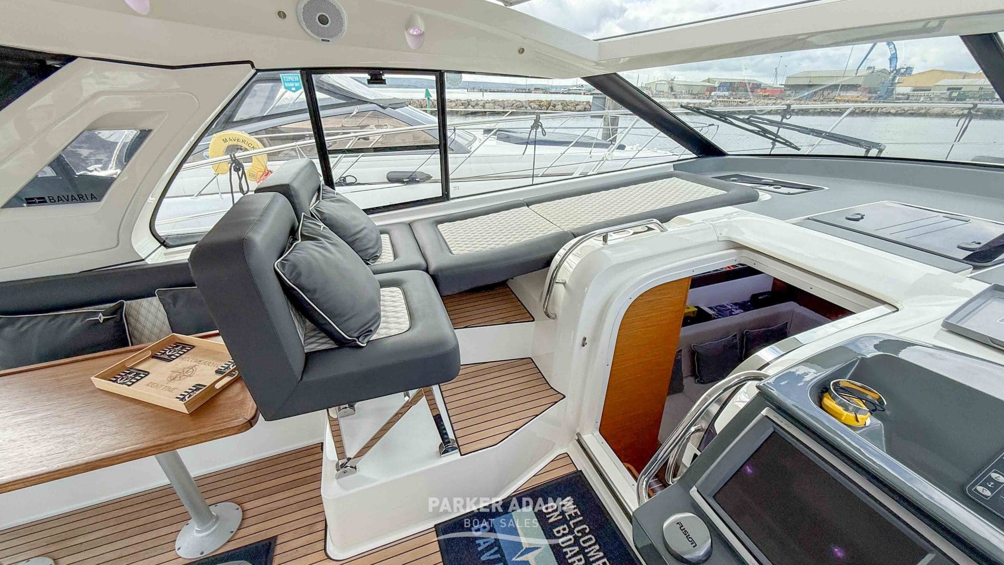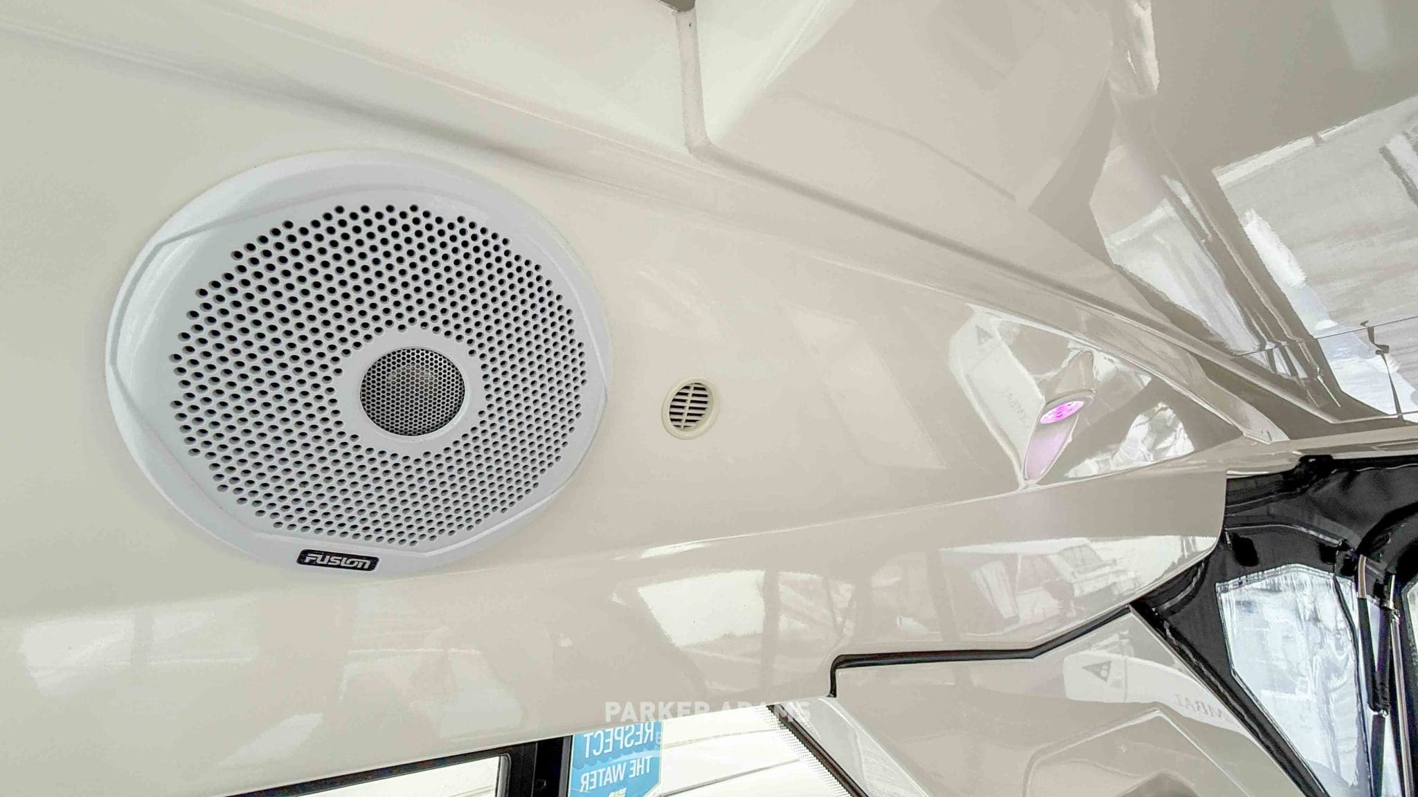 - Fusion stereo system with helm and saloon controls, and speakers throughout