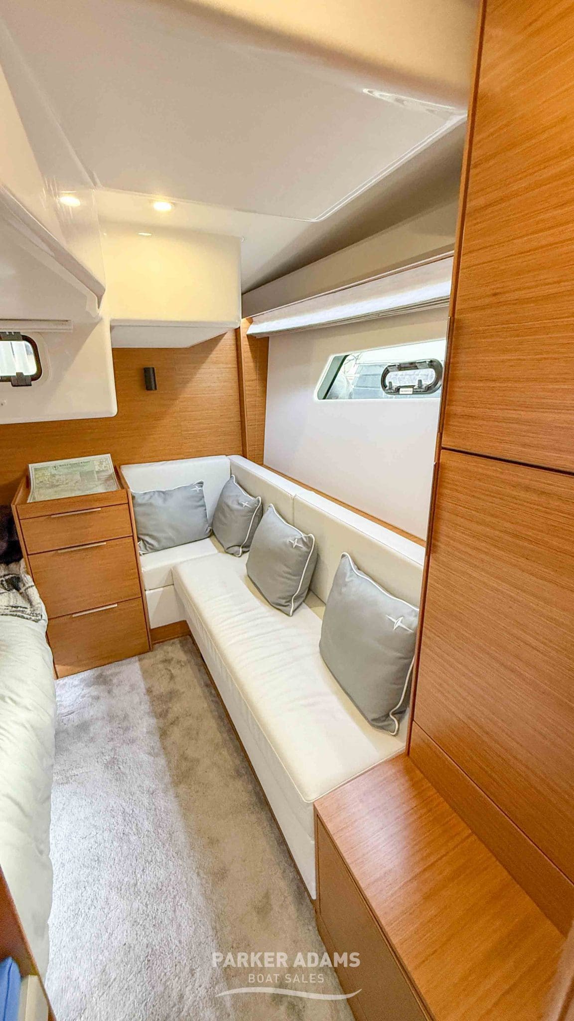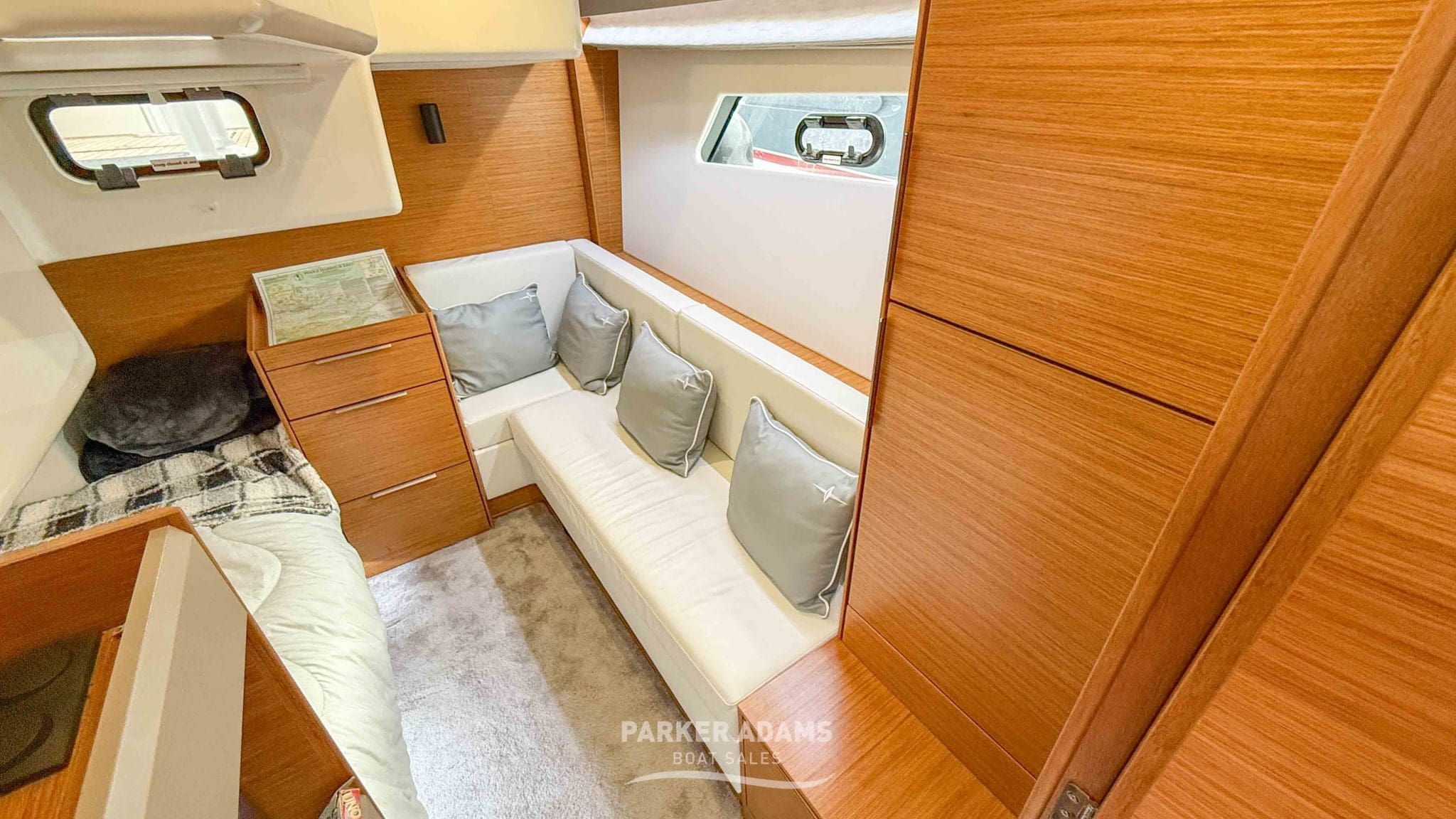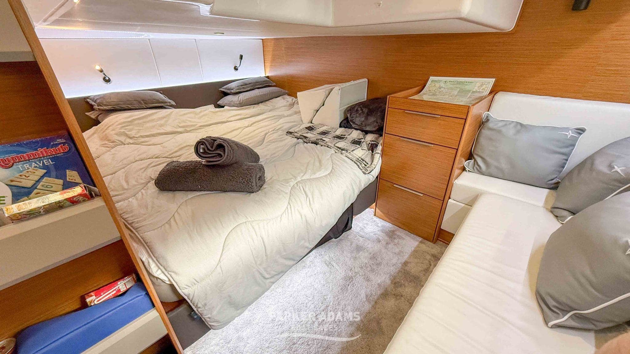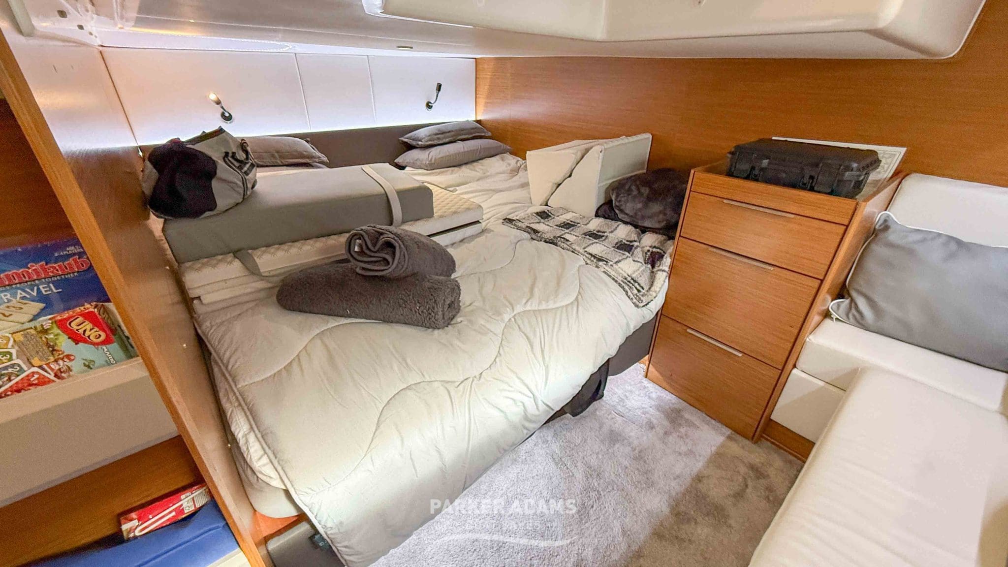 - Aft cabin (port side): Twin berths convertible to a double, complemented by an L-shaped sofa and ample storage
