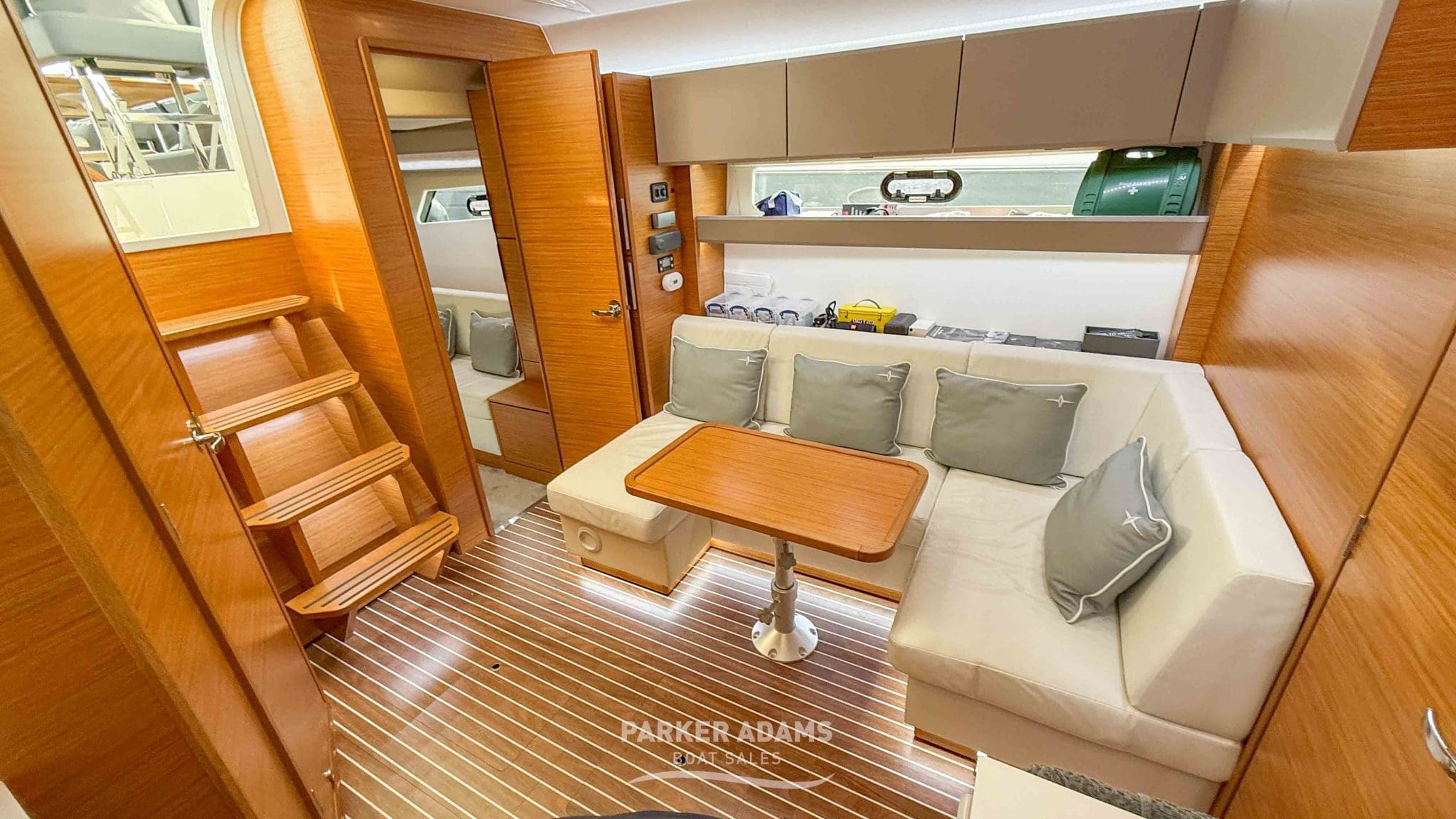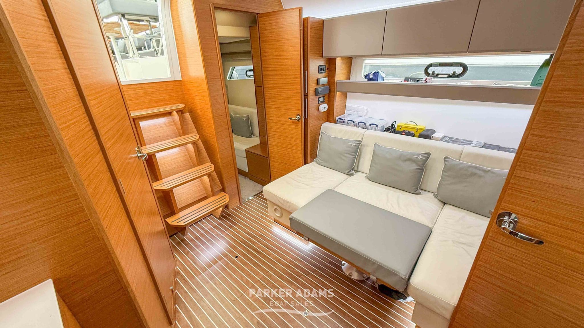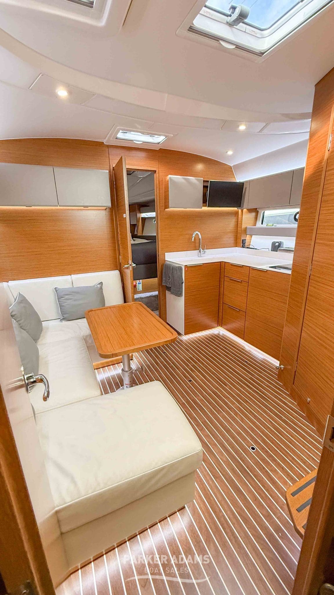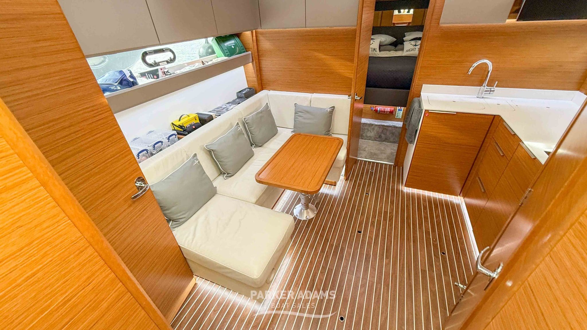 - Aft cabin (port side): Twin berths convertible to a double, complemented by an L-shaped sofa and ample storage