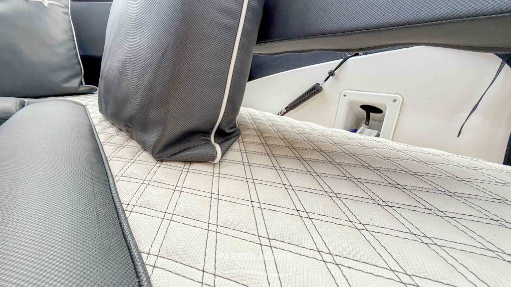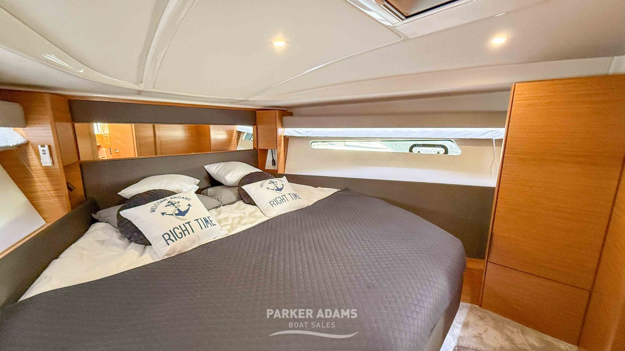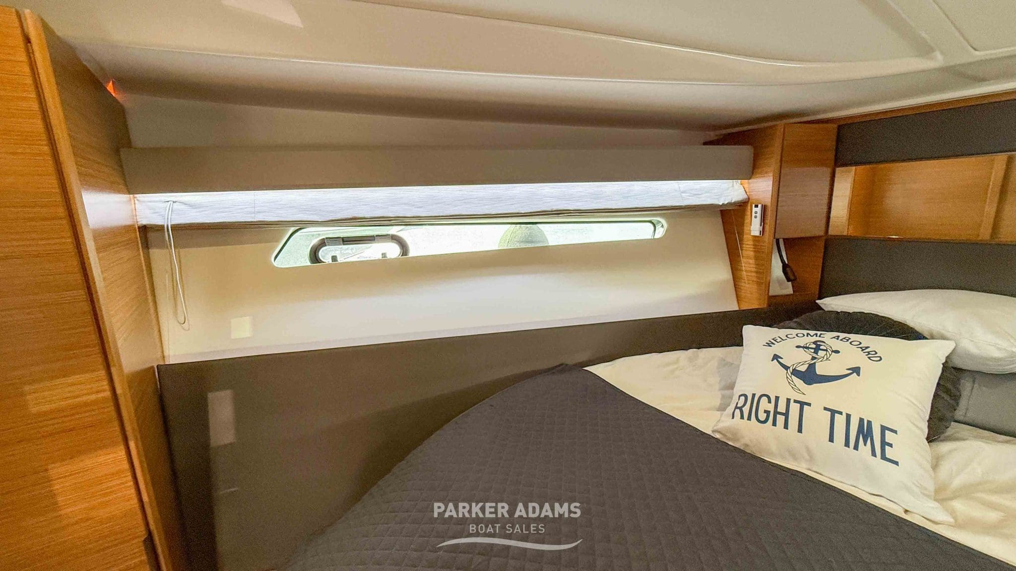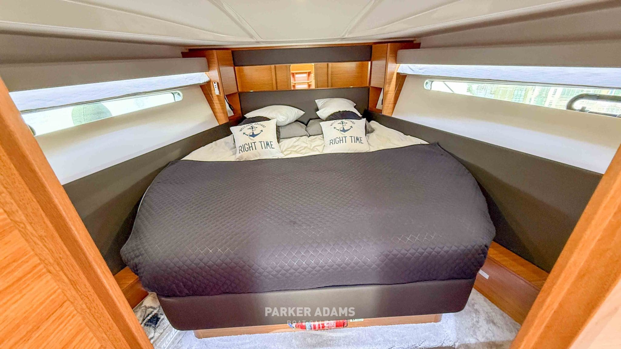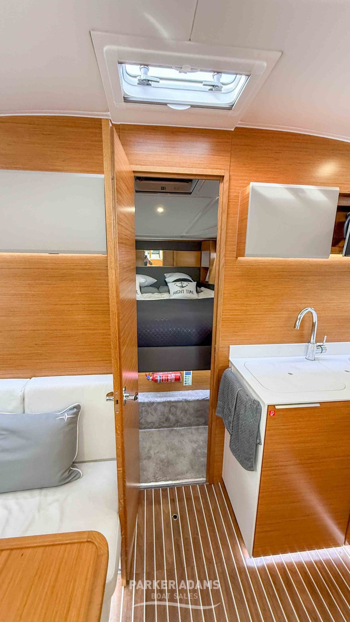 - Aft cabin (port side): Twin berths convertible to a double, complemented by an L-shaped sofa and ample storage
