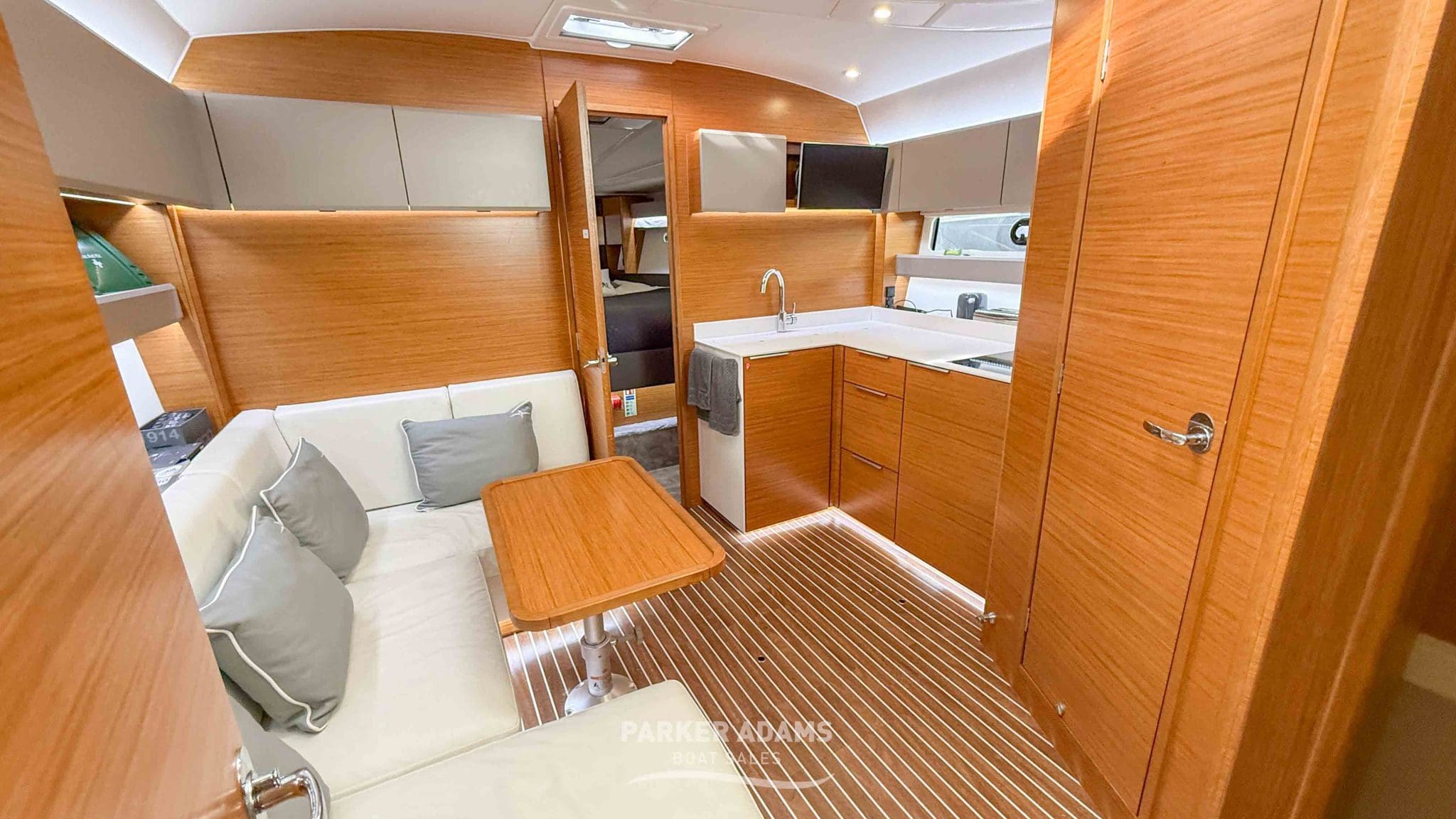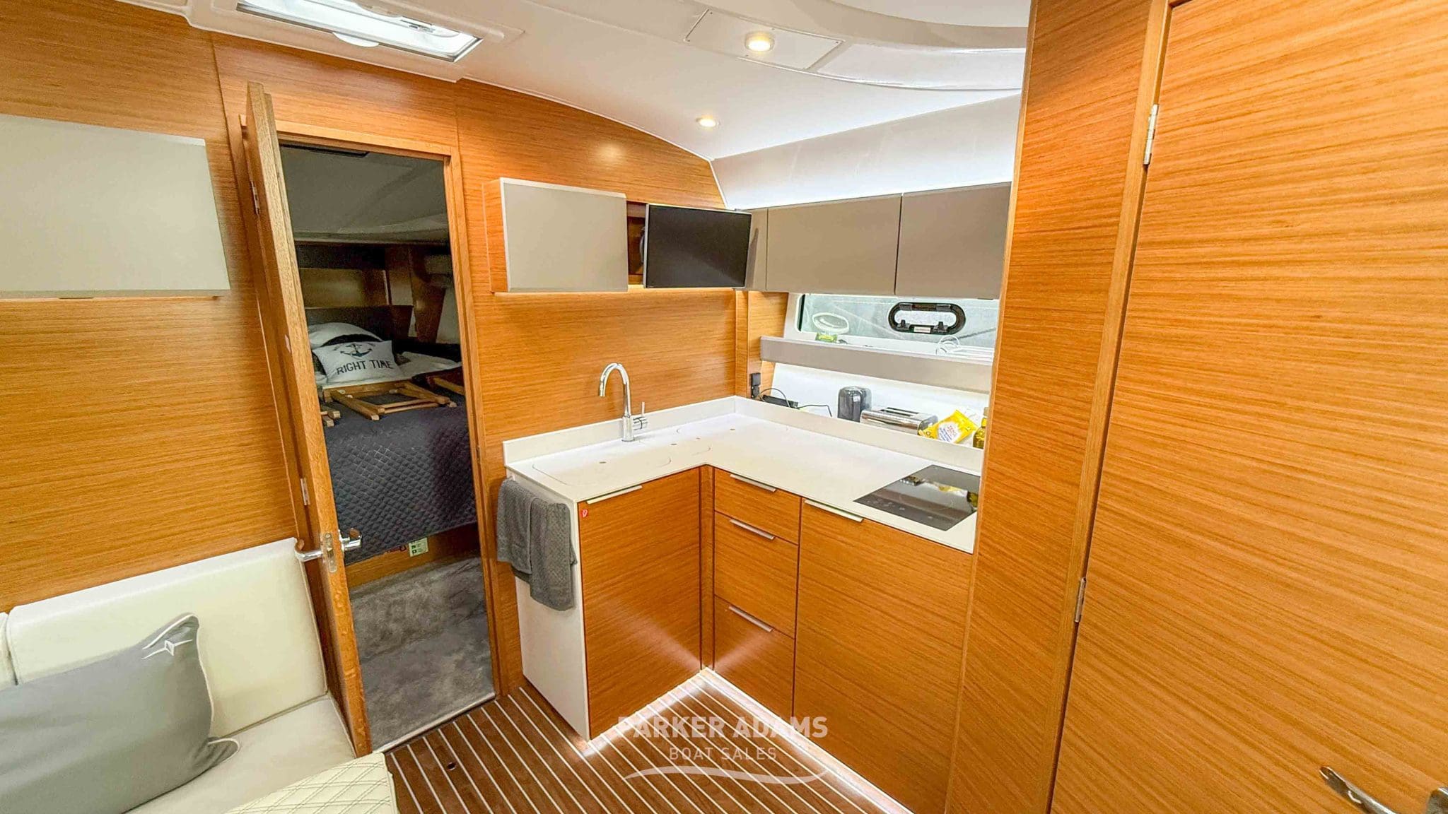 - Starboard side: Fully equipped galley with TV, electric hob, large sink, generous storage, and fridge