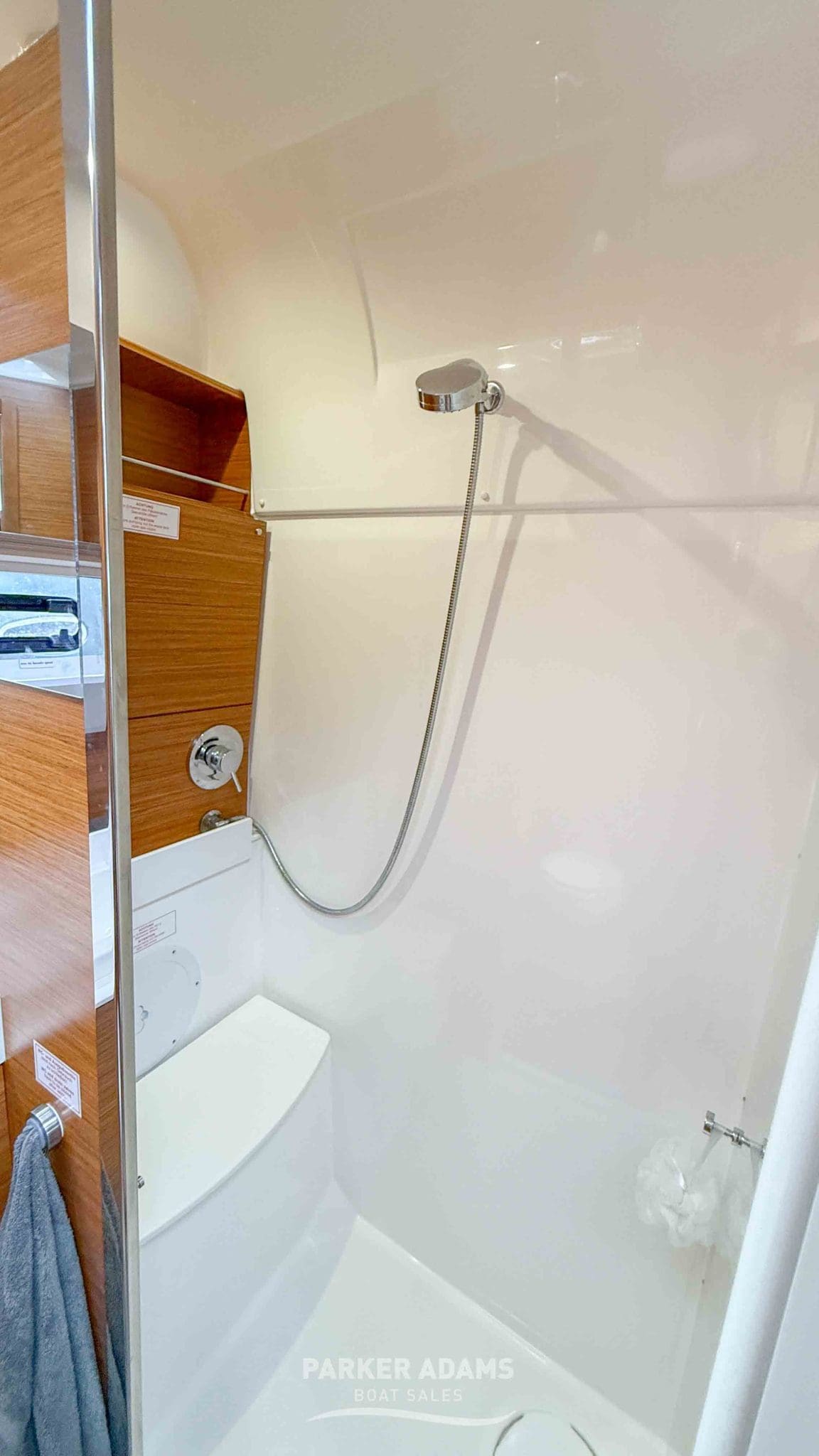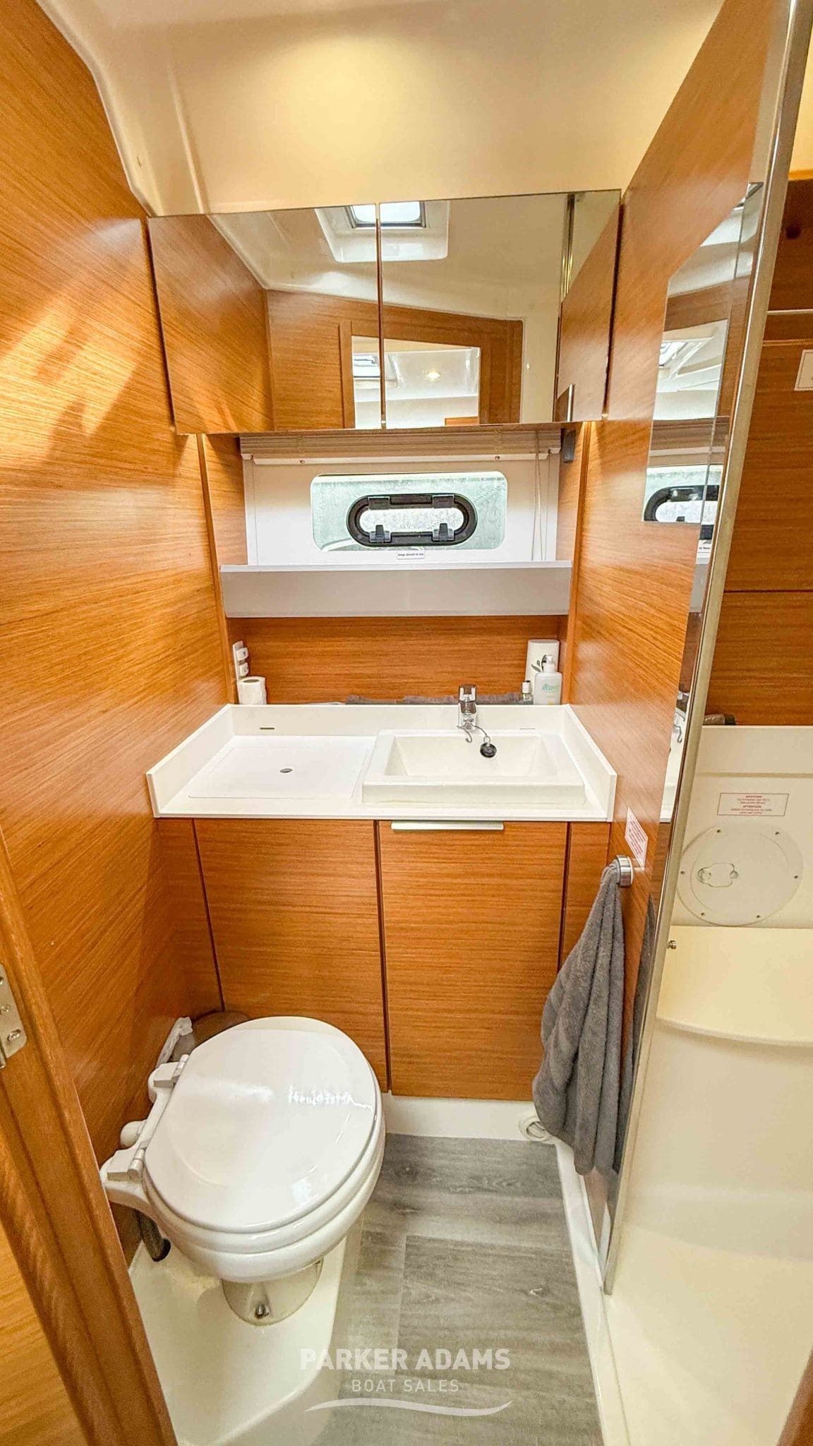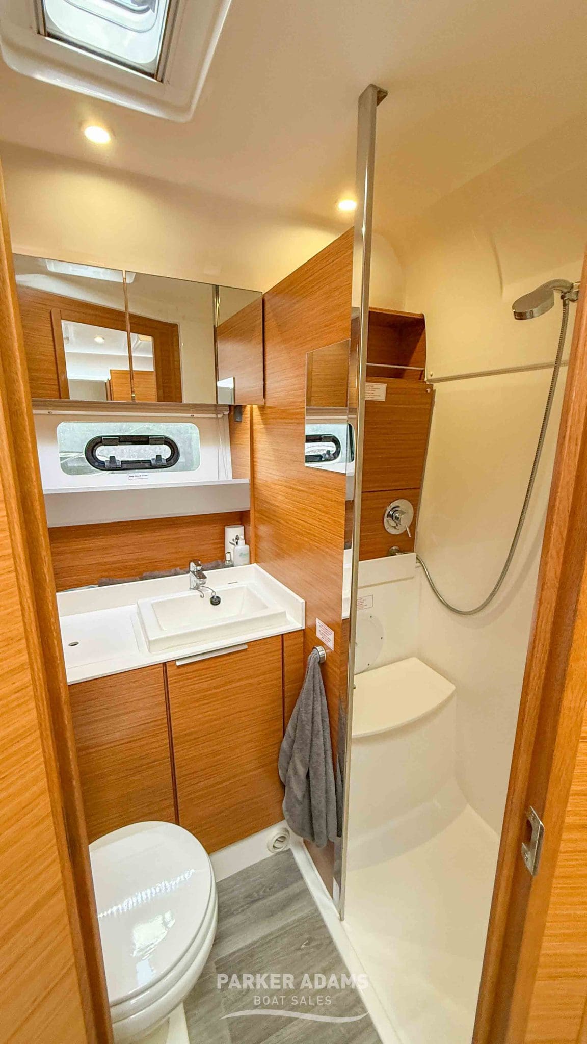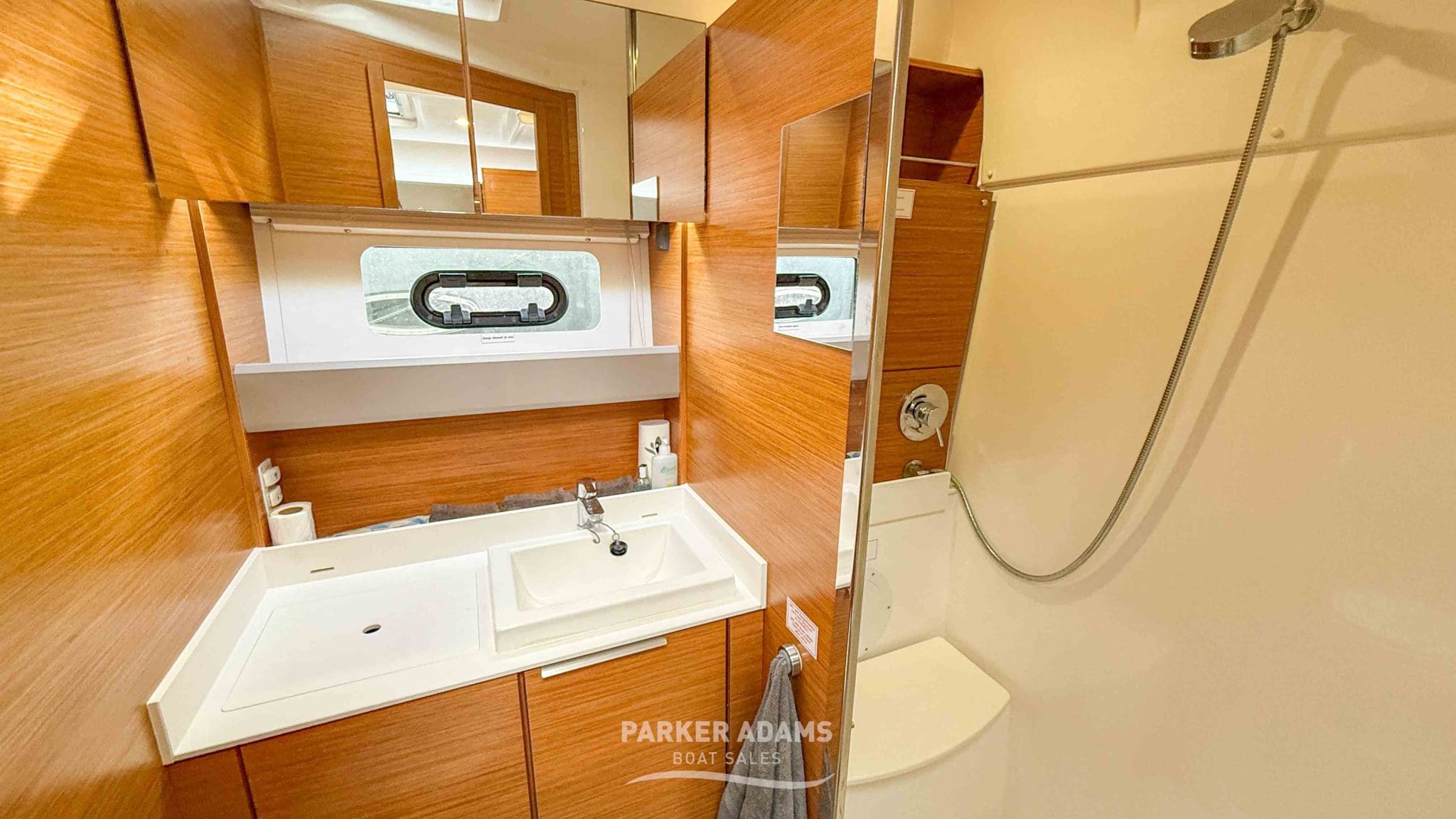 - Midships heads compartment: Well-finished with sink, storage, and separate stand-up shower
