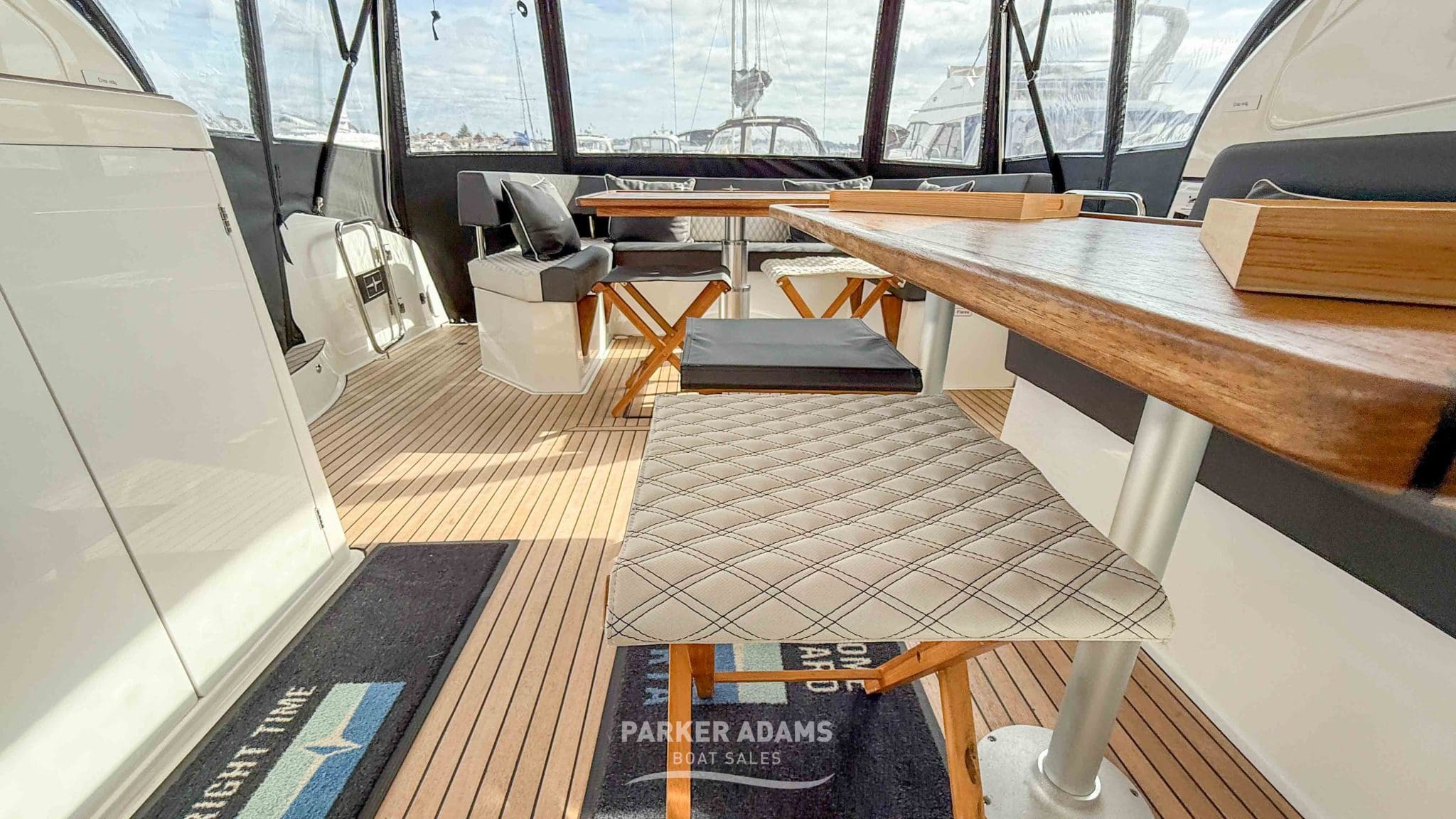 - Teak decks throughout the cockpit and swim platform