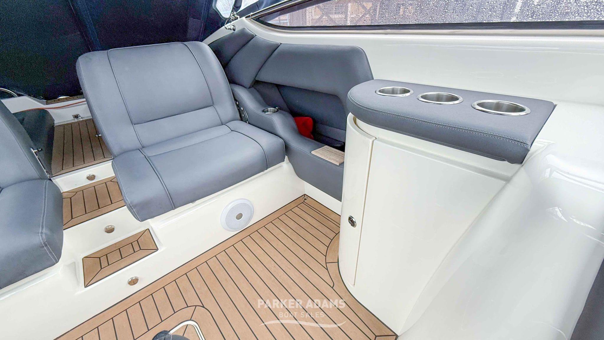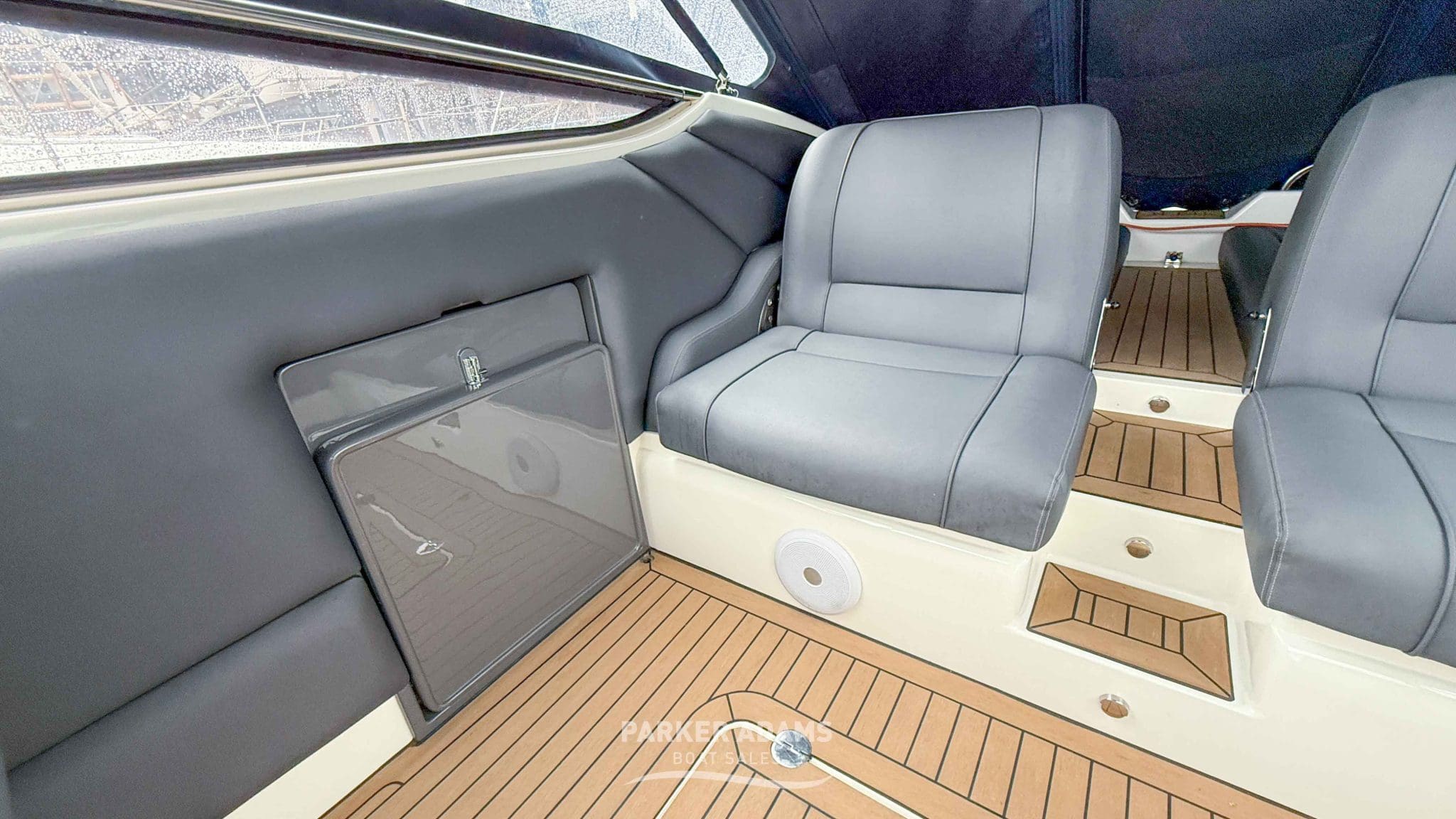 Port side storage cubby spaces lined with matching upholstery and bases covered with Wässerdek EVA foam decking.