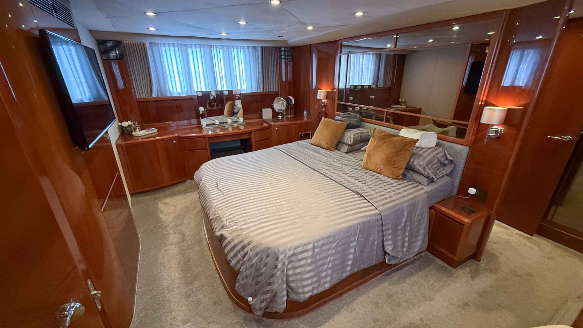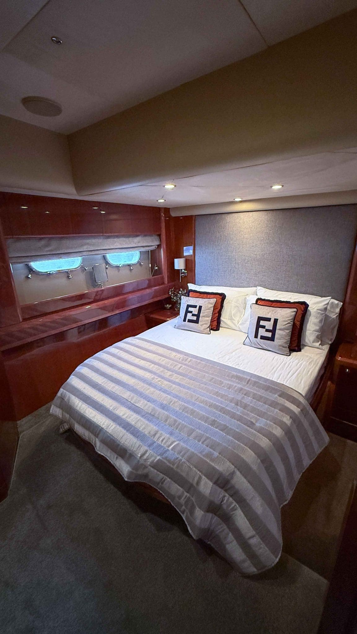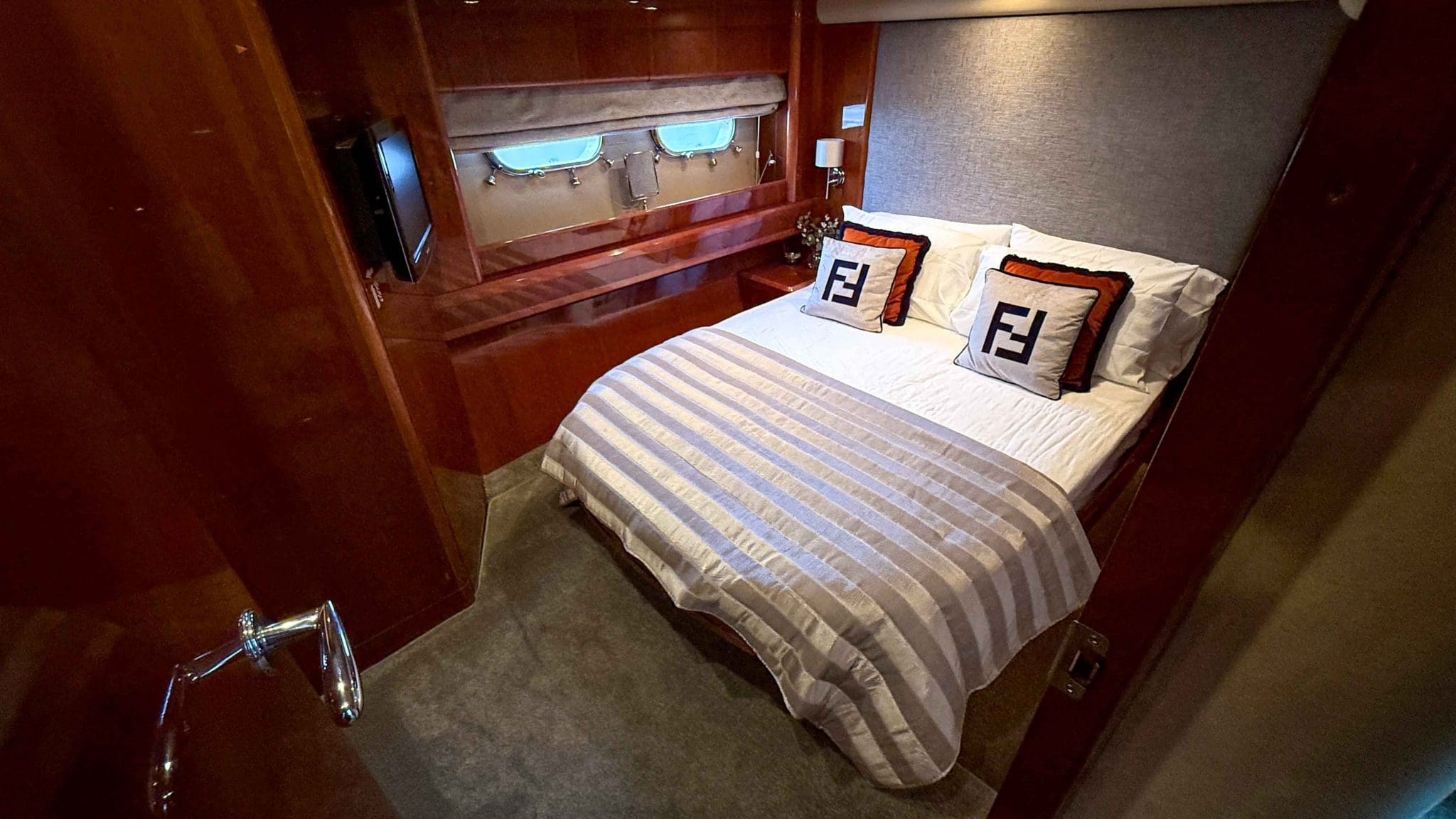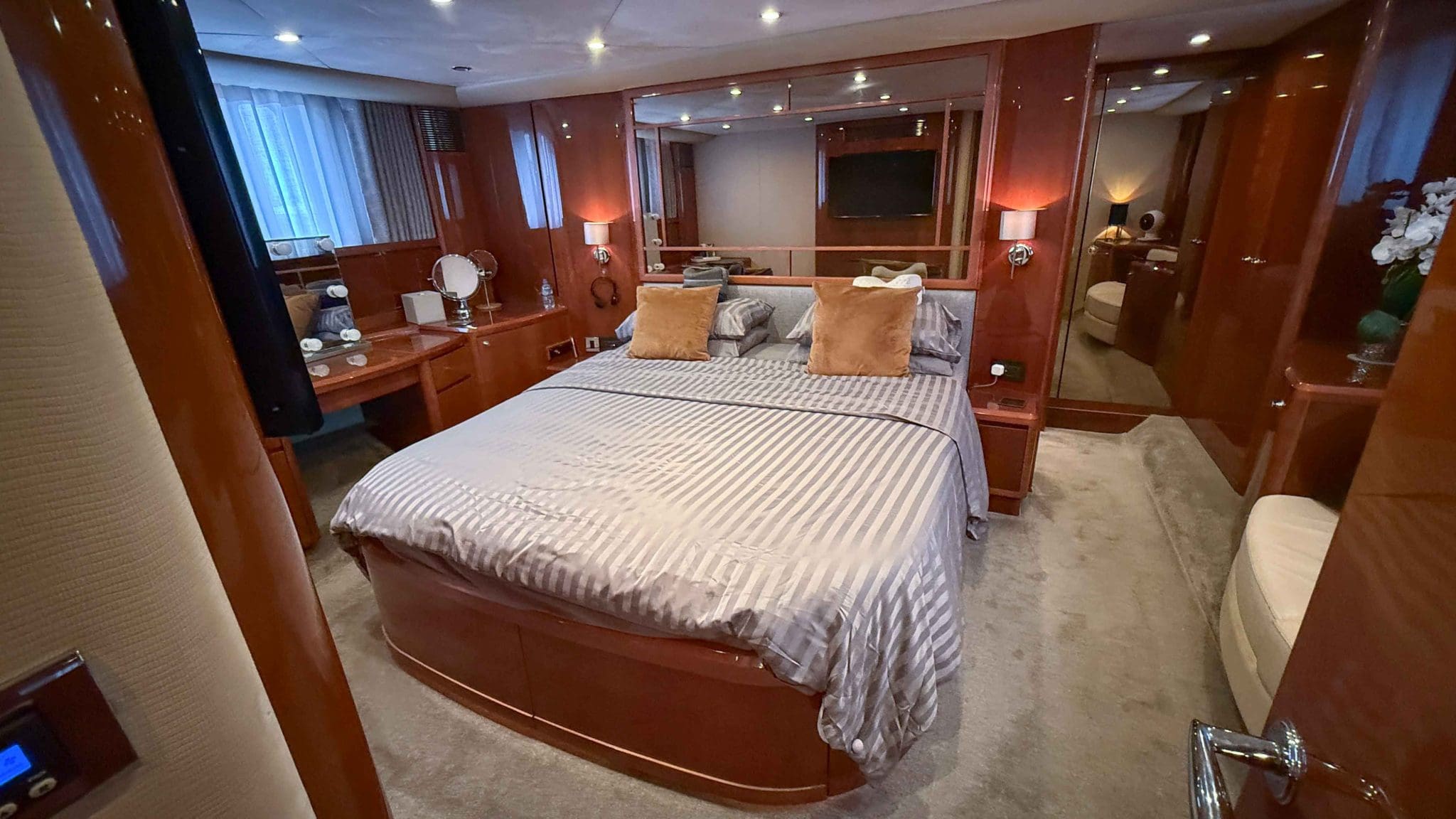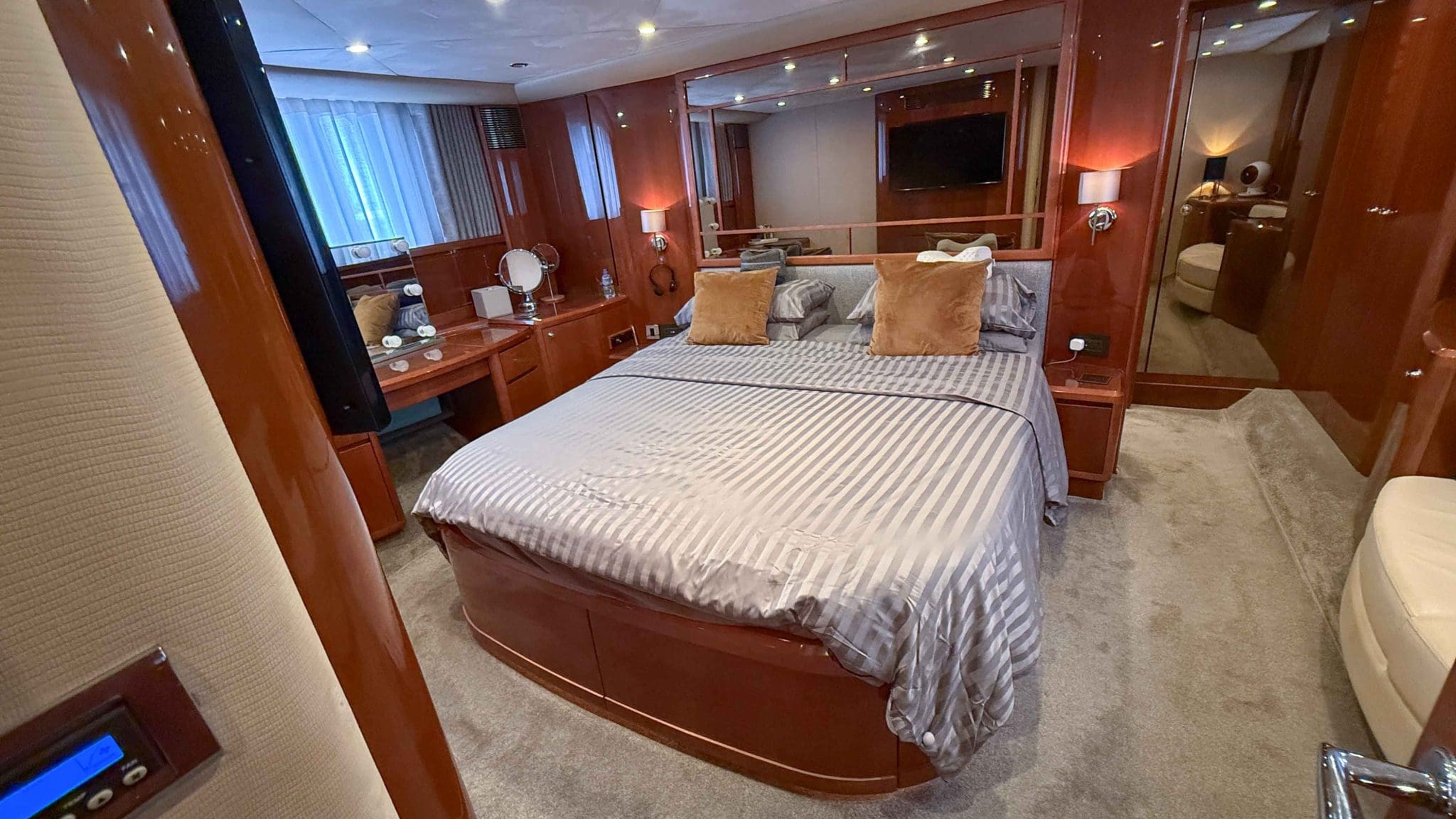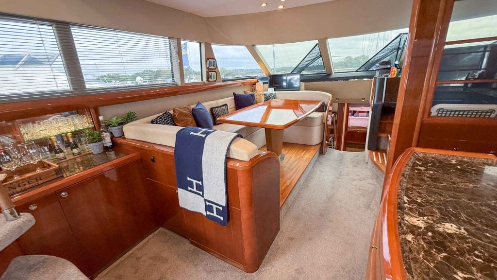 Her interior is finished in high-gloss cherry cabinetry, with granite countertops in the galley and heads. The open-plan saloon, galley, bar, and dinette create a spacious social hub, complete with a custom-built SETAG sofa. The galley is newly equipped (2022) with a full-sized fridge freezer, induction hob, microwave combi oven and dishwasher. A spiral staircase leads to the expansive flybridge, where you’ll find twin helm seats, a large sunpad, a bar with grill, ample seating, dining table, and a tender crane. Triple stainless-steel doors seamlessly connect the salon with the aft cockpit, creating a superb indoor-outdoor living area.