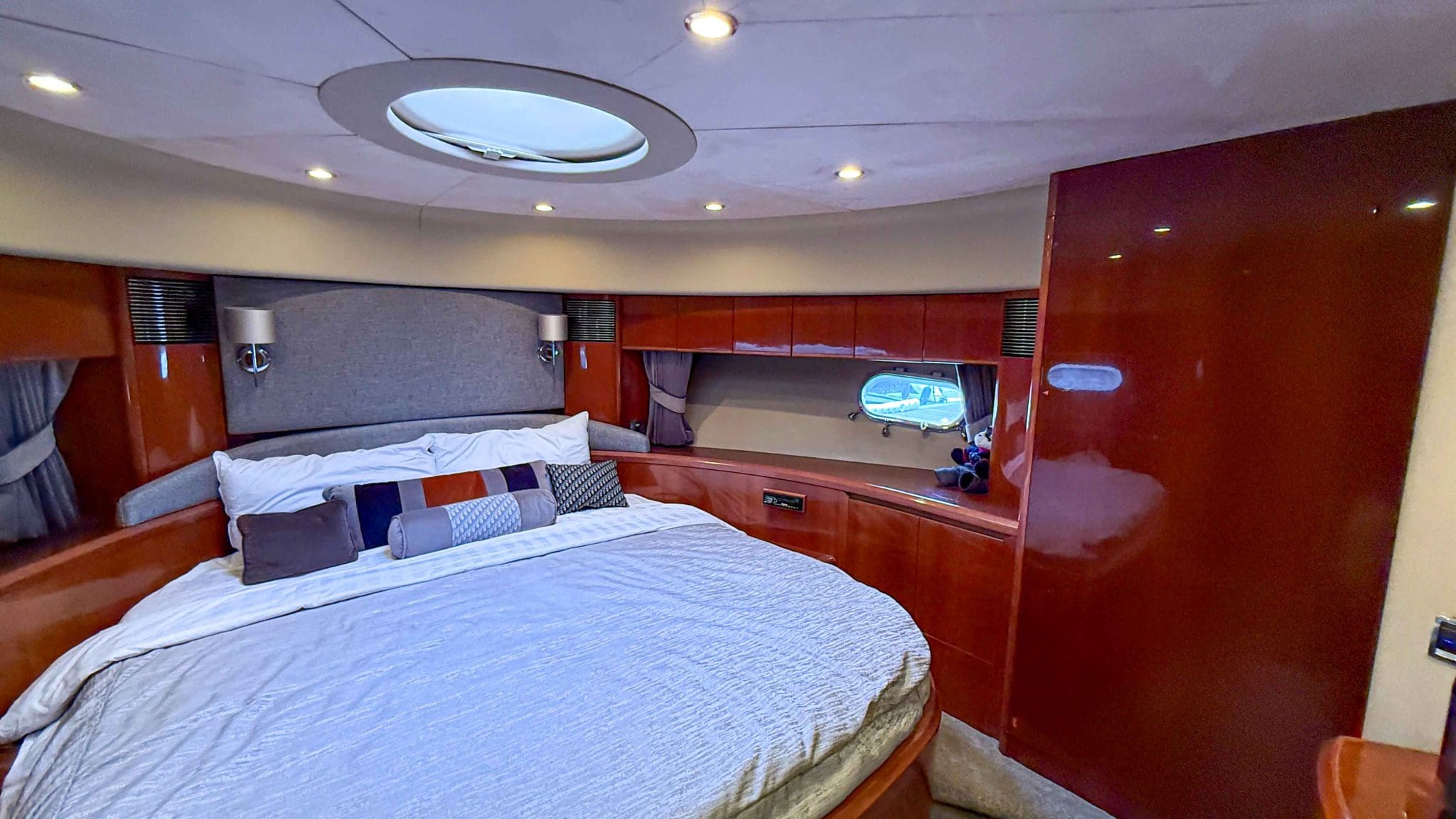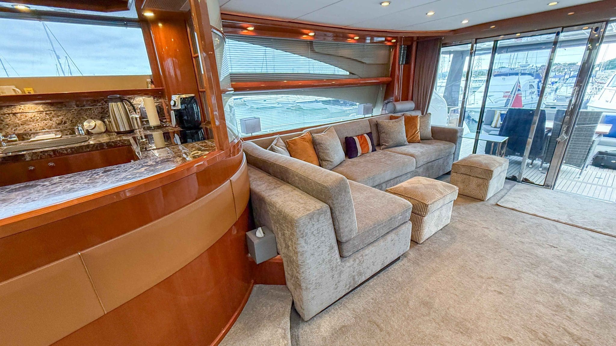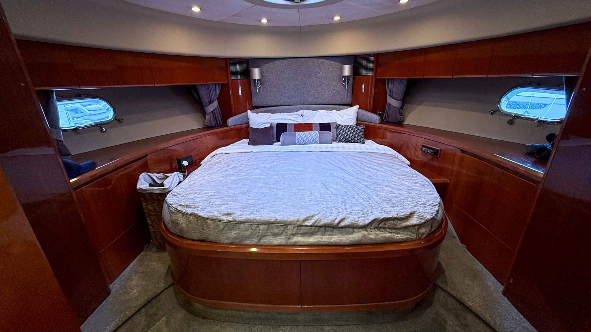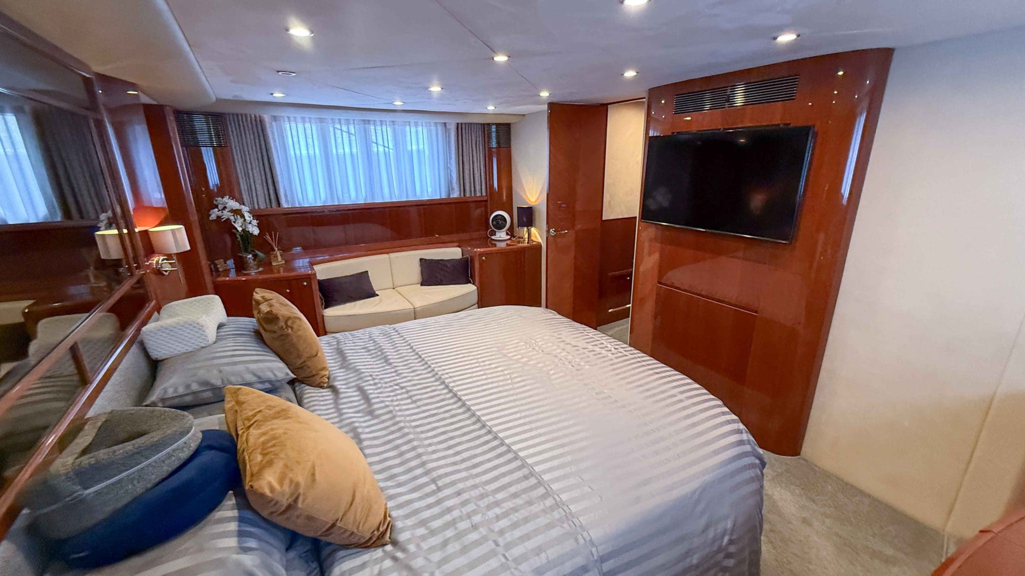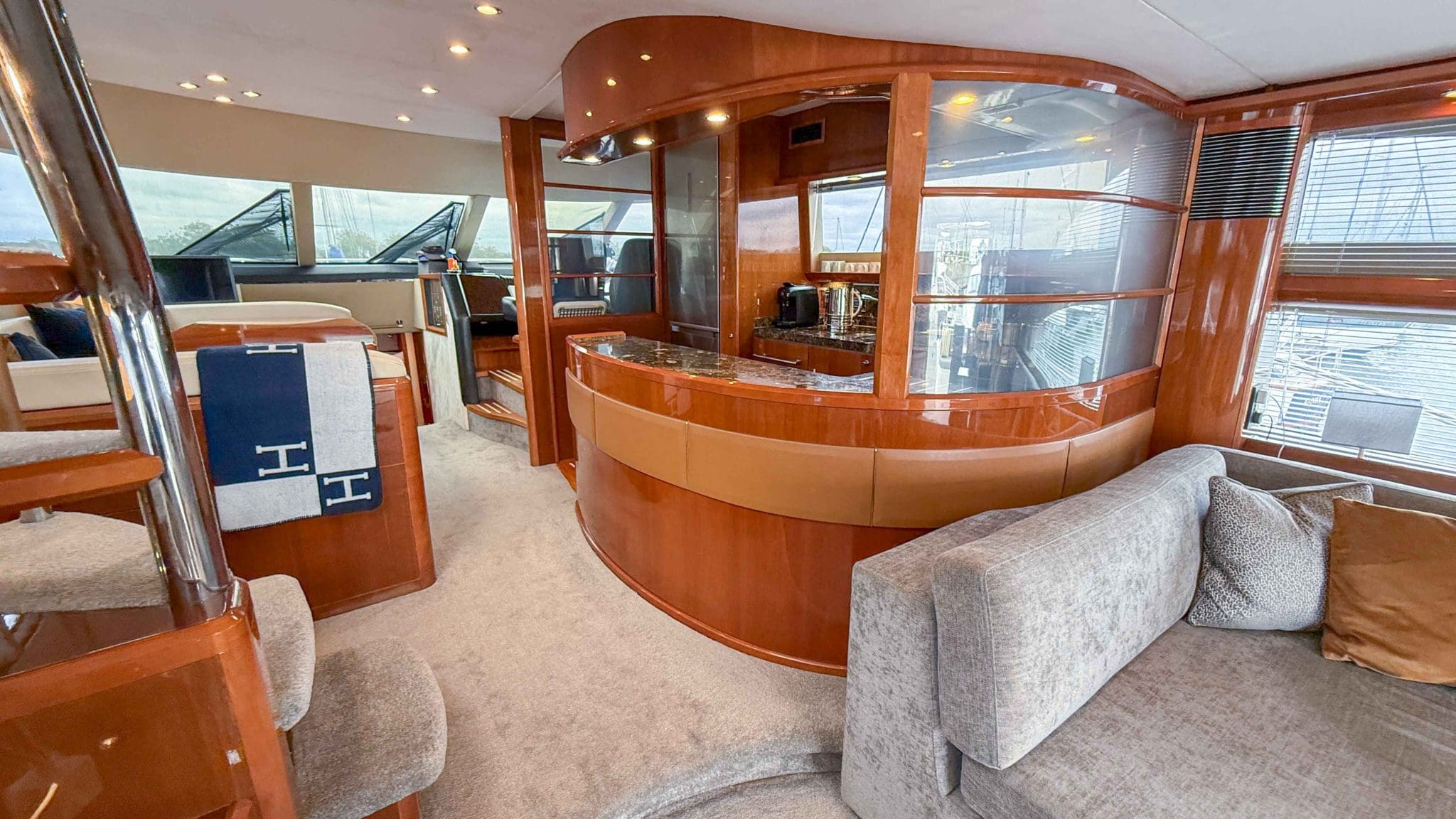 Her interior is finished in high-gloss cherry cabinetry, with granite countertops in the galley and heads. The open-plan saloon, galley, bar, and dinette create a spacious social hub, complete with a custom-built SETAG sofa. The galley is newly equipped (2022) with a full-sized fridge freezer, induction hob, microwave combi oven and dishwasher. A spiral staircase leads to the expansive flybridge, where you’ll find twin helm seats, a large sunpad, a bar with grill, ample seating, dining table, and a tender crane. Triple stainless-steel doors seamlessly connect the salon with the aft cockpit, creating a superb indoor-outdoor living area.