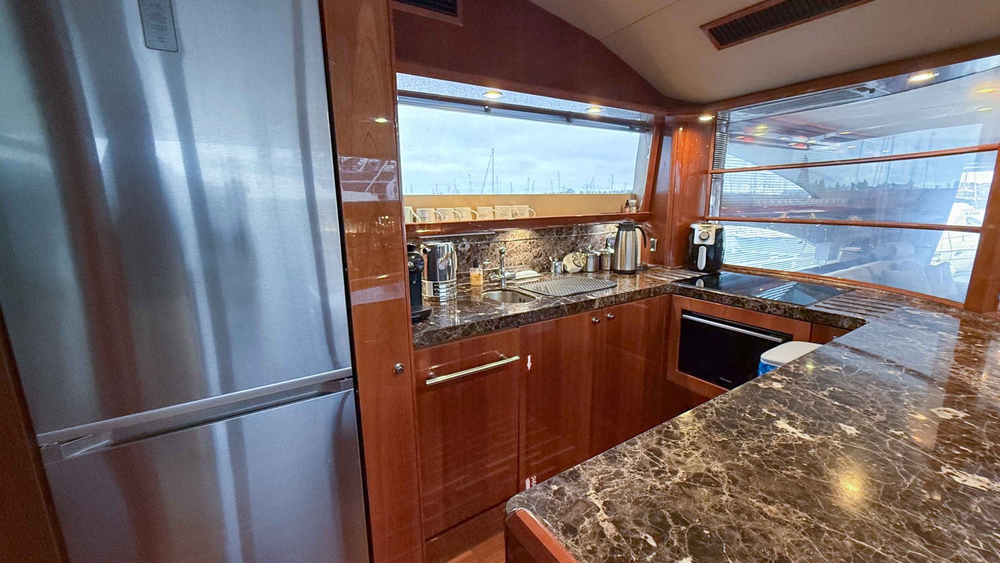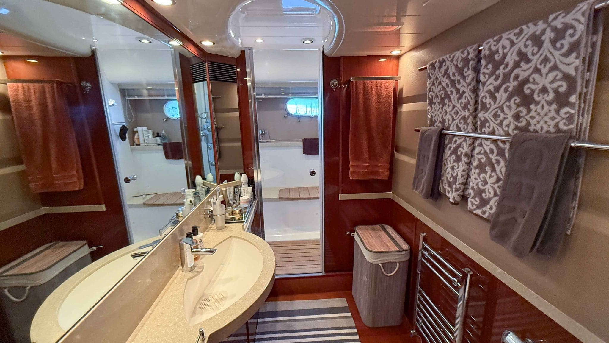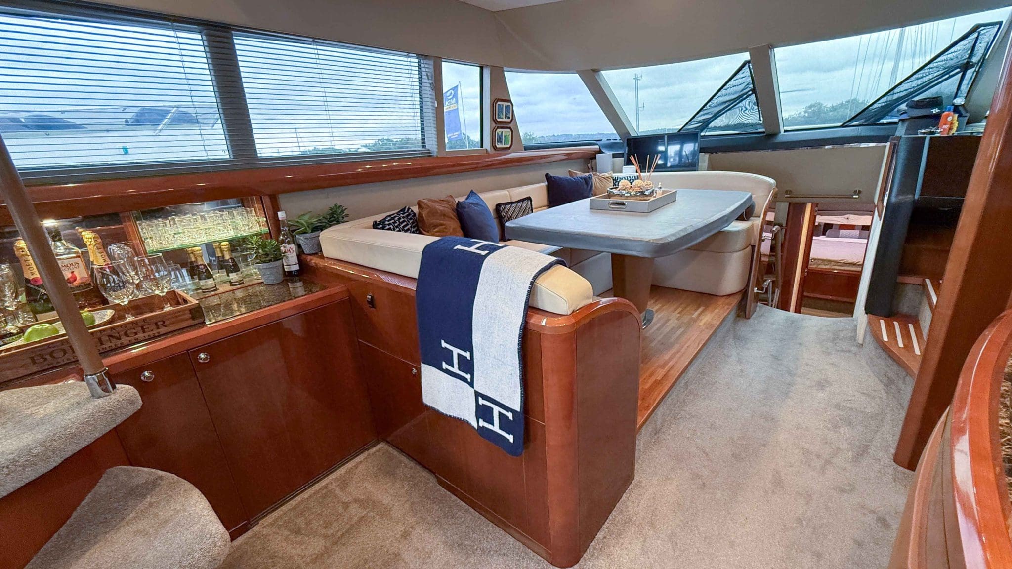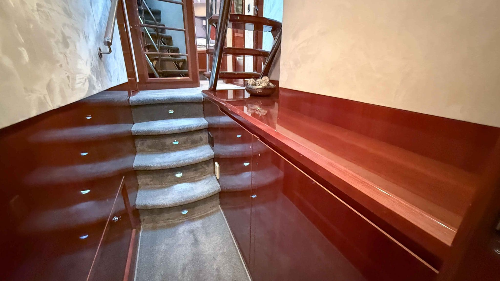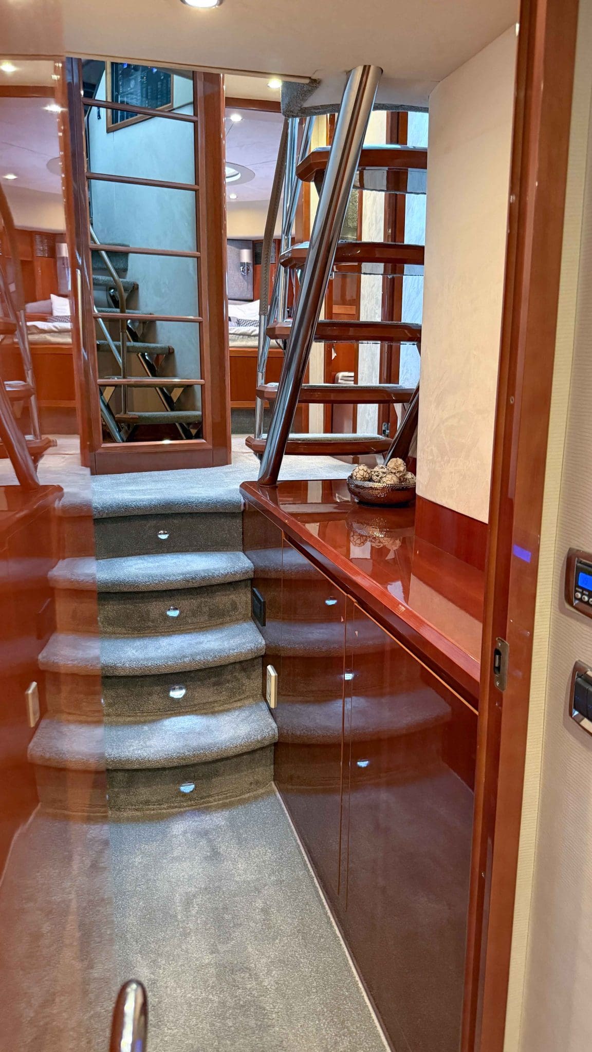 Her interior is finished in high-gloss cherry cabinetry, with granite countertops in the galley and heads. The open-plan saloon, galley, bar, and dinette create a spacious social hub, complete with a custom-built SETAG sofa. The galley is newly equipped (2022) with a full-sized fridge freezer, induction hob, microwave combi oven and dishwasher. A spiral staircase leads to the expansive flybridge, where you’ll find twin helm seats, a large sunpad, a bar with grill, ample seating, dining table, and a tender crane. Triple stainless-steel doors seamlessly connect the salon with the aft cockpit, creating a superb indoor-outdoor living area.