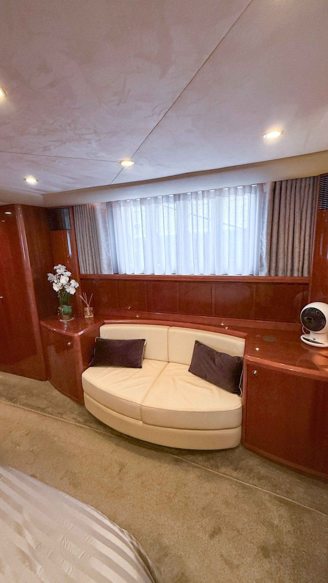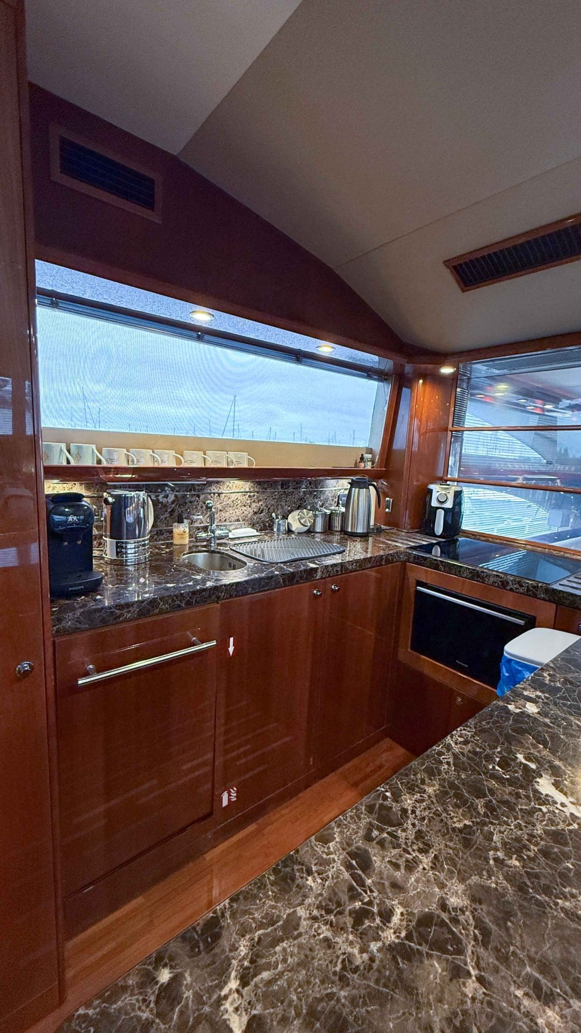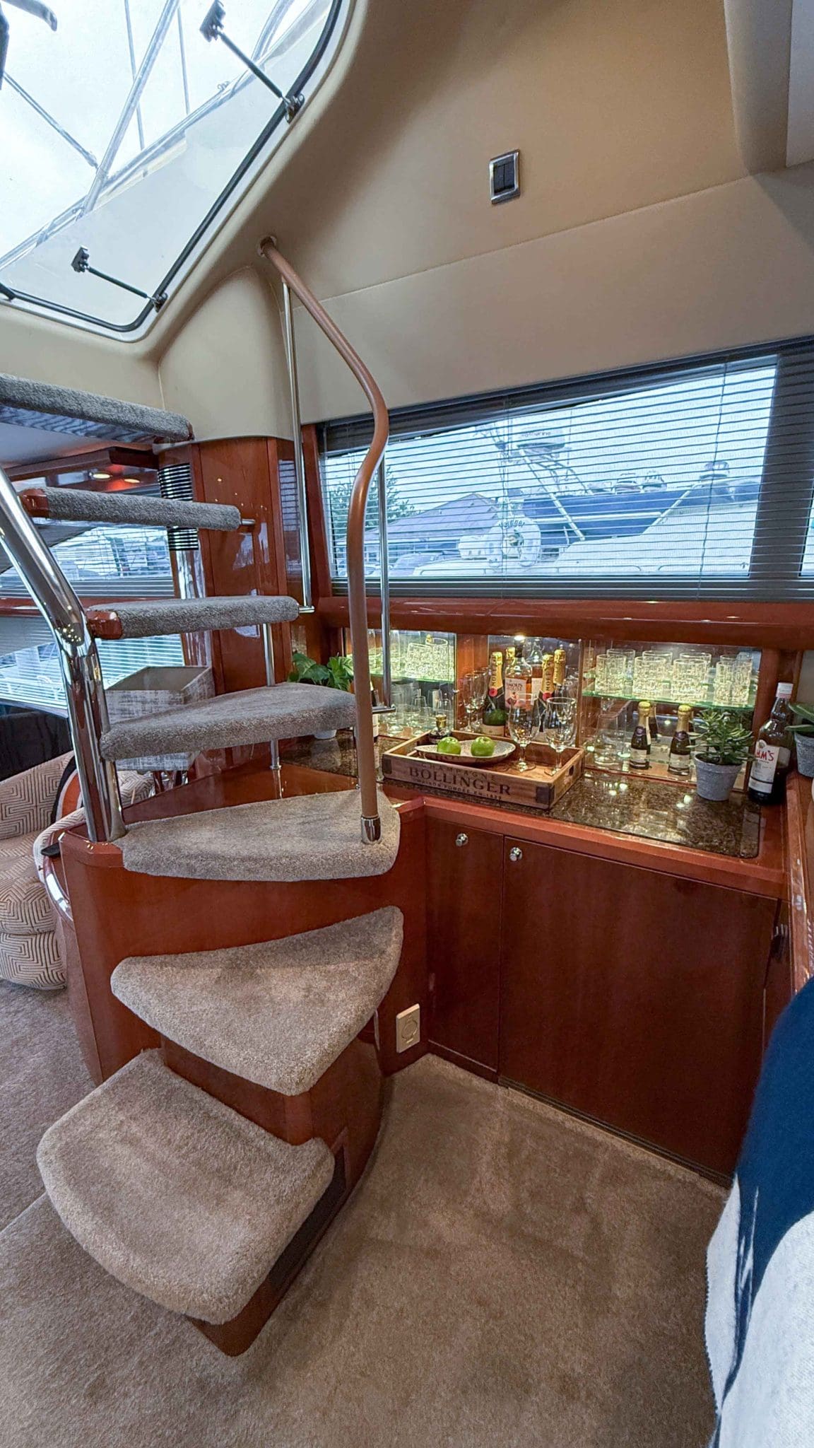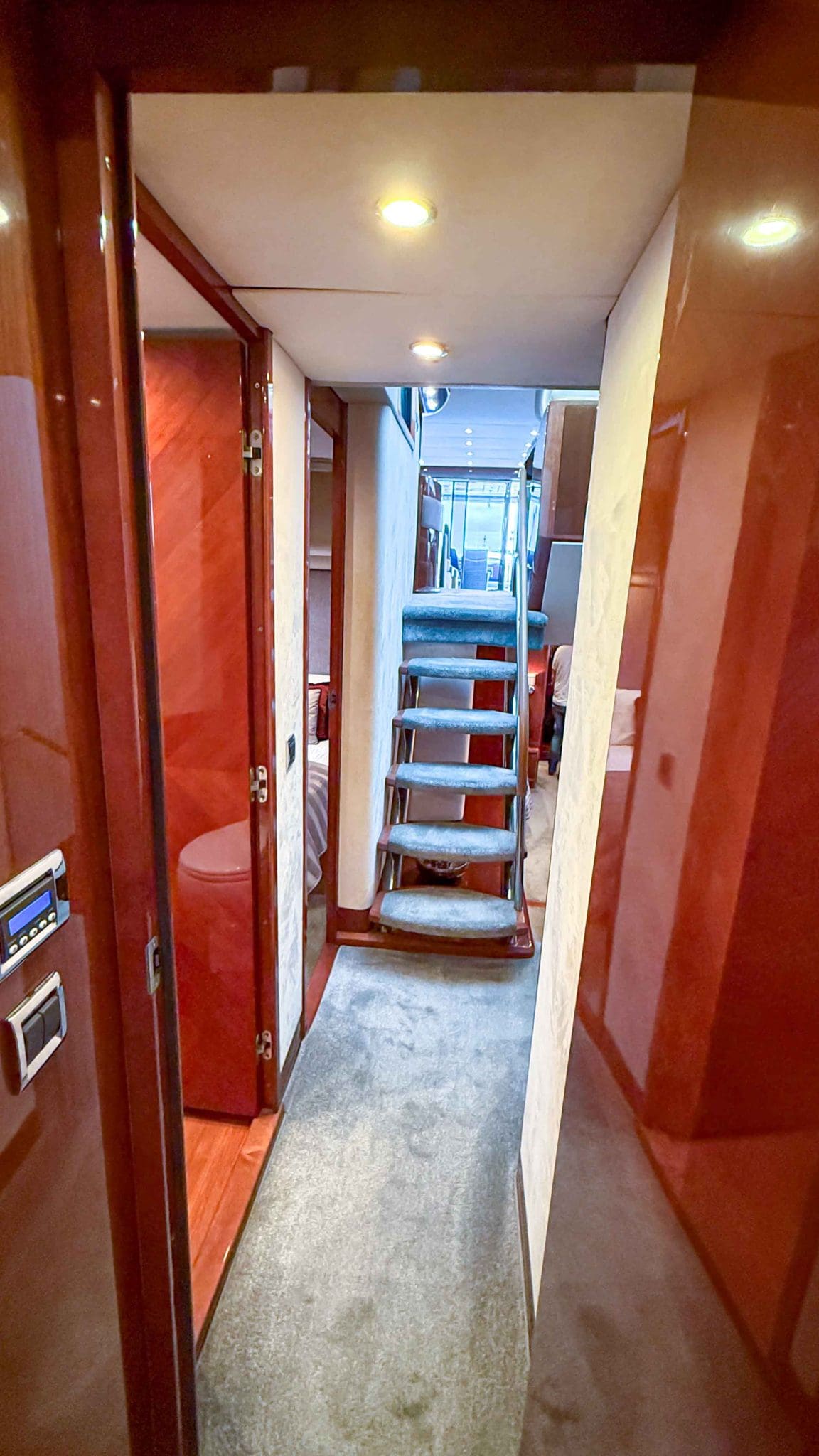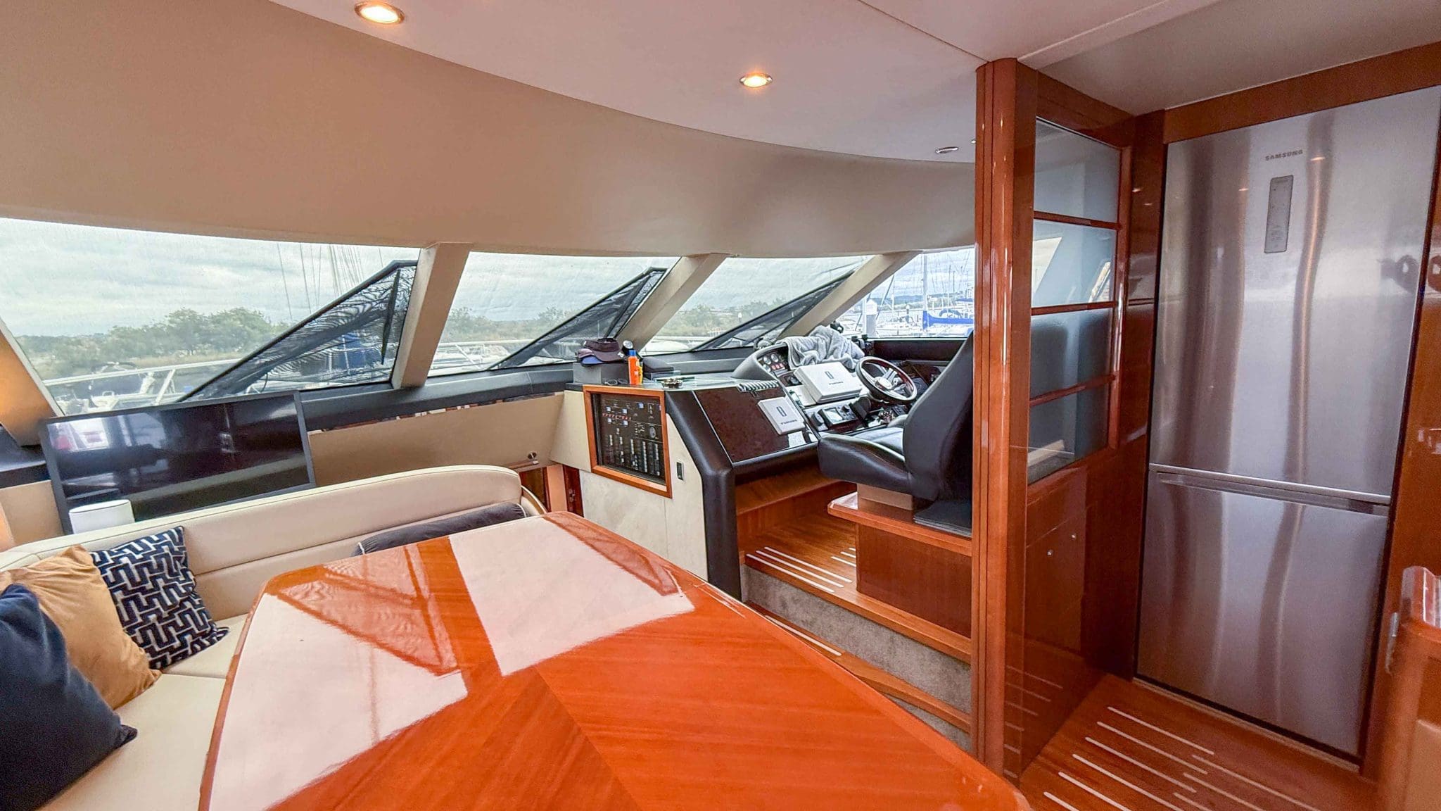 Her interior is finished in high-gloss cherry cabinetry, with granite countertops in the galley and heads. The open-plan saloon, galley, bar, and dinette create a spacious social hub, complete with a custom-built SETAG sofa. The galley is newly equipped (2022) with a full-sized fridge freezer, induction hob, microwave combi oven and dishwasher. A spiral staircase leads to the expansive flybridge, where you’ll find twin helm seats, a large sunpad, a bar with grill, ample seating, dining table, and a tender crane. Triple stainless-steel doors seamlessly connect the salon with the aft cockpit, creating a superb indoor-outdoor living area.