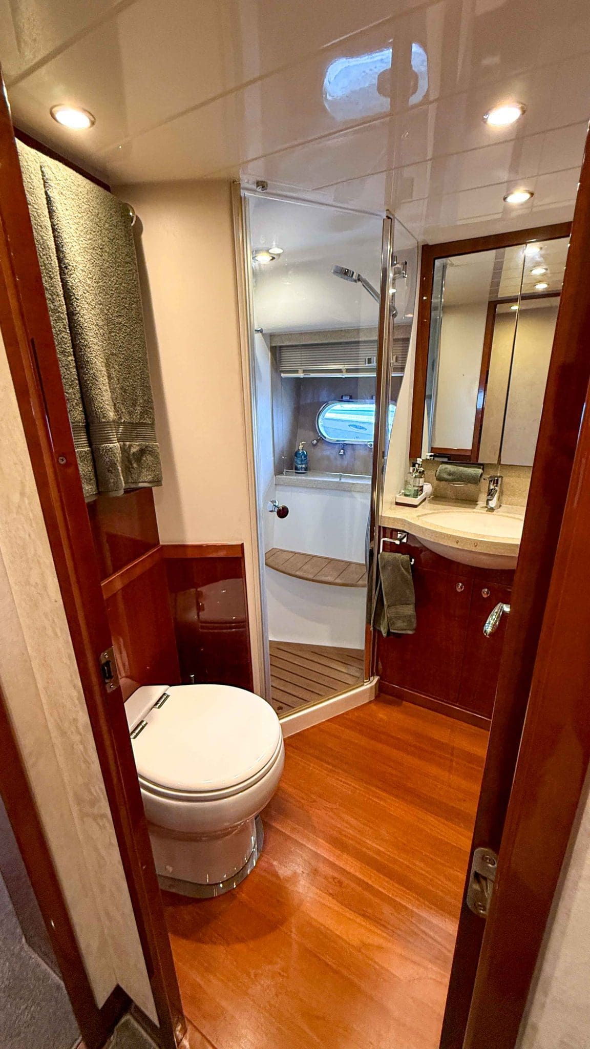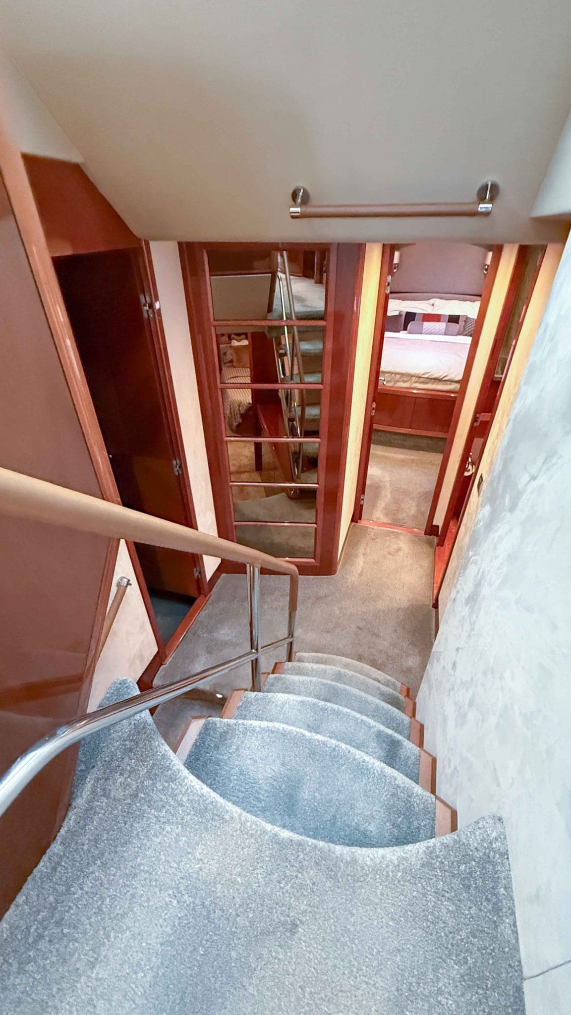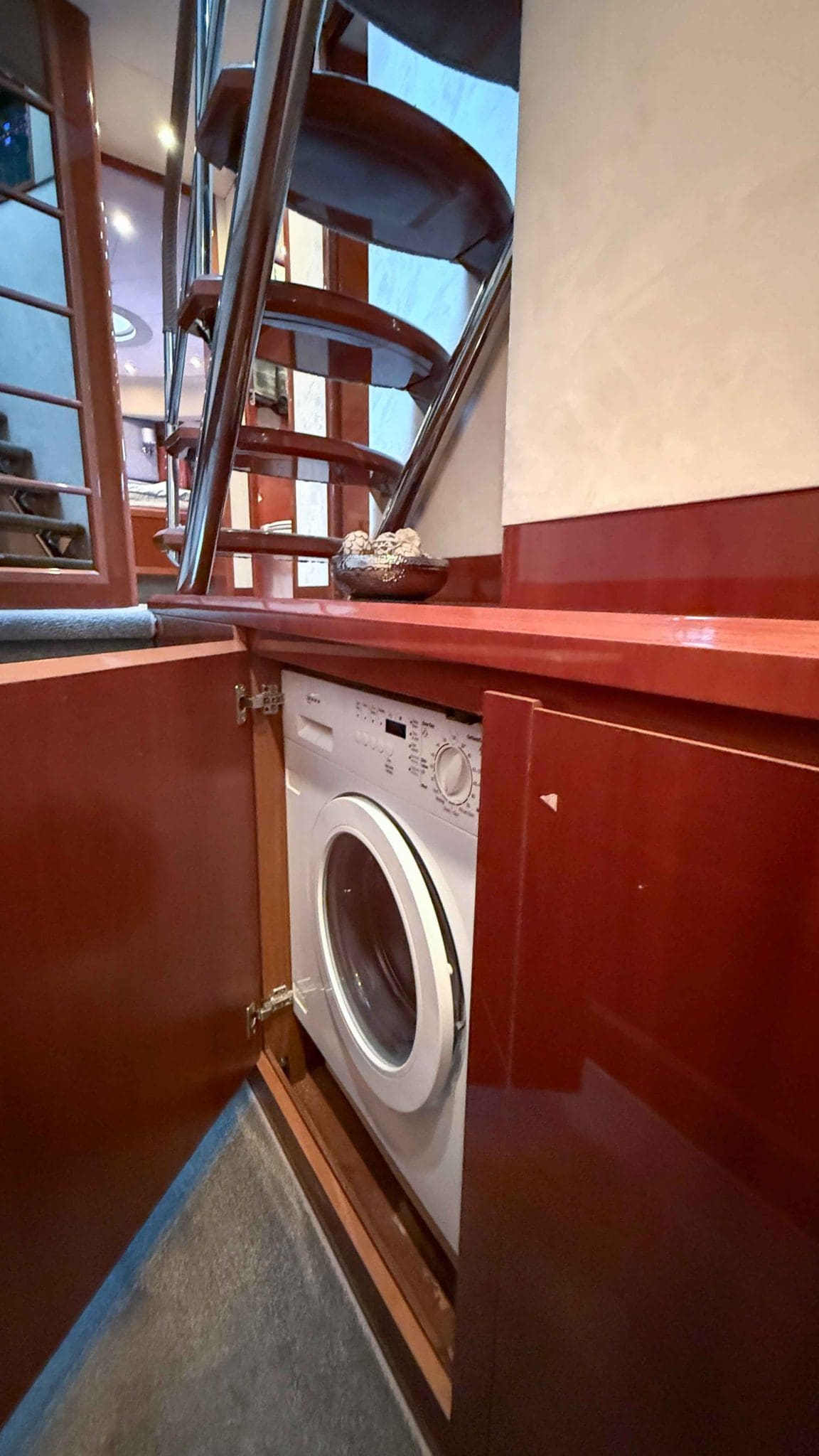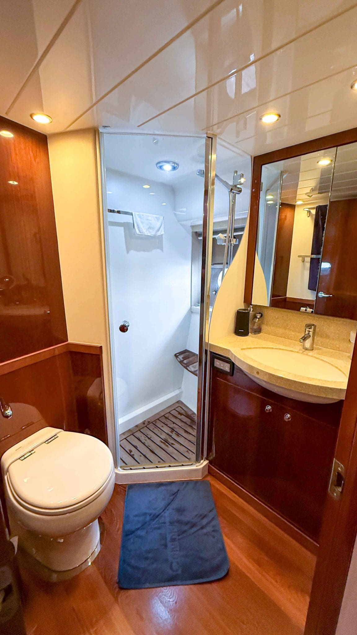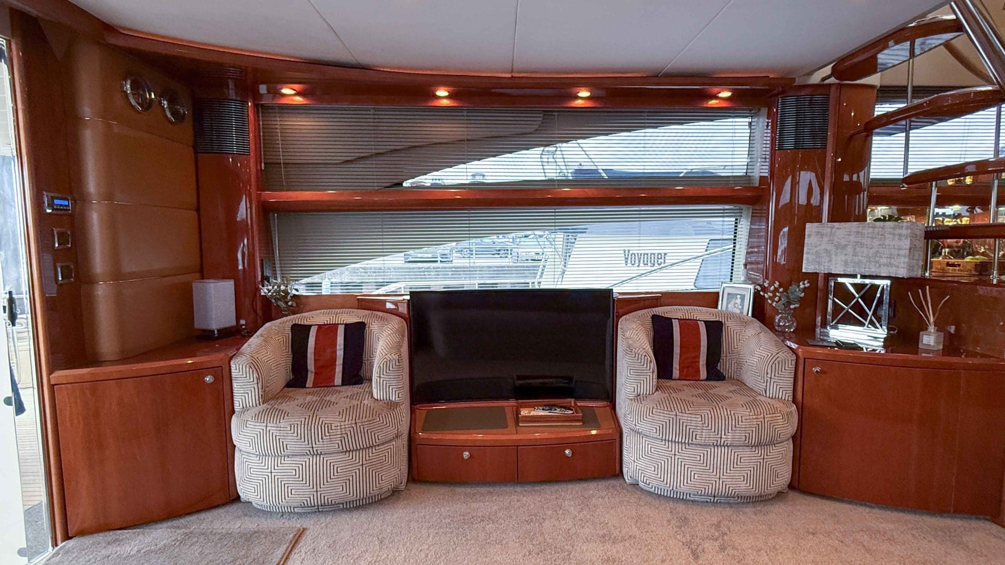 Her interior is finished in high-gloss cherry cabinetry, with granite countertops in the galley and heads. The open-plan saloon, galley, bar, and dinette create a spacious social hub, complete with a custom-built SETAG sofa. The galley is newly equipped (2022) with a full-sized fridge freezer, induction hob, microwave combi oven and dishwasher. A spiral staircase leads to the expansive flybridge, where you’ll find twin helm seats, a large sunpad, a bar with grill, ample seating, dining table, and a tender crane. Triple stainless-steel doors seamlessly connect the salon with the aft cockpit, creating a superb indoor-outdoor living area.