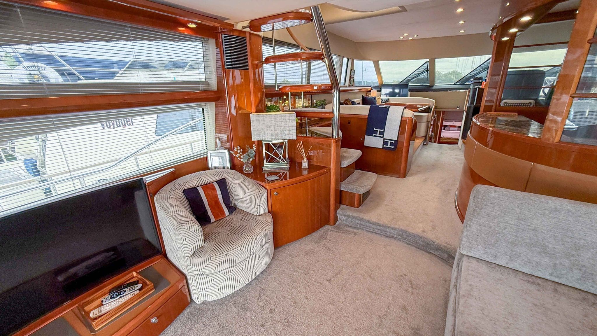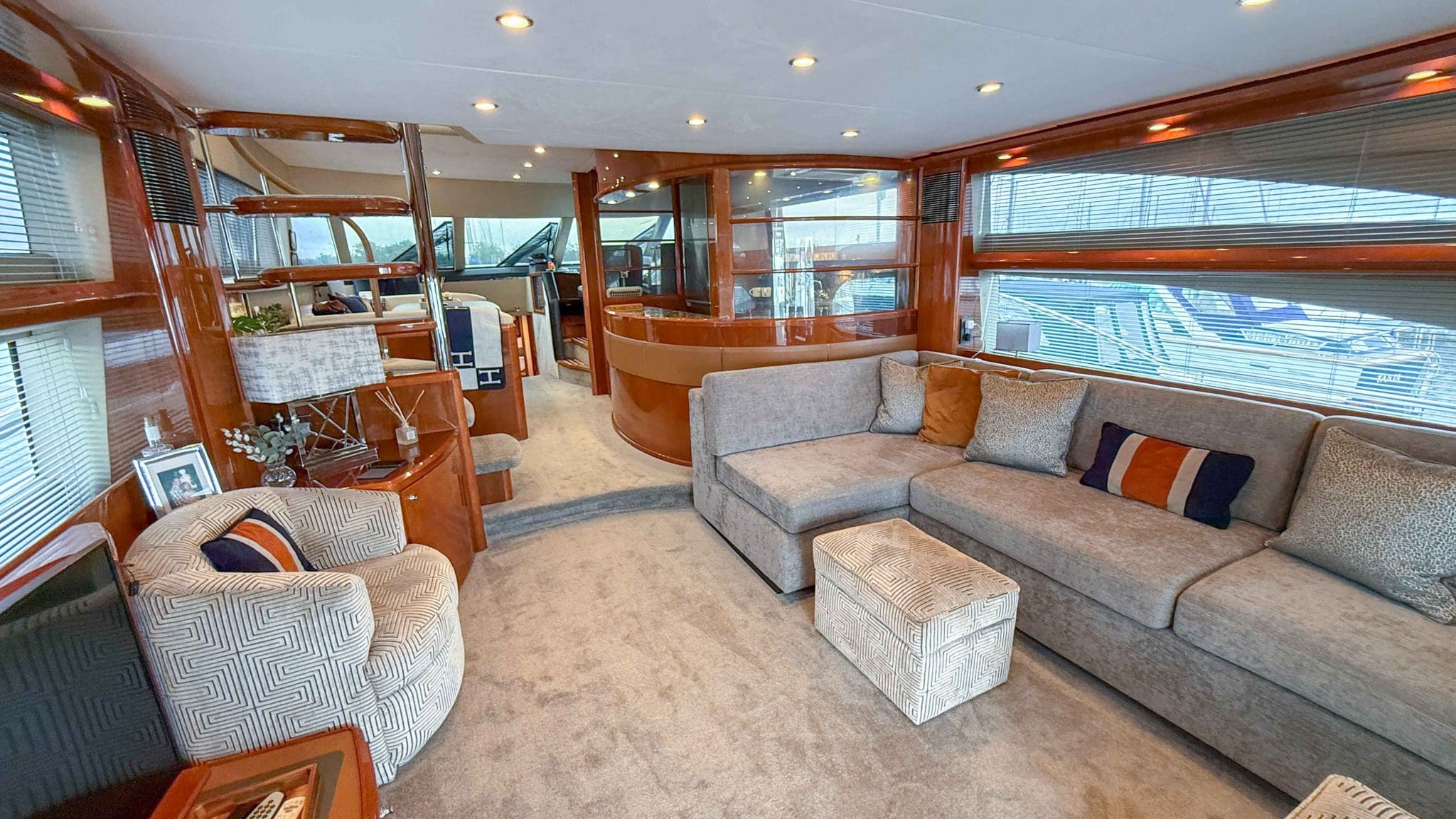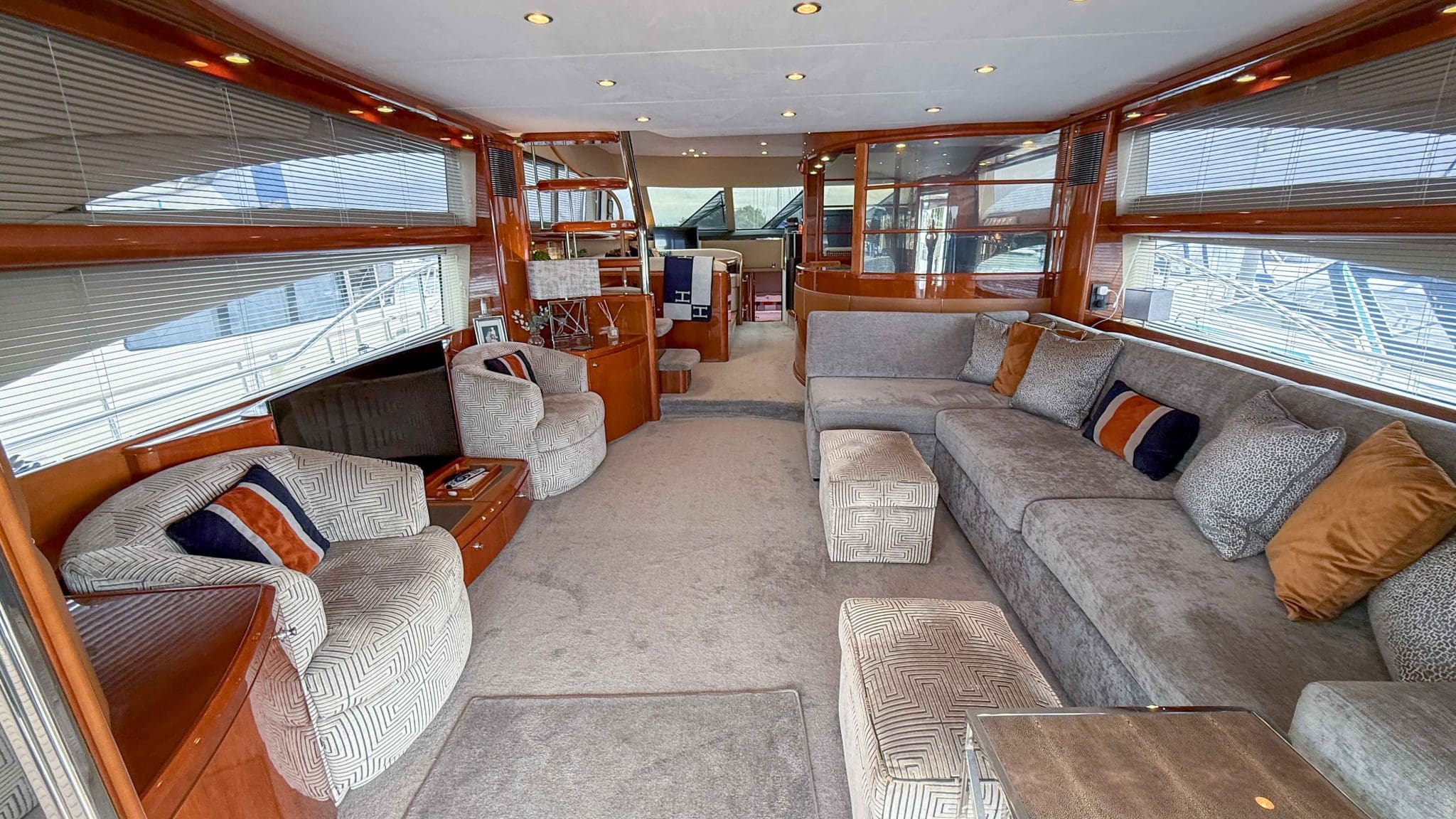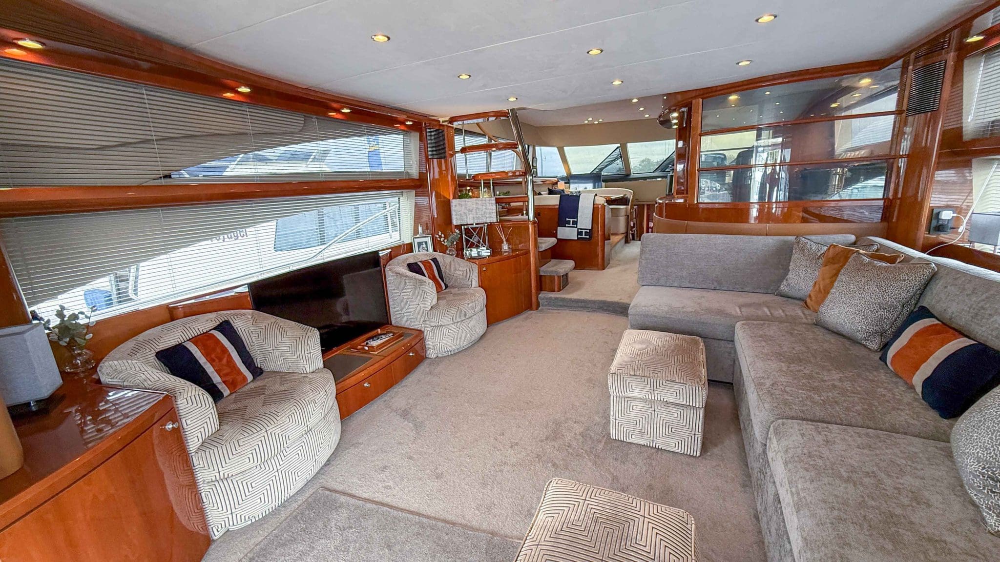A comprehensive program of recent upgrades and refurbishments means she is presented in outstanding condition, both cosmetically and mechanically. She comes fully equipped with Side-Power bow and stern thrusters, a Yacht Controller for effortless handling, Furuno navigation equipment, Lenco trim tabs, and a host of luxury features including a flybridge wet bar with grill, and full teak decks replaced in 2021.
