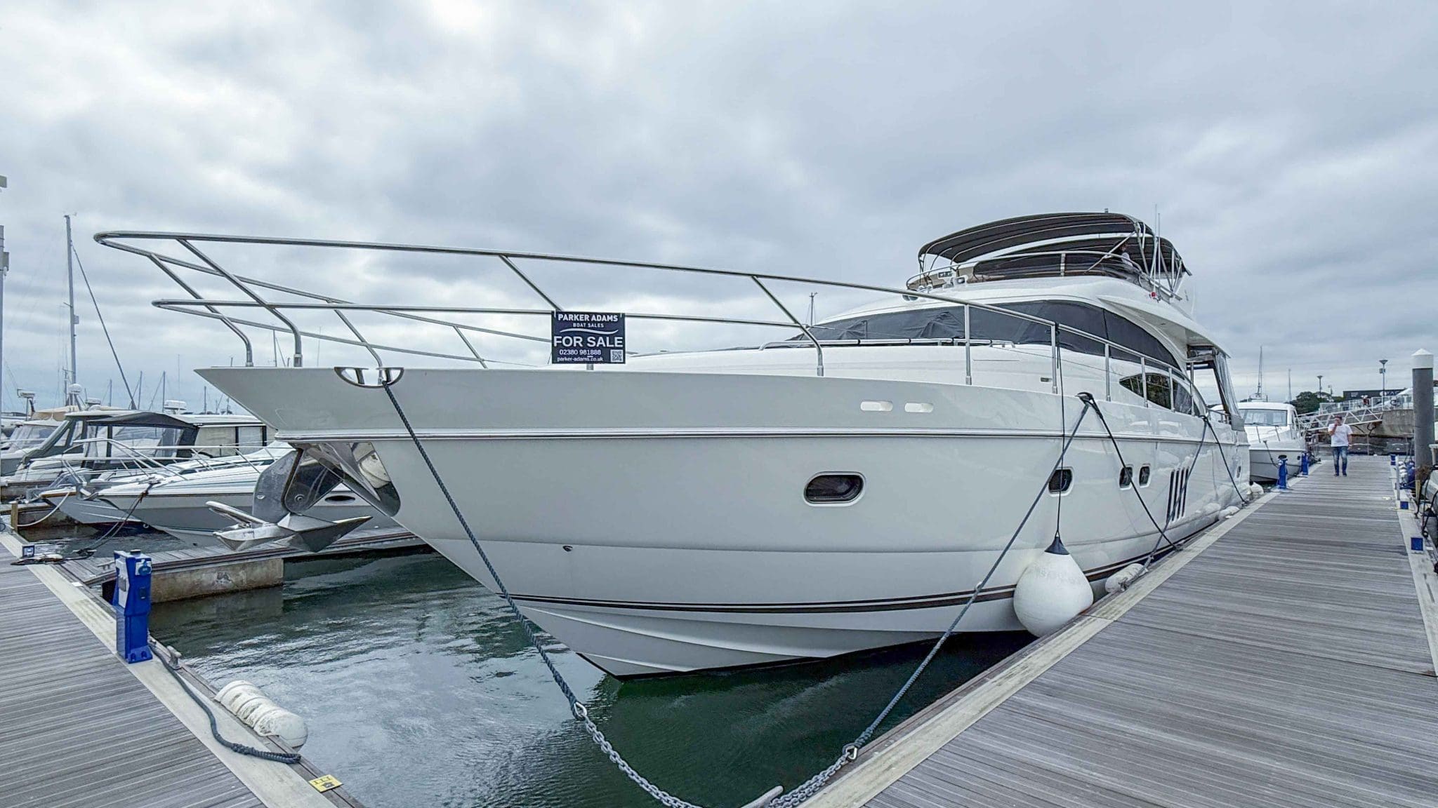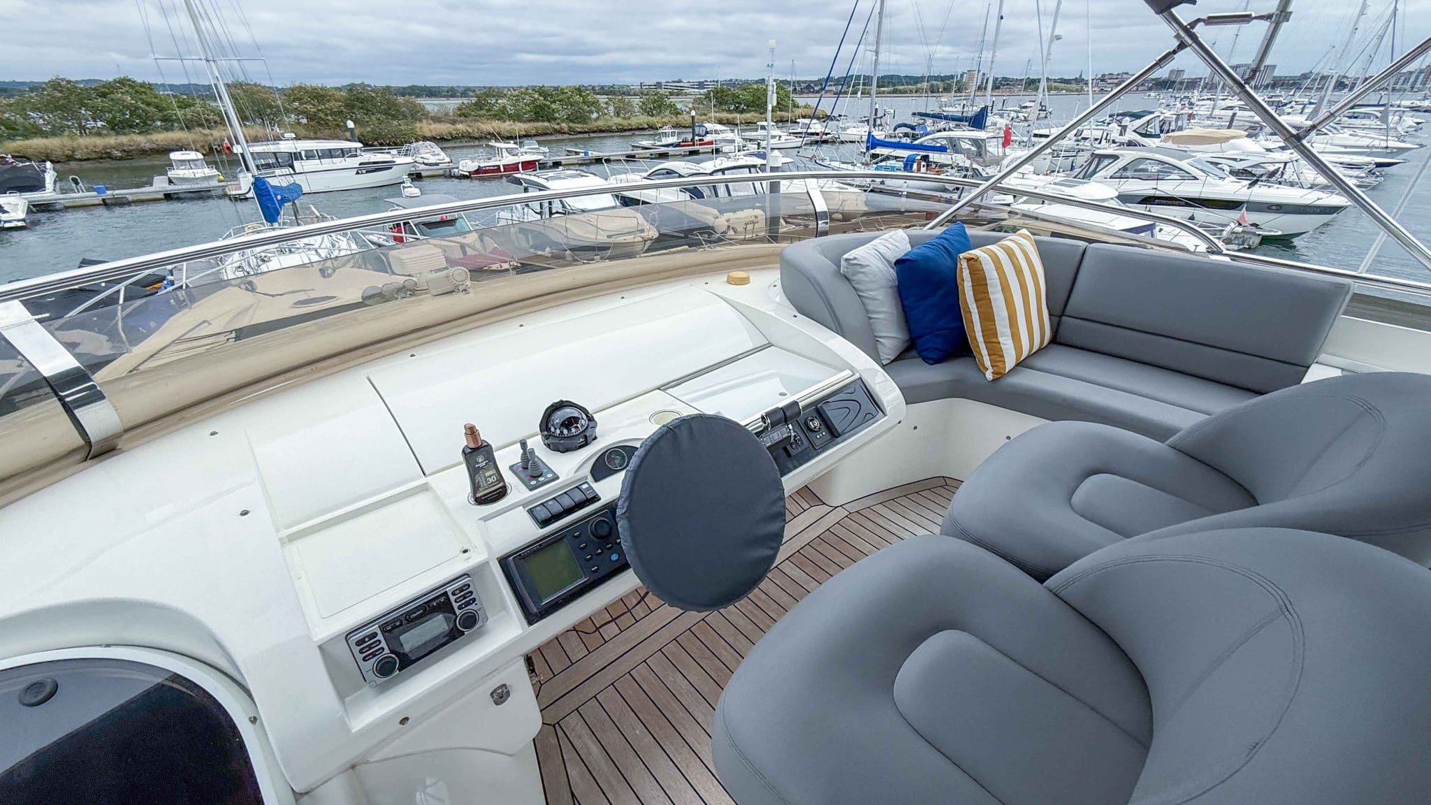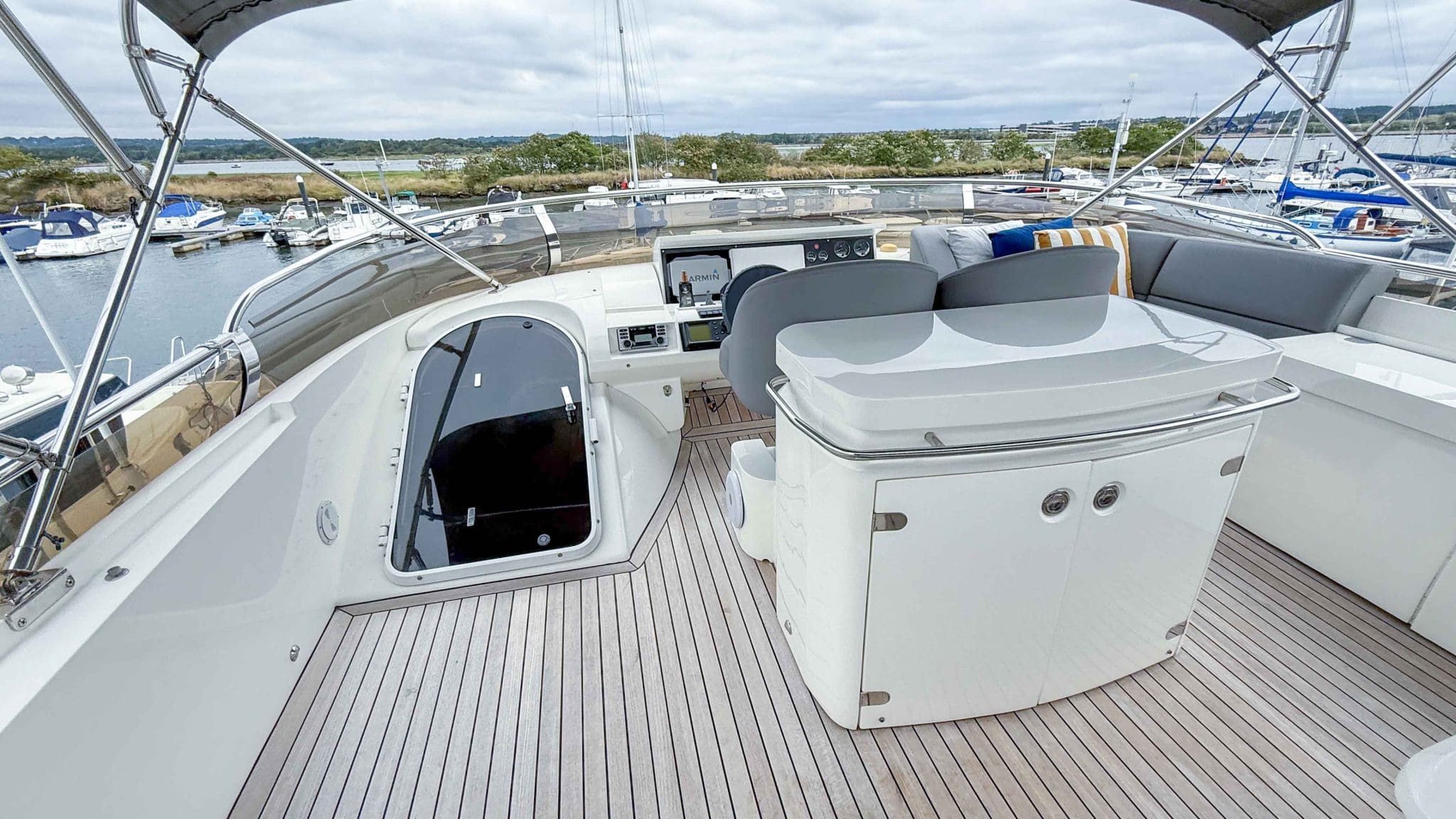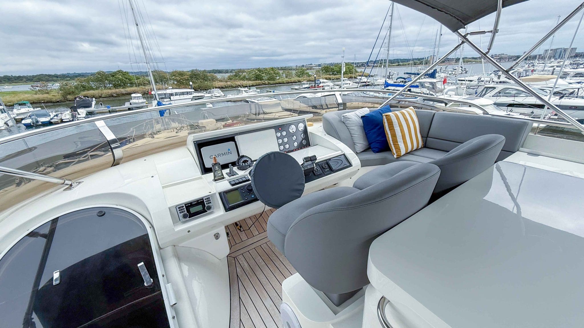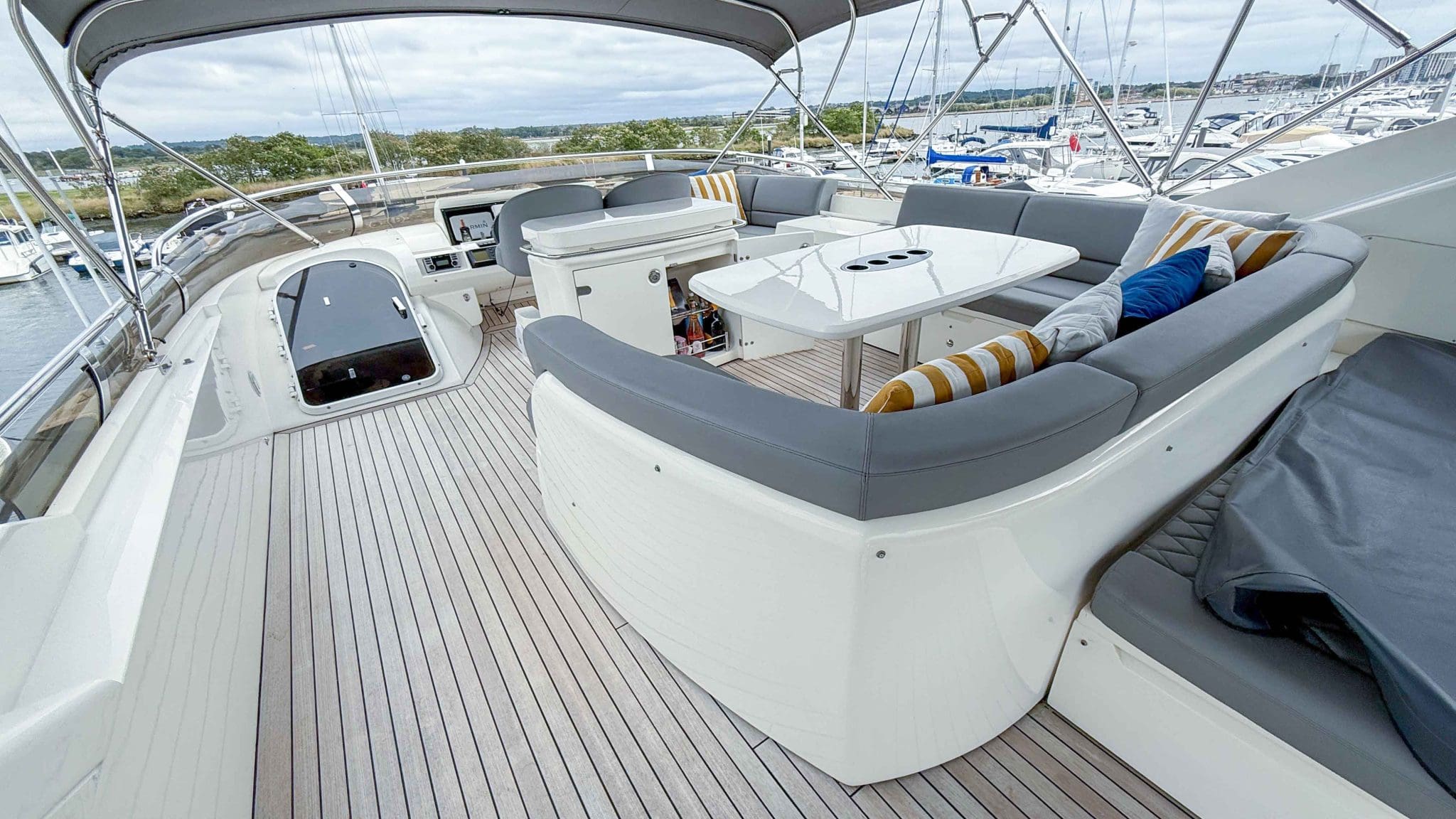 A comprehensive program of recent upgrades and refurbishments means she is presented in outstanding condition, both cosmetically and mechanically. She comes fully equipped with Side-Power bow and stern thrusters, a Yacht Controller for effortless handling, Furuno navigation equipment, Lenco trim tabs, and a host of luxury features including a flybridge wet bar with grill, and full teak decks replaced in 2021.