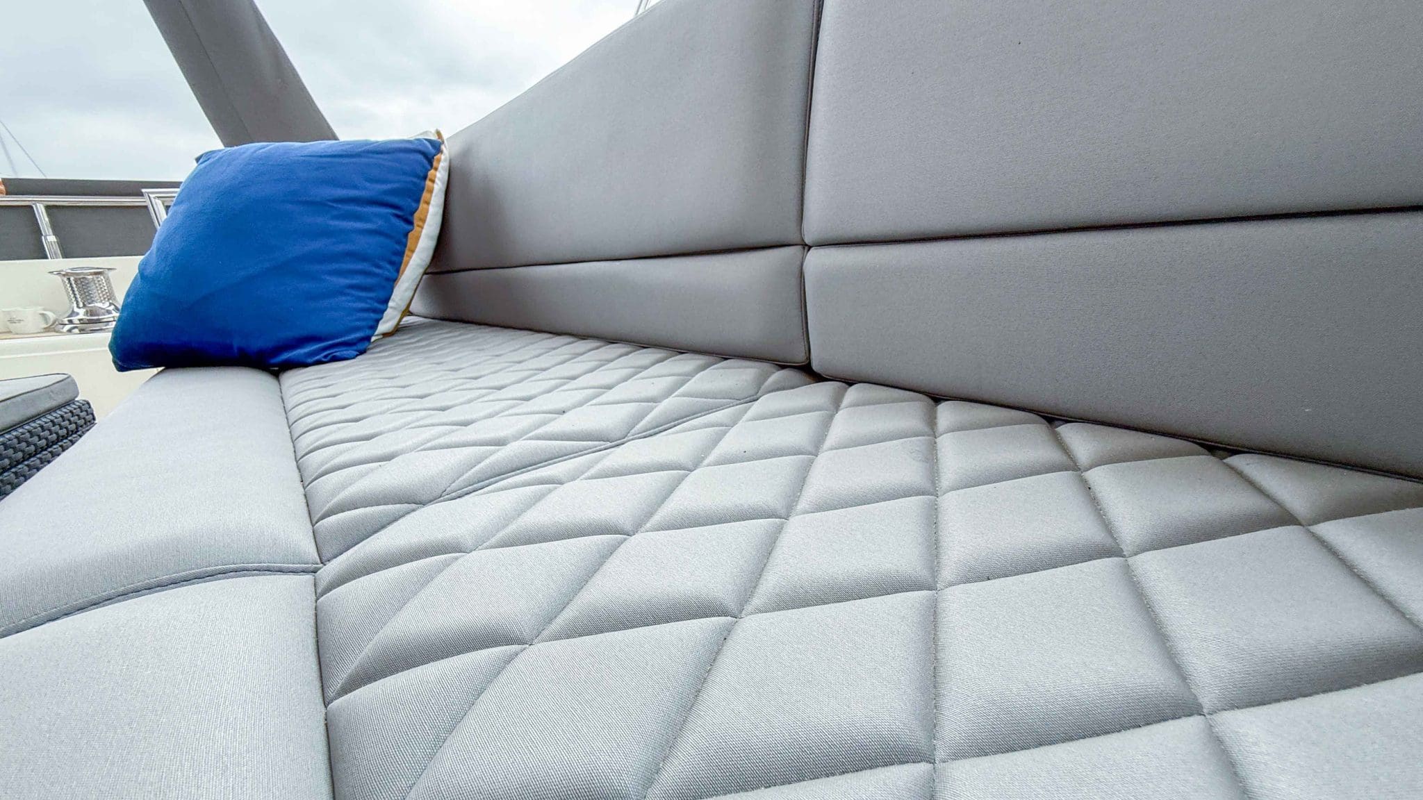 Accommodation is generous, sleeping up to 8 guests across a full-beam master suite, two doubles, and a twin/bunk cabin, in addition to separate crew quarters.